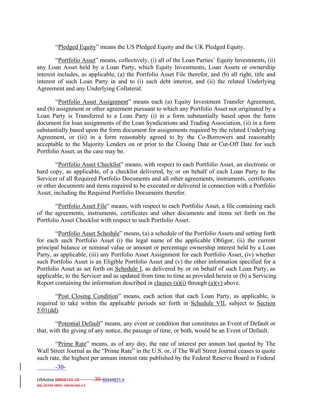 “Pledged Equity” means the US Pledged Equity and the UK Pledged Equity. “Portfolio Asset” means, collectively, (i) all of the Loan Parties’ Equity Investments, (ii) any Loan Asset held by a Loan Party, which Equity Investments, Loan Assets or ownership interest includes, as applicable, (a) the Portfolio Asset File therefor, and (b) all right, title and interest of such Loan Party in and to (i) such debt interest, and (ii) the related Underlying Agreement and any Underlying Collateral. “Portfolio Asset Assignment” means each (a) Equity Investment Transfer Agreement, and (b) assignment or other agreement pursuant to which any Portfolio Asset not originated by a Loan Party is Transferred to a Loan Party (i) in a form substantially based upon the form document for loan assignments of the Loan Syndications and Trading Association, (ii) in a form substantially based upon the form document for assignments required by the related Underlying Agreement, or (iii) in a form reasonably agreed to by the Co‐Borrowers and reasonably acceptable to the Majority Lenders on or prior to the Closing Date or Cut‐Off Date for such Portfolio Asset, as the case may be. “Portfolio Asset Checklist” means, with respect to each Portfolio Asset, an electronic or hard copy, as applicable, of a checklist delivered, by or on behalf of each Loan Party to the Servicer of all Required Portfolio Documents and all other agreements, instruments, certificates or other documents and items required to be executed or delivered in connection with a Portfolio Asset, including the Required Portfolio Documents therefor. “Portfolio Asset File” means, with respect to each Portfolio Asset, a file containing each of the agreements, instruments, certificates and other documents and items set forth on the Portfolio Asset Checklist with respect to such Portfolio Asset. “Portfolio Asset Schedule” means, (a) a schedule of the Portfolio Assets and setting forth for each such Portfolio Asset (i) the legal name of the applicable Obligor, (ii) the current principal balance or nominal value or amount or percentage ownership interest held by a Loan Party, as applicable, (iii) any Portfolio Asset Assignment for each Portfolio Asset, (iv) whether such Portfolio Asset is an Eligible Portfolio Asset and (v) the other information specified for a Portfolio Asset as set forth on Schedule I, as delivered by or on behalf of such Loan Party, as applicable, to the Servicer and as updated from time to time as provided herein or (b) a Servicing Report containing the information described in clauses (a)(i) through (a)(v) above. “Post Closing Condition” means, each action that each Loan Party, as applicable, is required to take within the applicable periods set forth in Schedule VII, subject to Section 5.01(dd). “Potential Default” means, any event or condition that constitutes an Event of Default or that, with the giving of any notice, the passage of time, or both, would be an Event of Default. “Prime Rate” means, as of any day, the rate of interest per annum last quoted by The Wall Street Journal as the “Prime Rate” in the U.S. or, if The Wall Street Journal ceases to quote such rate, the highest per annum interest rate published by the Federal Reserve Board in Federal -30- USActive 58806140.10 -30-60444631.4 SK 28388 0001 10656366 v3