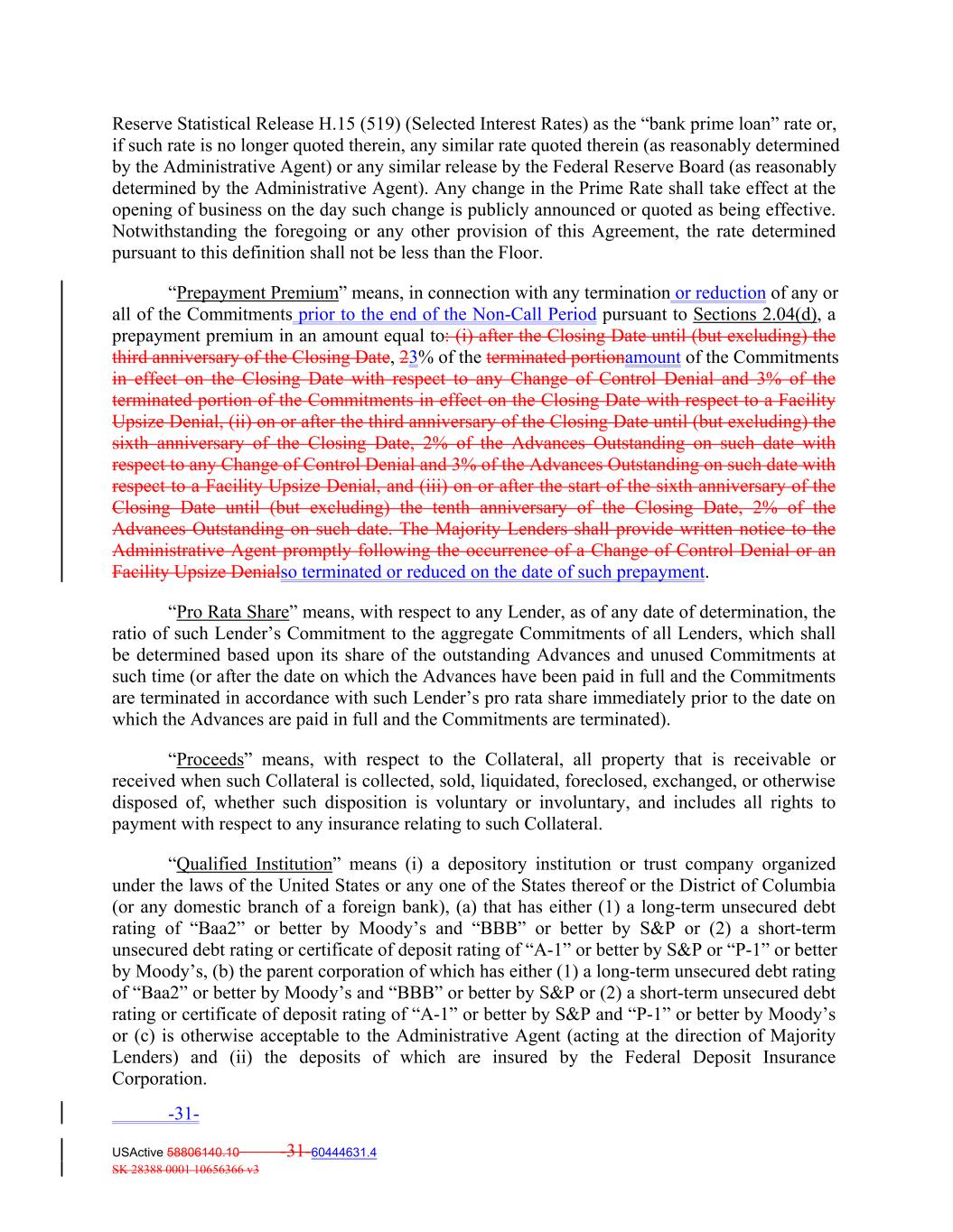 Reserve Statistical Release H.15 (519) (Selected Interest Rates) as the “bank prime loan” rate or, if such rate is no longer quoted therein, any similar rate quoted therein (as reasonably determined by the Administrative Agent) or any similar release by the Federal Reserve Board (as reasonably determined by the Administrative Agent). Any change in the Prime Rate shall take effect at the opening of business on the day such change is publicly announced or quoted as being effective. Notwithstanding the foregoing or any other provision of this Agreement, the rate determined pursuant to this definition shall not be less than the Floor. “Prepayment Premium” means, in connection with any termination or reduction of any or all of the Commitments prior to the end of the Non-Call Period pursuant to Sections 2.04(d), a prepayment premium in an amount equal to: (i) after the Closing Date until (but excluding) the third anniversary of the Closing Date, 23% of the terminated portionamount of the Commitments in effect on the Closing Date with respect to any Change of Control Denial and 3% of the terminated portion of the Commitments in effect on the Closing Date with respect to a Facility Upsize Denial, (ii) on or after the third anniversary of the Closing Date until (but excluding) the sixth anniversary of the Closing Date, 2% of the Advances Outstanding on such date with respect to any Change of Control Denial and 3% of the Advances Outstanding on such date with respect to a Facility Upsize Denial, and (iii) on or after the start of the sixth anniversary of the Closing Date until (but excluding) the tenth anniversary of the Closing Date, 2% of the Advances Outstanding on such date. The Majority Lenders shall provide written notice to the Administrative Agent promptly following the occurrence of a Change of Control Denial or an Facility Upsize Denialso terminated or reduced on the date of such prepayment. “Pro Rata Share” means, with respect to any Lender, as of any date of determination, the ratio of such Lender’s Commitment to the aggregate Commitments of all Lenders, which shall be determined based upon its share of the outstanding Advances and unused Commitments at such time (or after the date on which the Advances have been paid in full and the Commitments are terminated in accordance with such Lender’s pro rata share immediately prior to the date on which the Advances are paid in full and the Commitments are terminated). “Proceeds” means, with respect to the Collateral, all property that is receivable or received when such Collateral is collected, sold, liquidated, foreclosed, exchanged, or otherwise disposed of, whether such disposition is voluntary or involuntary, and includes all rights to payment with respect to any insurance relating to such Collateral. “Qualified Institution” means (i) a depository institution or trust company organized under the laws of the United States or any one of the States thereof or the District of Columbia (or any domestic branch of a foreign bank), (a) that has either (1) a long‐term unsecured debt rating of “Baa2” or better by Moody’s and “BBB” or better by S&P or (2) a short‐term unsecured debt rating or certificate of deposit rating of “A‐1” or better by S&P or “P‐1” or better by Moody’s, (b) the parent corporation of which has either (1) a long‐term unsecured debt rating of “Baa2” or better by Moody’s and “BBB” or better by S&P or (2) a short‐term unsecured debt rating or certificate of deposit rating of “A‐1” or better by S&P and “P‐1” or better by Moody’s or (c) is otherwise acceptable to the Administrative Agent (acting at the direction of Majority Lenders) and (ii) the deposits of which are insured by the Federal Deposit Insurance Corporation. -31- USActive 58806140.10 -31-60444631.4 SK 28388 0001 10656366 v3