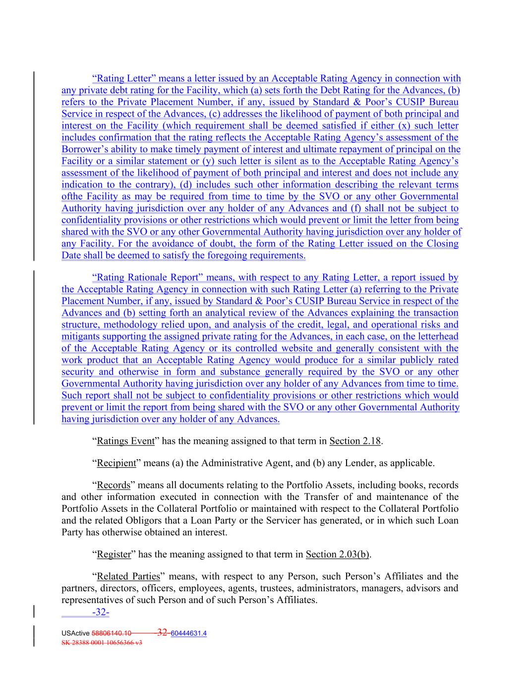 “Rating Letter” means a letter issued by an Acceptable Rating Agency in connection with any private debt rating for the Facility, which (a) sets forth the Debt Rating for the Advances, (b) refers to the Private Placement Number, if any, issued by Standard & Poor’s CUSIP Bureau Service in respect of the Advances, (c) addresses the likelihood of payment of both principal and interest on the Facility (which requirement shall be deemed satisfied if either (x) such letter includes confirmation that the rating reflects the Acceptable Rating Agency’s assessment of the Borrower’s ability to make timely payment of interest and ultimate repayment of principal on the Facility or a similar statement or (y) such letter is silent as to the Acceptable Rating Agency’s assessment of the likelihood of payment of both principal and interest and does not include any indication to the contrary), (d) includes such other information describing the relevant terms ofthe Facility as may be required from time to time by the SVO or any other Governmental Authority having jurisdiction over any holder of any Advances and (f) shall not be subject to confidentiality provisions or other restrictions which would prevent or limit the letter from being shared with the SVO or any other Governmental Authority having jurisdiction over any holder of any Facility. For the avoidance of doubt, the form of the Rating Letter issued on the Closing Date shall be deemed to satisfy the foregoing requirements. “Rating Rationale Report” means, with respect to any Rating Letter, a report issued by the Acceptable Rating Agency in connection with such Rating Letter (a) referring to the Private Placement Number, if any, issued by Standard & Poor’s CUSIP Bureau Service in respect of the Advances and (b) setting forth an analytical review of the Advances explaining the transaction structure, methodology relied upon, and analysis of the credit, legal, and operational risks and mitigants supporting the assigned private rating for the Advances, in each case, on the letterhead of the Acceptable Rating Agency or its controlled website and generally consistent with the work product that an Acceptable Rating Agency would produce for a similar publicly rated security and otherwise in form and substance generally required by the SVO or any other Governmental Authority having jurisdiction over any holder of any Advances from time to time. Such report shall not be subject to confidentiality provisions or other restrictions which would prevent or limit the report from being shared with the SVO or any other Governmental Authority having jurisdiction over any holder of any Advances. “Ratings Event” has the meaning assigned to that term in Section 2.18. “Recipient” means (a) the Administrative Agent, and (b) any Lender, as applicable. “Records” means all documents relating to the Portfolio Assets, including books, records and other information executed in connection with the Transfer of and maintenance of the Portfolio Assets in the Collateral Portfolio or maintained with respect to the Collateral Portfolio and the related Obligors that a Loan Party or the Servicer has generated, or in which such Loan Party has otherwise obtained an interest. “Register” has the meaning assigned to that term in Section 2.03(b). “Related Parties” means, with respect to any Person, such Person’s Affiliates and the partners, directors, officers, employees, agents, trustees, administrators, managers, advisors and representatives of such Person and of such Person’s Affiliates. -32- USActive 58806140.10 -32-60444631.4 SK 28388 0001 10656366 v3