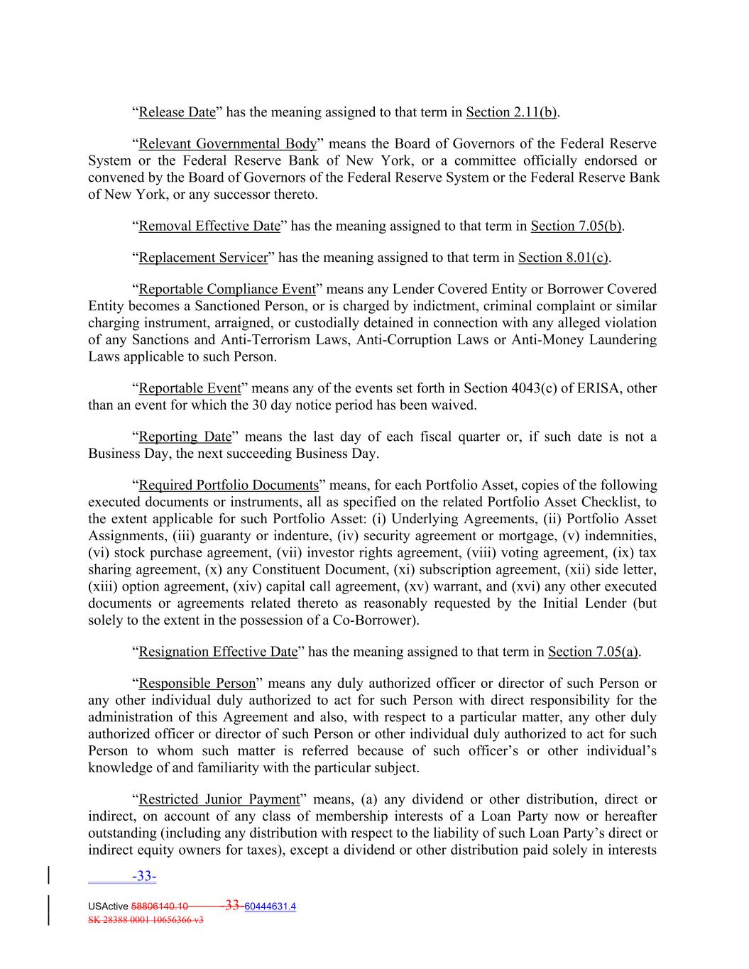 “Release Date” has the meaning assigned to that term in Section 2.11(b). “Relevant Governmental Body” means the Board of Governors of the Federal Reserve System or the Federal Reserve Bank of New York, or a committee officially endorsed or convened by the Board of Governors of the Federal Reserve System or the Federal Reserve Bank of New York, or any successor thereto. “Removal Effective Date” has the meaning assigned to that term in Section 7.05(b). “Replacement Servicer” has the meaning assigned to that term in Section 8.01(c). “Reportable Compliance Event” means any Lender Covered Entity or Borrower Covered Entity becomes a Sanctioned Person, or is charged by indictment, criminal complaint or similar charging instrument, arraigned, or custodially detained in connection with any alleged violation of any Sanctions and Anti‐Terrorism Laws, Anti‐Corruption Laws or Anti‐Money Laundering Laws applicable to such Person. “Reportable Event” means any of the events set forth in Section 4043(c) of ERISA, other than an event for which the 30 day notice period has been waived. “Reporting Date” means the last day of each fiscal quarter or, if such date is not a Business Day, the next succeeding Business Day. “Required Portfolio Documents” means, for each Portfolio Asset, copies of the following executed documents or instruments, all as specified on the related Portfolio Asset Checklist, to the extent applicable for such Portfolio Asset: (i) Underlying Agreements, (ii) Portfolio Asset Assignments, (iii) guaranty or indenture, (iv) security agreement or mortgage, (v) indemnities, (vi) stock purchase agreement, (vii) investor rights agreement, (viii) voting agreement, (ix) tax sharing agreement, (x) any Constituent Document, (xi) subscription agreement, (xii) side letter, (xiii) option agreement, (xiv) capital call agreement, (xv) warrant, and (xvi) any other executed documents or agreements related thereto as reasonably requested by the Initial Lender (but solely to the extent in the possession of a Co‐Borrower). “Resignation Effective Date” has the meaning assigned to that term in Section 7.05(a). “Responsible Person” means any duly authorized officer or director of such Person or any other individual duly authorized to act for such Person with direct responsibility for the administration of this Agreement and also, with respect to a particular matter, any other duly authorized officer or director of such Person or other individual duly authorized to act for such Person to whom such matter is referred because of such officer’s or other individual’s knowledge of and familiarity with the particular subject. “Restricted Junior Payment” means, (a) any dividend or other distribution, direct or indirect, on account of any class of membership interests of a Loan Party now or hereafter outstanding (including any distribution with respect to the liability of such Loan Party’s direct or indirect equity owners for taxes), except a dividend or other distribution paid solely in interests -33- USActive 58806140.10 -33-60444631.4 SK 28388 0001 10656366 v3