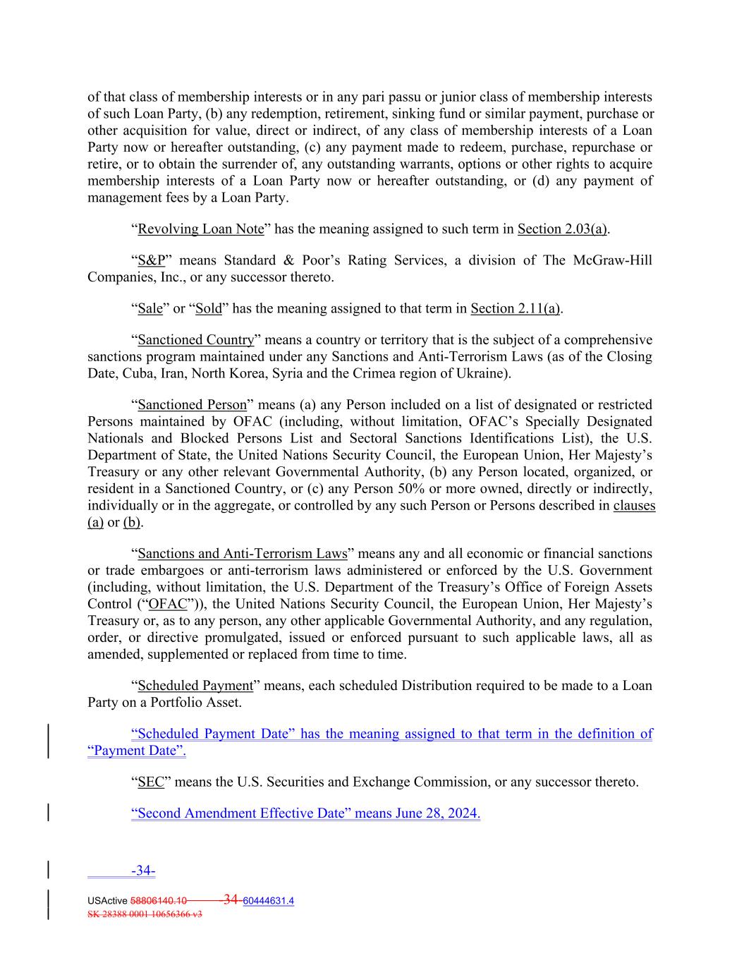 of that class of membership interests or in any pari passu or junior class of membership interests of such Loan Party, (b) any redemption, retirement, sinking fund or similar payment, purchase or other acquisition for value, direct or indirect, of any class of membership interests of a Loan Party now or hereafter outstanding, (c) any payment made to redeem, purchase, repurchase or retire, or to obtain the surrender of, any outstanding warrants, options or other rights to acquire membership interests of a Loan Party now or hereafter outstanding, or (d) any payment of management fees by a Loan Party. “Revolving Loan Note” has the meaning assigned to such term in Section 2.03(a). “S&P” means Standard & Poor’s Rating Services, a division of The McGraw‐Hill Companies, Inc., or any successor thereto. “Sale” or “Sold” has the meaning assigned to that term in Section 2.11(a). “Sanctioned Country” means a country or territory that is the subject of a comprehensive sanctions program maintained under any Sanctions and Anti‐Terrorism Laws (as of the Closing Date, Cuba, Iran, North Korea, Syria and the Crimea region of Ukraine). “Sanctioned Person” means (a) any Person included on a list of designated or restricted Persons maintained by OFAC (including, without limitation, OFAC’s Specially Designated Nationals and Blocked Persons List and Sectoral Sanctions Identifications List), the U.S. Department of State, the United Nations Security Council, the European Union, Her Majesty’s Treasury or any other relevant Governmental Authority, (b) any Person located, organized, or resident in a Sanctioned Country, or (c) any Person 50% or more owned, directly or indirectly, individually or in the aggregate, or controlled by any such Person or Persons described in clauses (a) or (b). “Sanctions and Anti‐Terrorism Laws” means any and all economic or financial sanctions or trade embargoes or anti‐terrorism laws administered or enforced by the U.S. Government (including, without limitation, the U.S. Department of the Treasury’s Office of Foreign Assets Control (“OFAC”)), the United Nations Security Council, the European Union, Her Majesty’s Treasury or, as to any person, any other applicable Governmental Authority, and any regulation, order, or directive promulgated, issued or enforced pursuant to such applicable laws, all as amended, supplemented or replaced from time to time. “Scheduled Payment” means, each scheduled Distribution required to be made to a Loan Party on a Portfolio Asset. “Scheduled Payment Date” has the meaning assigned to that term in the definition of “Payment Date”. “SEC” means the U.S. Securities and Exchange Commission, or any successor thereto. “Second Amendment Effective Date” means June 28, 2024. -34- USActive 58806140.10 -34-60444631.4 SK 28388 0001 10656366 v3