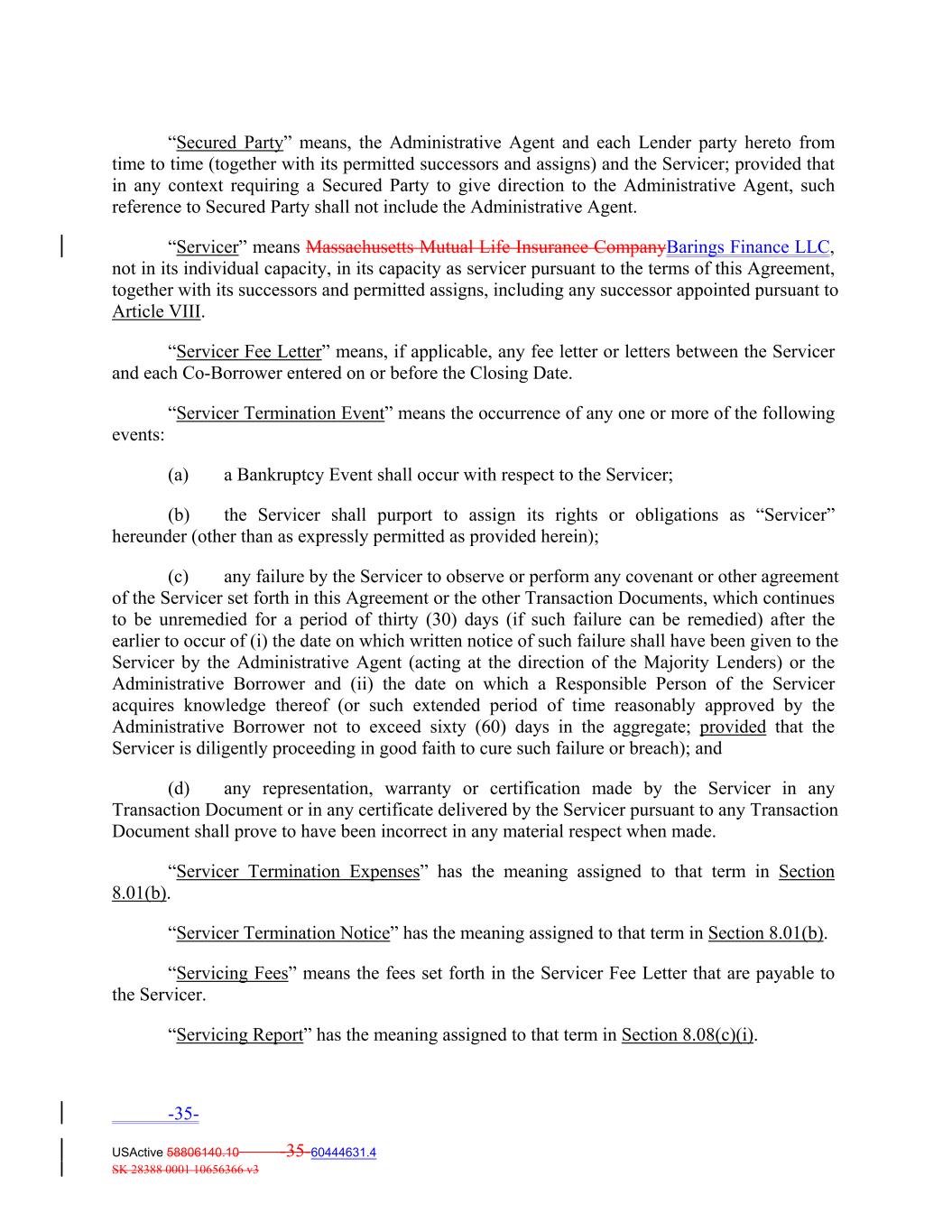 “Secured Party” means, the Administrative Agent and each Lender party hereto from time to time (together with its permitted successors and assigns) and the Servicer; provided that in any context requiring a Secured Party to give direction to the Administrative Agent, such reference to Secured Party shall not include the Administrative Agent. “Servicer” means Massachusetts Mutual Life Insurance CompanyBarings Finance LLC, not in its individual capacity, in its capacity as servicer pursuant to the terms of this Agreement, together with its successors and permitted assigns, including any successor appointed pursuant to Article VIII. “Servicer Fee Letter” means, if applicable, any fee letter or letters between the Servicer and each Co‐Borrower entered on or before the Closing Date. “Servicer Termination Event” means the occurrence of any one or more of the following events: (a) a Bankruptcy Event shall occur with respect to the Servicer; (b) the Servicer shall purport to assign its rights or obligations as “Servicer” hereunder (other than as expressly permitted as provided herein); (c) any failure by the Servicer to observe or perform any covenant or other agreement of the Servicer set forth in this Agreement or the other Transaction Documents, which continues to be unremedied for a period of thirty (30) days (if such failure can be remedied) after the earlier to occur of (i) the date on which written notice of such failure shall have been given to the Servicer by the Administrative Agent (acting at the direction of the Majority Lenders) or the Administrative Borrower and (ii) the date on which a Responsible Person of the Servicer acquires knowledge thereof (or such extended period of time reasonably approved by the Administrative Borrower not to exceed sixty (60) days in the aggregate; provided that the Servicer is diligently proceeding in good faith to cure such failure or breach); and (d) any representation, warranty or certification made by the Servicer in any Transaction Document or in any certificate delivered by the Servicer pursuant to any Transaction Document shall prove to have been incorrect in any material respect when made. “Servicer Termination Expenses” has the meaning assigned to that term in Section 8.01(b). “Servicer Termination Notice” has the meaning assigned to that term in Section 8.01(b). “Servicing Fees” means the fees set forth in the Servicer Fee Letter that are payable to the Servicer. “Servicing Report” has the meaning assigned to that term in Section 8.08(c)(i). -35- USActive 58806140.10 -35-60444631.4 SK 28388 0001 10656366 v3