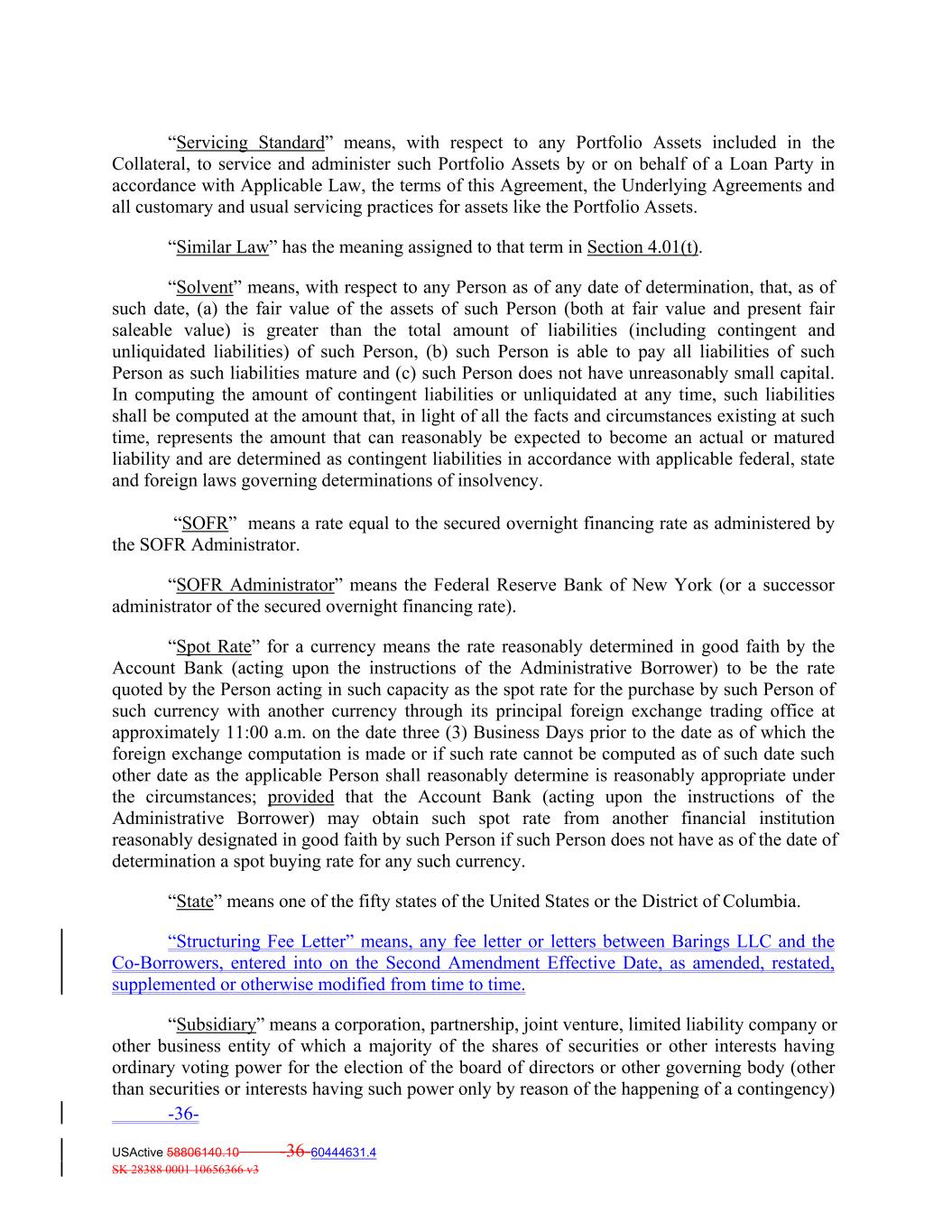 “Servicing Standard” means, with respect to any Portfolio Assets included in the Collateral, to service and administer such Portfolio Assets by or on behalf of a Loan Party in accordance with Applicable Law, the terms of this Agreement, the Underlying Agreements and all customary and usual servicing practices for assets like the Portfolio Assets. “Similar Law” has the meaning assigned to that term in Section 4.01(t). “Solvent” means, with respect to any Person as of any date of determination, that, as of such date, (a) the fair value of the assets of such Person (both at fair value and present fair saleable value) is greater than the total amount of liabilities (including contingent and unliquidated liabilities) of such Person, (b) such Person is able to pay all liabilities of such Person as such liabilities mature and (c) such Person does not have unreasonably small capital. In computing the amount of contingent liabilities or unliquidated at any time, such liabilities shall be computed at the amount that, in light of all the facts and circumstances existing at such time, represents the amount that can reasonably be expected to become an actual or matured liability and are determined as contingent liabilities in accordance with applicable federal, state and foreign laws governing determinations of insolvency. “SOFR” means a rate equal to the secured overnight financing rate as administered by the SOFR Administrator. “SOFR Administrator” means the Federal Reserve Bank of New York (or a successor administrator of the secured overnight financing rate). “Spot Rate” for a currency means the rate reasonably determined in good faith by the Account Bank (acting upon the instructions of the Administrative Borrower) to be the rate quoted by the Person acting in such capacity as the spot rate for the purchase by such Person of such currency with another currency through its principal foreign exchange trading office at approximately 11:00 a.m. on the date three (3) Business Days prior to the date as of which the foreign exchange computation is made or if such rate cannot be computed as of such date such other date as the applicable Person shall reasonably determine is reasonably appropriate under the circumstances; provided that the Account Bank (acting upon the instructions of the Administrative Borrower) may obtain such spot rate from another financial institution reasonably designated in good faith by such Person if such Person does not have as of the date of determination a spot buying rate for any such currency. “State” means one of the fifty states of the United States or the District of Columbia. “Structuring Fee Letter” means, any fee letter or letters between Barings LLC and the Co-Borrowers, entered into on the Second Amendment Effective Date, as amended, restated, supplemented or otherwise modified from time to time. “Subsidiary” means a corporation, partnership, joint venture, limited liability company or other business entity of which a majority of the shares of securities or other interests having ordinary voting power for the election of the board of directors or other governing body (other than securities or interests having such power only by reason of the happening of a contingency) -36- USActive 58806140.10 -36-60444631.4 SK 28388 0001 10656366 v3