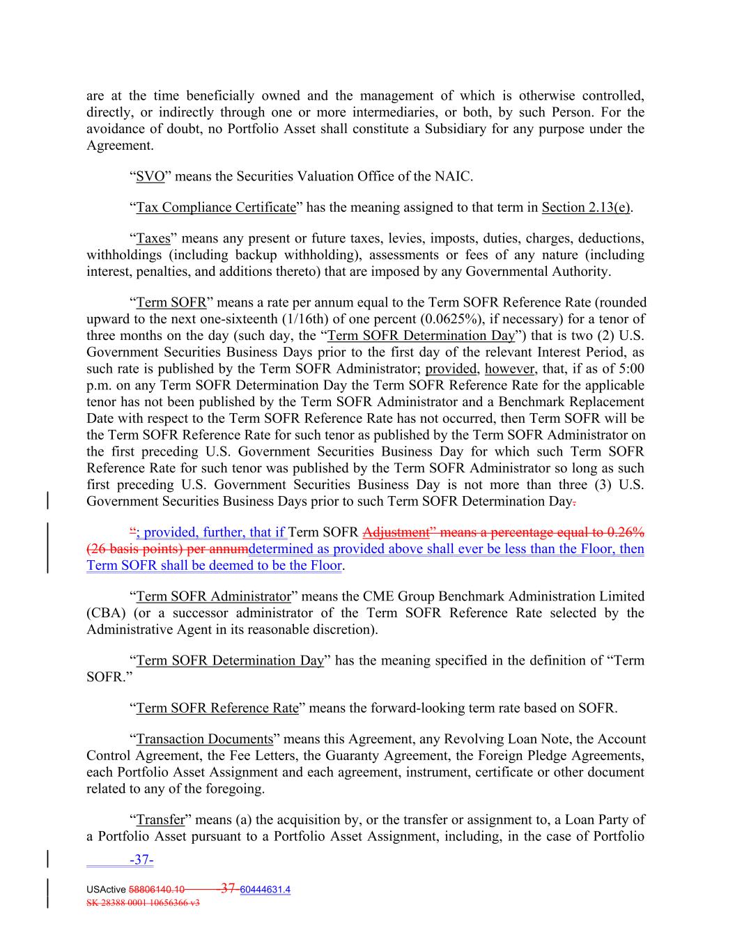are at the time beneficially owned and the management of which is otherwise controlled, directly, or indirectly through one or more intermediaries, or both, by such Person. For the avoidance of doubt, no Portfolio Asset shall constitute a Subsidiary for any purpose under the Agreement. “SVO” means the Securities Valuation Office of the NAIC. “Tax Compliance Certificate” has the meaning assigned to that term in Section 2.13(e). “Taxes” means any present or future taxes, levies, imposts, duties, charges, deductions, withholdings (including backup withholding), assessments or fees of any nature (including interest, penalties, and additions thereto) that are imposed by any Governmental Authority. “Term SOFR” means a rate per annum equal to the Term SOFR Reference Rate (rounded upward to the next one-sixteenth (1/16th) of one percent (0.0625%), if necessary) for a tenor of three months on the day (such day, the “Term SOFR Determination Day”) that is two (2) U.S. Government Securities Business Days prior to the first day of the relevant Interest Period, as such rate is published by the Term SOFR Administrator; provided, however, that, if as of 5:00 p.m. on any Term SOFR Determination Day the Term SOFR Reference Rate for the applicable tenor has not been published by the Term SOFR Administrator and a Benchmark Replacement Date with respect to the Term SOFR Reference Rate has not occurred, then Term SOFR will be the Term SOFR Reference Rate for such tenor as published by the Term SOFR Administrator on the first preceding U.S. Government Securities Business Day for which such Term SOFR Reference Rate for such tenor was published by the Term SOFR Administrator so long as such first preceding U.S. Government Securities Business Day is not more than three (3) U.S. Government Securities Business Days prior to such Term SOFR Determination Day. “; provided, further, that if Term SOFR Adjustment” means a percentage equal to 0.26% (26 basis points) per annumdetermined as provided above shall ever be less than the Floor, then Term SOFR shall be deemed to be the Floor. “Term SOFR Administrator” means the CME Group Benchmark Administration Limited (CBA) (or a successor administrator of the Term SOFR Reference Rate selected by the Administrative Agent in its reasonable discretion). “Term SOFR Determination Day” has the meaning specified in the definition of “Term SOFR.” “Term SOFR Reference Rate” means the forward-looking term rate based on SOFR. “Transaction Documents” means this Agreement, any Revolving Loan Note, the Account Control Agreement, the Fee Letters, the Guaranty Agreement, the Foreign Pledge Agreements, each Portfolio Asset Assignment and each agreement, instrument, certificate or other document related to any of the foregoing. “Transfer” means (a) the acquisition by, or the transfer or assignment to, a Loan Party of a Portfolio Asset pursuant to a Portfolio Asset Assignment, including, in the case of Portfolio -37- USActive 58806140.10 -37-60444631.4 SK 28388 0001 10656366 v3
