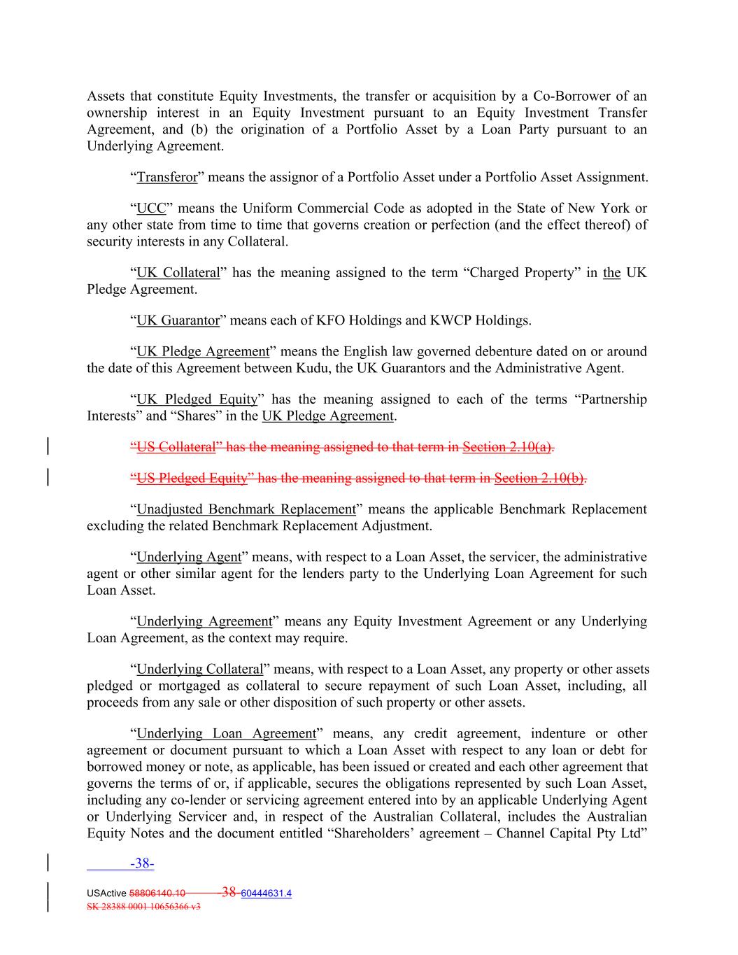 Assets that constitute Equity Investments, the transfer or acquisition by a Co‐Borrower of an ownership interest in an Equity Investment pursuant to an Equity Investment Transfer Agreement, and (b) the origination of a Portfolio Asset by a Loan Party pursuant to an Underlying Agreement. “Transferor” means the assignor of a Portfolio Asset under a Portfolio Asset Assignment. “UCC” means the Uniform Commercial Code as adopted in the State of New York or any other state from time to time that governs creation or perfection (and the effect thereof) of security interests in any Collateral. “UK Collateral” has the meaning assigned to the term “Charged Property” in the UK Pledge Agreement. “UK Guarantor” means each of KFO Holdings and KWCP Holdings. “UK Pledge Agreement” means the English law governed debenture dated on or around the date of this Agreement between Kudu, the UK Guarantors and the Administrative Agent. “UK Pledged Equity” has the meaning assigned to each of the terms “Partnership Interests” and “Shares” in the UK Pledge Agreement. “US Collateral” has the meaning assigned to that term in Section 2.10(a). “US Pledged Equity” has the meaning assigned to that term in Section 2.10(b). “Unadjusted Benchmark Replacement” means the applicable Benchmark Replacement excluding the related Benchmark Replacement Adjustment. “Underlying Agent” means, with respect to a Loan Asset, the servicer, the administrative agent or other similar agent for the lenders party to the Underlying Loan Agreement for such Loan Asset. “Underlying Agreement” means any Equity Investment Agreement or any Underlying Loan Agreement, as the context may require. “Underlying Collateral” means, with respect to a Loan Asset, any property or other assets pledged or mortgaged as collateral to secure repayment of such Loan Asset, including, all proceeds from any sale or other disposition of such property or other assets. “Underlying Loan Agreement” means, any credit agreement, indenture or other agreement or document pursuant to which a Loan Asset with respect to any loan or debt for borrowed money or note, as applicable, has been issued or created and each other agreement that governs the terms of or, if applicable, secures the obligations represented by such Loan Asset, including any co‐lender or servicing agreement entered into by an applicable Underlying Agent or Underlying Servicer and, in respect of the Australian Collateral, includes the Australian Equity Notes and the document entitled “Shareholders’ agreement – Channel Capital Pty Ltd” -38- USActive 58806140.10 -38-60444631.4 SK 28388 0001 10656366 v3