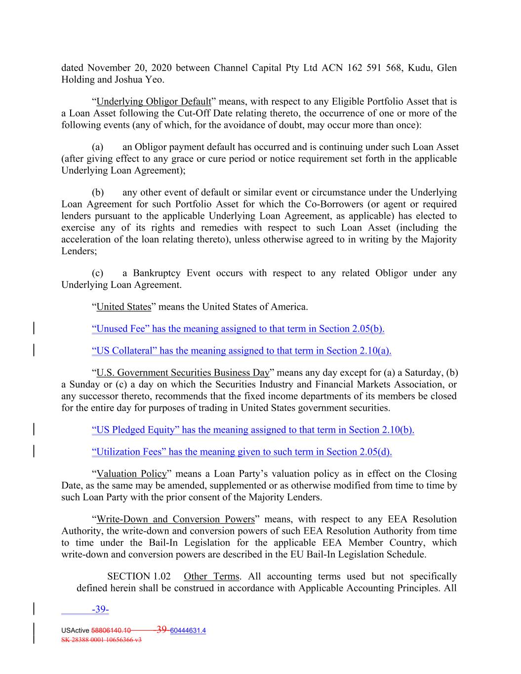 dated November 20, 2020 between Channel Capital Pty Ltd ACN 162 591 568, Kudu, Glen Holding and Joshua Yeo. “Underlying Obligor Default” means, with respect to any Eligible Portfolio Asset that is a Loan Asset following the Cut‐Off Date relating thereto, the occurrence of one or more of the following events (any of which, for the avoidance of doubt, may occur more than once): (a) an Obligor payment default has occurred and is continuing under such Loan Asset (after giving effect to any grace or cure period or notice requirement set forth in the applicable Underlying Loan Agreement); (b) any other event of default or similar event or circumstance under the Underlying Loan Agreement for such Portfolio Asset for which the Co‐Borrowers (or agent or required lenders pursuant to the applicable Underlying Loan Agreement, as applicable) has elected to exercise any of its rights and remedies with respect to such Loan Asset (including the acceleration of the loan relating thereto), unless otherwise agreed to in writing by the Majority Lenders; (c) a Bankruptcy Event occurs with respect to any related Obligor under any Underlying Loan Agreement. “United States” means the United States of America. “Unused Fee” has the meaning assigned to that term in Section 2.05(b). “US Collateral” has the meaning assigned to that term in Section 2.10(a). “U.S. Government Securities Business Day” means any day except for (a) a Saturday, (b) a Sunday or (c) a day on which the Securities Industry and Financial Markets Association, or any successor thereto, recommends that the fixed income departments of its members be closed for the entire day for purposes of trading in United States government securities. “US Pledged Equity” has the meaning assigned to that term in Section 2.10(b). “Utilization Fees” has the meaning given to such term in Section 2.05(d). “Valuation Policy” means a Loan Party’s valuation policy as in effect on the Closing Date, as the same may be amended, supplemented or as otherwise modified from time to time by such Loan Party with the prior consent of the Majority Lenders. “Write‐Down and Conversion Powers” means, with respect to any EEA Resolution Authority, the write‐down and conversion powers of such EEA Resolution Authority from time to time under the Bail‐In Legislation for the applicable EEA Member Country, which write‐down and conversion powers are described in the EU Bail‐In Legislation Schedule. SECTION 1.02 Other Terms. All accounting terms used but not specifically defined herein shall be construed in accordance with Applicable Accounting Principles. All -39- USActive 58806140.10 -39-60444631.4 SK 28388 0001 10656366 v3