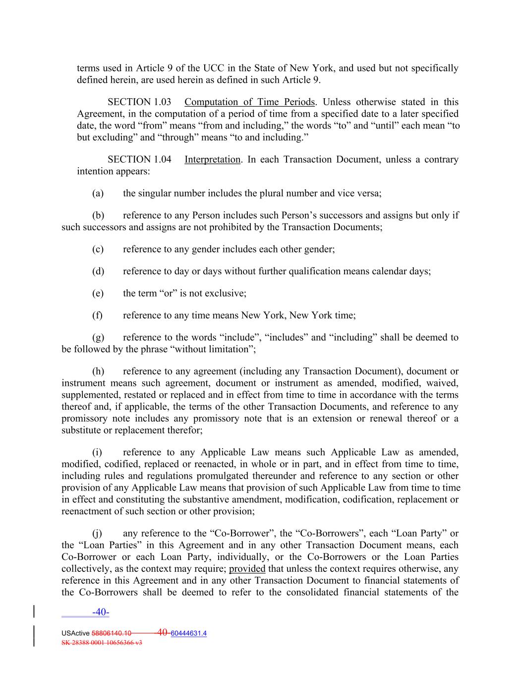 terms used in Article 9 of the UCC in the State of New York, and used but not specifically defined herein, are used herein as defined in such Article 9. SECTION 1.03 Computation of Time Periods. Unless otherwise stated in this Agreement, in the computation of a period of time from a specified date to a later specified date, the word “from” means “from and including,” the words “to” and “until” each mean “to but excluding” and “through” means “to and including.” SECTION 1.04 Interpretation. In each Transaction Document, unless a contrary intention appears: (a) the singular number includes the plural number and vice versa; (b) reference to any Person includes such Person’s successors and assigns but only if such successors and assigns are not prohibited by the Transaction Documents; (c) reference to any gender includes each other gender; (d) reference to day or days without further qualification means calendar days; (e) the term “or” is not exclusive; (f) reference to any time means New York, New York time; (g) reference to the words “include”, “includes” and “including” shall be deemed to be followed by the phrase “without limitation”; (h) reference to any agreement (including any Transaction Document), document or instrument means such agreement, document or instrument as amended, modified, waived, supplemented, restated or replaced and in effect from time to time in accordance with the terms thereof and, if applicable, the terms of the other Transaction Documents, and reference to any promissory note includes any promissory note that is an extension or renewal thereof or a substitute or replacement therefor; (i) reference to any Applicable Law means such Applicable Law as amended, modified, codified, replaced or reenacted, in whole or in part, and in effect from time to time, including rules and regulations promulgated thereunder and reference to any section or other provision of any Applicable Law means that provision of such Applicable Law from time to time in effect and constituting the substantive amendment, modification, codification, replacement or reenactment of such section or other provision; (j) any reference to the “Co‐Borrower”, the “Co‐Borrowers”, each “Loan Party” or the “Loan Parties” in this Agreement and in any other Transaction Document means, each Co‐Borrower or each Loan Party, individually, or the Co‐Borrowers or the Loan Parties collectively, as the context may require; provided that unless the context requires otherwise, any reference in this Agreement and in any other Transaction Document to financial statements of the Co‐Borrowers shall be deemed to refer to the consolidated financial statements of the -40- USActive 58806140.10 -40-60444631.4 SK 28388 0001 10656366 v3