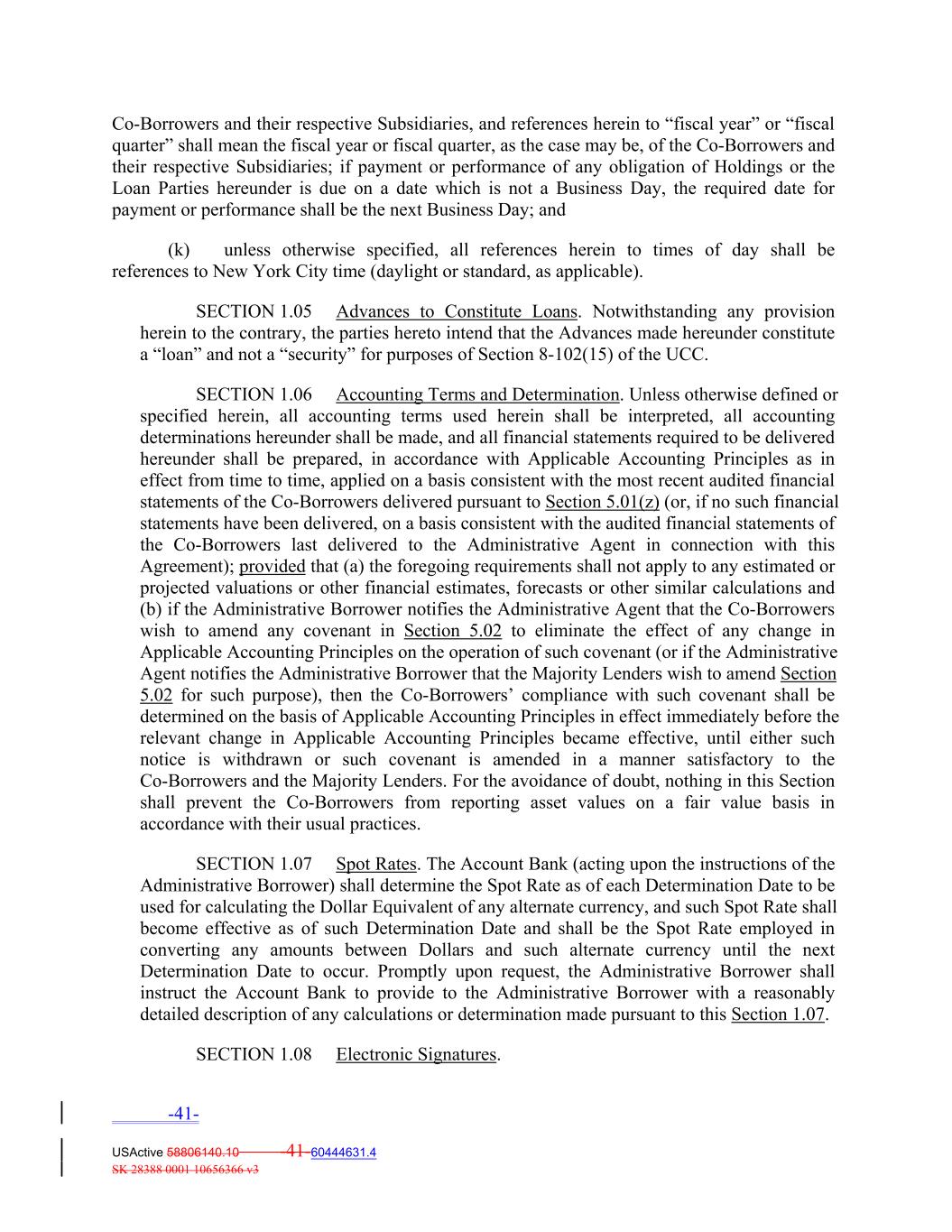 Co‐Borrowers and their respective Subsidiaries, and references herein to “fiscal year” or “fiscal quarter” shall mean the fiscal year or fiscal quarter, as the case may be, of the Co‐Borrowers and their respective Subsidiaries; if payment or performance of any obligation of Holdings or the Loan Parties hereunder is due on a date which is not a Business Day, the required date for payment or performance shall be the next Business Day; and (k) unless otherwise specified, all references herein to times of day shall be references to New York City time (daylight or standard, as applicable). SECTION 1.05 Advances to Constitute Loans. Notwithstanding any provision herein to the contrary, the parties hereto intend that the Advances made hereunder constitute a “loan” and not a “security” for purposes of Section 8‐102(15) of the UCC. SECTION 1.06 Accounting Terms and Determination. Unless otherwise defined or specified herein, all accounting terms used herein shall be interpreted, all accounting determinations hereunder shall be made, and all financial statements required to be delivered hereunder shall be prepared, in accordance with Applicable Accounting Principles as in effect from time to time, applied on a basis consistent with the most recent audited financial statements of the Co‐Borrowers delivered pursuant to Section 5.01(z) (or, if no such financial statements have been delivered, on a basis consistent with the audited financial statements of the Co‐Borrowers last delivered to the Administrative Agent in connection with this Agreement); provided that (a) the foregoing requirements shall not apply to any estimated or projected valuations or other financial estimates, forecasts or other similar calculations and (b) if the Administrative Borrower notifies the Administrative Agent that the Co‐Borrowers wish to amend any covenant in Section 5.02 to eliminate the effect of any change in Applicable Accounting Principles on the operation of such covenant (or if the Administrative Agent notifies the Administrative Borrower that the Majority Lenders wish to amend Section 5.02 for such purpose), then the Co‐Borrowers’ compliance with such covenant shall be determined on the basis of Applicable Accounting Principles in effect immediately before the relevant change in Applicable Accounting Principles became effective, until either such notice is withdrawn or such covenant is amended in a manner satisfactory to the Co‐Borrowers and the Majority Lenders. For the avoidance of doubt, nothing in this Section shall prevent the Co‐Borrowers from reporting asset values on a fair value basis in accordance with their usual practices. SECTION 1.07 Spot Rates. The Account Bank (acting upon the instructions of the Administrative Borrower) shall determine the Spot Rate as of each Determination Date to be used for calculating the Dollar Equivalent of any alternate currency, and such Spot Rate shall become effective as of such Determination Date and shall be the Spot Rate employed in converting any amounts between Dollars and such alternate currency until the next Determination Date to occur. Promptly upon request, the Administrative Borrower shall instruct the Account Bank to provide to the Administrative Borrower with a reasonably detailed description of any calculations or determination made pursuant to this Section 1.07. SECTION 1.08 Electronic Signatures. -41- USActive 58806140.10 -41-60444631.4 SK 28388 0001 10656366 v3