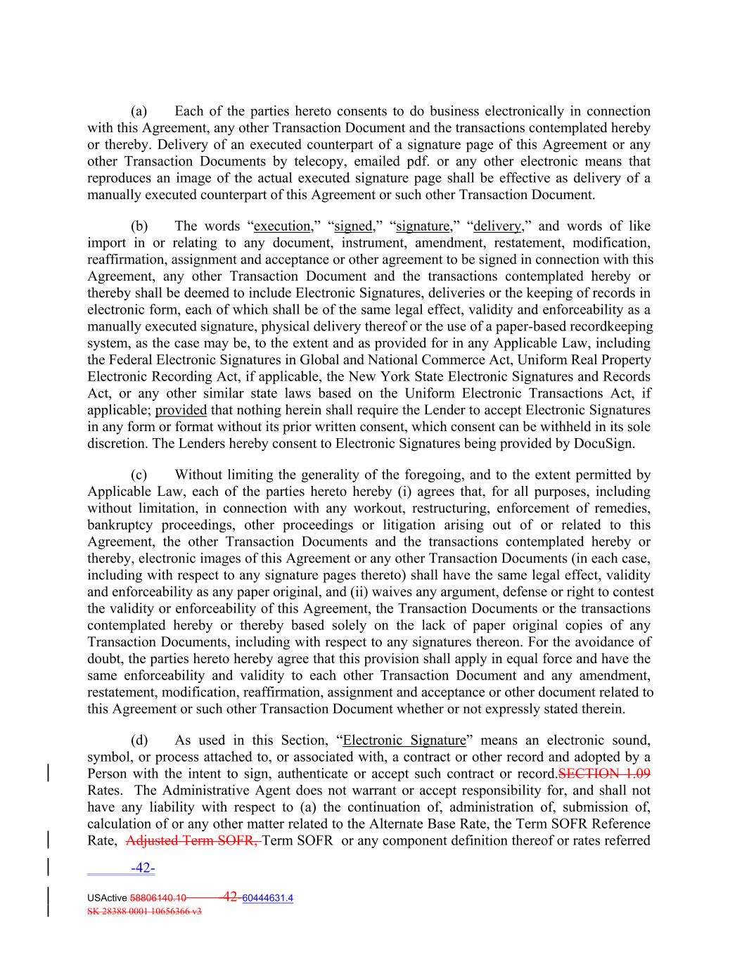 (a) Each of the parties hereto consents to do business electronically in connection with this Agreement, any other Transaction Document and the transactions contemplated hereby or thereby. Delivery of an executed counterpart of a signature page of this Agreement or any other Transaction Documents by telecopy, emailed pdf. or any other electronic means that reproduces an image of the actual executed signature page shall be effective as delivery of a manually executed counterpart of this Agreement or such other Transaction Document. (b) The words “execution,” “signed,” “signature,” “delivery,” and words of like import in or relating to any document, instrument, amendment, restatement, modification, reaffirmation, assignment and acceptance or other agreement to be signed in connection with this Agreement, any other Transaction Document and the transactions contemplated hereby or thereby shall be deemed to include Electronic Signatures, deliveries or the keeping of records in electronic form, each of which shall be of the same legal effect, validity and enforceability as a manually executed signature, physical delivery thereof or the use of a paper‐based recordkeeping system, as the case may be, to the extent and as provided for in any Applicable Law, including the Federal Electronic Signatures in Global and National Commerce Act, Uniform Real Property Electronic Recording Act, if applicable, the New York State Electronic Signatures and Records Act, or any other similar state laws based on the Uniform Electronic Transactions Act, if applicable; provided that nothing herein shall require the Lender to accept Electronic Signatures in any form or format without its prior written consent, which consent can be withheld in its sole discretion. The Lenders hereby consent to Electronic Signatures being provided by DocuSign. (c) Without limiting the generality of the foregoing, and to the extent permitted by Applicable Law, each of the parties hereto hereby (i) agrees that, for all purposes, including without limitation, in connection with any workout, restructuring, enforcement of remedies, bankruptcy proceedings, other proceedings or litigation arising out of or related to this Agreement, the other Transaction Documents and the transactions contemplated hereby or thereby, electronic images of this Agreement or any other Transaction Documents (in each case, including with respect to any signature pages thereto) shall have the same legal effect, validity and enforceability as any paper original, and (ii) waives any argument, defense or right to contest the validity or enforceability of this Agreement, the Transaction Documents or the transactions contemplated hereby or thereby based solely on the lack of paper original copies of any Transaction Documents, including with respect to any signatures thereon. For the avoidance of doubt, the parties hereto hereby agree that this provision shall apply in equal force and have the same enforceability and validity to each other Transaction Document and any amendment, restatement, modification, reaffirmation, assignment and acceptance or other document related to this Agreement or such other Transaction Document whether or not expressly stated therein. (d) As used in this Section, “Electronic Signature” means an electronic sound, symbol, or process attached to, or associated with, a contract or other record and adopted by a Person with the intent to sign, authenticate or accept such contract or record.SECTION 1.09 Rates. The Administrative Agent does not warrant or accept responsibility for, and shall not have any liability with respect to (a) the continuation of, administration of, submission of, calculation of or any other matter related to the Alternate Base Rate, the Term SOFR Reference Rate, Adjusted Term SOFR, Term SOFR or any component definition thereof or rates referred -42- USActive 58806140.10 -42-60444631.4 SK 28388 0001 10656366 v3