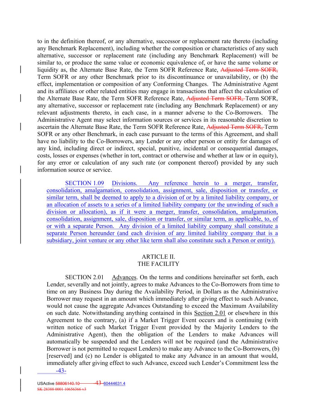 to in the definition thereof, or any alternative, successor or replacement rate thereto (including any Benchmark Replacement), including whether the composition or characteristics of any such alternative, successor or replacement rate (including any Benchmark Replacement) will be similar to, or produce the same value or economic equivalence of, or have the same volume or liquidity as, the Alternate Base Rate, the Term SOFR Reference Rate, Adjusted Term SOFR, Term SOFR or any other Benchmark prior to its discontinuance or unavailability, or (b) the effect, implementation or composition of any Conforming Changes. The Administrative Agent and its affiliates or other related entities may engage in transactions that affect the calculation of the Alternate Base Rate, the Term SOFR Reference Rate, Adjusted Term SOFR, Term SOFR, any alternative, successor or replacement rate (including any Benchmark Replacement) or any relevant adjustments thereto, in each case, in a manner adverse to the Co-Borrowers. The Administrative Agent may select information sources or services in its reasonable discretion to ascertain the Alternate Base Rate, the Term SOFR Reference Rate, Adjusted Term SOFR, Term SOFR or any other Benchmark, in each case pursuant to the terms of this Agreement, and shall have no liability to the Co-Borrowers, any Lender or any other person or entity for damages of any kind, including direct or indirect, special, punitive, incidental or consequential damages, costs, losses or expenses (whether in tort, contract or otherwise and whether at law or in equity), for any error or calculation of any such rate (or component thereof) provided by any such information source or service. SECTION 1.09 Divisions. Any reference herein to a merger, transfer, consolidation, amalgamation, consolidation, assignment, sale, disposition or transfer, or similar term, shall be deemed to apply to a division of or by a limited liability company, or an allocation of assets to a series of a limited liability company (or the unwinding of such a division or allocation), as if it were a merger, transfer, consolidation, amalgamation, consolidation, assignment, sale, disposition or transfer, or similar term, as applicable, to, of or with a separate Person. Any division of a limited liability company shall constitute a separate Person hereunder (and each division of any limited liability company that is a subsidiary, joint venture or any other like term shall also constitute such a Person or entity). ARTICLE II. THE FACILITY SECTION 2.01 Advances. On the terms and conditions hereinafter set forth, each Lender, severally and not jointly, agrees to make Advances to the Co‐Borrowers from time to time on any Business Day during the Availability Period, in Dollars as the Administrative Borrower may request in an amount which immediately after giving effect to such Advance, would not cause the aggregate Advances Outstanding to exceed the Maximum Availability on such date. Notwithstanding anything contained in this Section 2.01 or elsewhere in this Agreement to the contrary, (a) if a Market Trigger Event occurs and is continuing (with written notice of such Market Trigger Event provided by the Majority Lenders to the Administrative Agent), then the obligation of the Lenders to make Advances will automatically be suspended and the Lenders will not be required (and the Administrative Borrower is not permitted to request Lenders) to make any Advance to the Co‐Borrowers, (b) [reserved] and (c) no Lender is obligated to make any Advance in an amount that would, immediately after giving effect to such Advance, exceed such Lender’s Commitment less the -43- USActive 58806140.10 -43-60444631.4 SK 28388 0001 10656366 v3