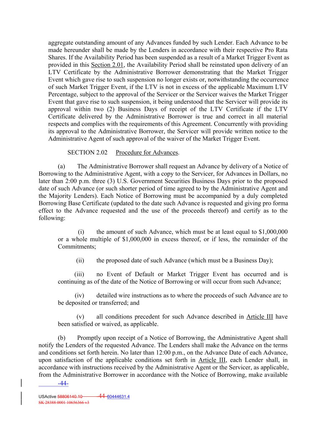 aggregate outstanding amount of any Advances funded by such Lender. Each Advance to be made hereunder shall be made by the Lenders in accordance with their respective Pro Rata Shares. If the Availability Period has been suspended as a result of a Market Trigger Event as provided in this Section 2.01, the Availability Period shall be reinstated upon delivery of an LTV Certificate by the Administrative Borrower demonstrating that the Market Trigger Event which gave rise to such suspension no longer exists or, notwithstanding the occurrence of such Market Trigger Event, if the LTV is not in excess of the applicable Maximum LTV Percentage, subject to the approval of the Servicer or the Servicer waives the Market Trigger Event that gave rise to such suspension, it being understood that the Servicer will provide its approval within two (2) Business Days of receipt of the LTV Certificate if the LTV Certificate delivered by the Administrative Borrower is true and correct in all material respects and complies with the requirements of this Agreement. Concurrently with providing its approval to the Administrative Borrower, the Servicer will provide written notice to the Administrative Agent of such approval of the waiver of the Market Trigger Event. SECTION 2.02 Procedure for Advances. (a) The Administrative Borrower shall request an Advance by delivery of a Notice of Borrowing to the Administrative Agent, with a copy to the Servicer, for Advances in Dollars, no later than 2:00 p.m. three (3) U.S. Government Securities Business Days prior to the proposed date of such Advance (or such shorter period of time agreed to by the Administrative Agent and the Majority Lenders). Each Notice of Borrowing must be accompanied by a duly completed Borrowing Base Certificate (updated to the date such Advance is requested and giving pro forma effect to the Advance requested and the use of the proceeds thereof) and certify as to the following: (i) the amount of such Advance, which must be at least equal to $1,000,000 or a whole multiple of $1,000,000 in excess thereof, or if less, the remainder of the Commitments; (ii) the proposed date of such Advance (which must be a Business Day); (iii) no Event of Default or Market Trigger Event has occurred and is continuing as of the date of the Notice of Borrowing or will occur from such Advance; (iv) detailed wire instructions as to where the proceeds of such Advance are to be deposited or transferred; and (v) all conditions precedent for such Advance described in Article III have been satisfied or waived, as applicable. (b) Promptly upon receipt of a Notice of Borrowing, the Administrative Agent shall notify the Lenders of the requested Advance. The Lenders shall make the Advance on the terms and conditions set forth herein. No later than 12:00 p.m., on the Advance Date of each Advance, upon satisfaction of the applicable conditions set forth in Article III, each Lender shall, in accordance with instructions received by the Administrative Agent or the Servicer, as applicable, from the Administrative Borrower in accordance with the Notice of Borrowing, make available -44- USActive 58806140.10 -44-60444631.4 SK 28388 0001 10656366 v3