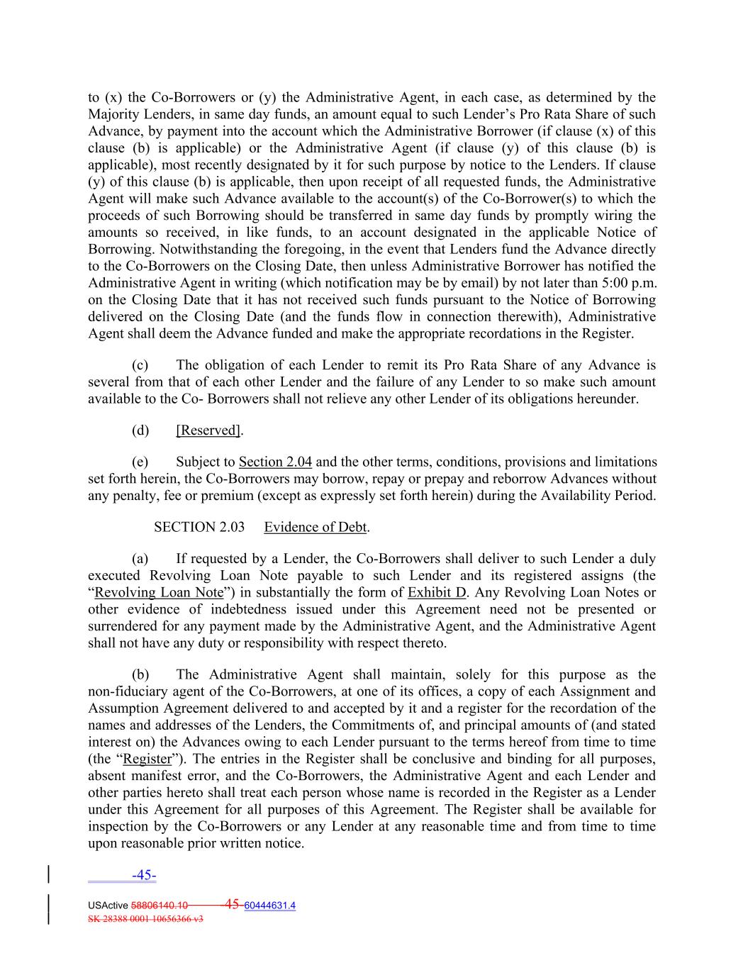 to (x) the Co‐Borrowers or (y) the Administrative Agent, in each case, as determined by the Majority Lenders, in same day funds, an amount equal to such Lender’s Pro Rata Share of such Advance, by payment into the account which the Administrative Borrower (if clause (x) of this clause (b) is applicable) or the Administrative Agent (if clause (y) of this clause (b) is applicable), most recently designated by it for such purpose by notice to the Lenders. If clause (y) of this clause (b) is applicable, then upon receipt of all requested funds, the Administrative Agent will make such Advance available to the account(s) of the Co‐Borrower(s) to which the proceeds of such Borrowing should be transferred in same day funds by promptly wiring the amounts so received, in like funds, to an account designated in the applicable Notice of Borrowing. Notwithstanding the foregoing, in the event that Lenders fund the Advance directly to the Co‐Borrowers on the Closing Date, then unless Administrative Borrower has notified the Administrative Agent in writing (which notification may be by email) by not later than 5:00 p.m. on the Closing Date that it has not received such funds pursuant to the Notice of Borrowing delivered on the Closing Date (and the funds flow in connection therewith), Administrative Agent shall deem the Advance funded and make the appropriate recordations in the Register. (c) The obligation of each Lender to remit its Pro Rata Share of any Advance is several from that of each other Lender and the failure of any Lender to so make such amount available to the Co‐ Borrowers shall not relieve any other Lender of its obligations hereunder. (d) [Reserved]. (e) Subject to Section 2.04 and the other terms, conditions, provisions and limitations set forth herein, the Co‐Borrowers may borrow, repay or prepay and reborrow Advances without any penalty, fee or premium (except as expressly set forth herein) during the Availability Period. SECTION 2.03 Evidence of Debt. (a) If requested by a Lender, the Co‐Borrowers shall deliver to such Lender a duly executed Revolving Loan Note payable to such Lender and its registered assigns (the “Revolving Loan Note”) in substantially the form of Exhibit D. Any Revolving Loan Notes or other evidence of indebtedness issued under this Agreement need not be presented or surrendered for any payment made by the Administrative Agent, and the Administrative Agent shall not have any duty or responsibility with respect thereto. (b) The Administrative Agent shall maintain, solely for this purpose as the non‐fiduciary agent of the Co‐Borrowers, at one of its offices, a copy of each Assignment and Assumption Agreement delivered to and accepted by it and a register for the recordation of the names and addresses of the Lenders, the Commitments of, and principal amounts of (and stated interest on) the Advances owing to each Lender pursuant to the terms hereof from time to time (the “Register”). The entries in the Register shall be conclusive and binding for all purposes, absent manifest error, and the Co‐Borrowers, the Administrative Agent and each Lender and other parties hereto shall treat each person whose name is recorded in the Register as a Lender under this Agreement for all purposes of this Agreement. The Register shall be available for inspection by the Co‐Borrowers or any Lender at any reasonable time and from time to time upon reasonable prior written notice. -45- USActive 58806140.10 -45-60444631.4 SK 28388 0001 10656366 v3