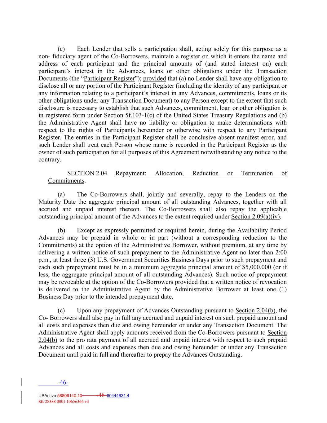 (c) Each Lender that sells a participation shall, acting solely for this purpose as a non‐ fiduciary agent of the Co‐Borrowers, maintain a register on which it enters the name and address of each participant and the principal amounts of (and stated interest on) each participant’s interest in the Advances, loans or other obligations under the Transaction Documents (the “Participant Register”); provided that (a) no Lender shall have any obligation to disclose all or any portion of the Participant Register (including the identity of any participant or any information relating to a participant’s interest in any Advances, commitments, loans or its other obligations under any Transaction Document) to any Person except to the extent that such disclosure is necessary to establish that such Advances, commitment, loan or other obligation is in registered form under Section 5f.103‐1(c) of the United States Treasury Regulations and (b) the Administrative Agent shall have no liability or obligation to make determinations with respect to the rights of Participants hereunder or otherwise with respect to any Participant Register. The entries in the Participant Register shall be conclusive absent manifest error, and such Lender shall treat each Person whose name is recorded in the Participant Register as the owner of such participation for all purposes of this Agreement notwithstanding any notice to the contrary. SECTION 2.04 Repayment; Allocation, Reduction or Termination of Commitments. (a) The Co‐Borrowers shall, jointly and severally, repay to the Lenders on the Maturity Date the aggregate principal amount of all outstanding Advances, together with all accrued and unpaid interest thereon. The Co‐Borrowers shall also repay the applicable outstanding principal amount of the Advances to the extent required under Section 2.09(a)(iv). (b) Except as expressly permitted or required herein, during the Availability Period Advances may be prepaid in whole or in part (without a corresponding reduction to the Commitments) at the option of the Administrative Borrower, without premium, at any time by delivering a written notice of such prepayment to the Administrative Agent no later than 2:00 p.m., at least three (3) U.S. Government Securities Business Days prior to such prepayment and each such prepayment must be in a minimum aggregate principal amount of $5,000,000 (or if less, the aggregate principal amount of all outstanding Advances). Such notice of prepayment may be revocable at the option of the Co‐Borrowers provided that a written notice of revocation is delivered to the Administrative Agent by the Administrative Borrower at least one (1) Business Day prior to the intended prepayment date. (c) Upon any prepayment of Advances Outstanding pursuant to Section 2.04(b), the Co‐ Borrowers shall also pay in full any accrued and unpaid interest on such prepaid amount and all costs and expenses then due and owing hereunder or under any Transaction Document. The Administrative Agent shall apply amounts received from the Co‐Borrowers pursuant to Section 2.04(b) to the pro rata payment of all accrued and unpaid interest with respect to such prepaid Advances and all costs and expenses then due and owing hereunder or under any Transaction Document until paid in full and thereafter to prepay the Advances Outstanding. -46- USActive 58806140.10 -46-60444631.4 SK 28388 0001 10656366 v3
