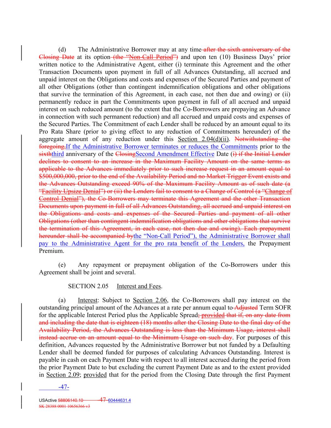 (d) The Administrative Borrower may at any time after the sixth anniversary of the Closing Date at its option (the “Non‐Call Period”) and upon ten (10) Business Days’ prior written notice to the Administrative Agent, either (i) terminate this Agreement and the other Transaction Documents upon payment in full of all Advances Outstanding, all accrued and unpaid interest on the Obligations and costs and expenses of the Secured Parties and payment of all other Obligations (other than contingent indemnification obligations and other obligations that survive the termination of this Agreement, in each case, not then due and owing) or (ii) permanently reduce in part the Commitments upon payment in full of all accrued and unpaid interest on such reduced amount (to the extent that the Co‐Borrowers are prepaying an Advance in connection with such permanent reduction) and all accrued and unpaid costs and expenses of the Secured Parties. The Commitment of each Lender shall be reduced by an amount equal to its Pro Rata Share (prior to giving effect to any reduction of Commitments hereunder) of the aggregate amount of any reduction under this Section 2.04(d)(ii). Notwithstanding the foregoing,If the Administrative Borrower terminates or reduces the Commitments prior to the sixththird anniversary of the ClosingSecond Amendment Effective Date (i) if the Initial Lender declines to consent to an increase in the Maximum Facility Amount on the same terms as applicable to the Advances immediately prior to such increase request in an amount equal to $500,000,000, prior to the end of the Availability Period and no Market Trigger Event exists and the Advances Outstanding exceed 90% of the Maximum Facility Amount as of such date (a “Facility Upsize Denial”) or (ii) the Lenders fail to consent to a Change of Control (a “Change of Control Denial”), the Co‐Borrowers may terminate this Agreement and the other Transaction Documents upon payment in full of all Advances Outstanding, all accrued and unpaid interest on the Obligations and costs and expenses of the Secured Parties and payment of all other Obligations (other than contingent indemnification obligations and other obligations that survive the termination of this Agreement, in each case, not then due and owing). Each prepayment hereunder shall be accompanied bythe “Non‐Call Period”), the Administrative Borrower shall pay to the Administrative Agent for the pro rata benefit of the Lenders, the Prepayment Premium. (e) Any repayment or prepayment obligation of the Co‐Borrowers under this Agreement shall be joint and several. SECTION 2.05 Interest and Fees. (a) Interest: Subject to Section 2.06, the Co‐Borrowers shall pay interest on the outstanding principal amount of the Advances at a rate per annum equal to Adjusted Term SOFR for the applicable Interest Period plus the Applicable Spread; provided that if, on any date from and including the date that is eighteen (18) months after the Closing Date to the final day of the Availability Period, the Advances Outstanding is less than the Minimum Usage, interest shall instead accrue on an amount equal to the Minimum Usage on such day. For purposes of this definition, Advances requested by the Administrative Borrower but not funded by a Defaulting Lender shall be deemed funded for purposes of calculating Advances Outstanding. Interest is payable in cash on each Payment Date with respect to all interest accrued during the period from the prior Payment Date to but excluding the current Payment Date as and to the extent provided in Section 2.09; provided that for the period from the Closing Date through the first Payment -47- USActive 58806140.10 -47-60444631.4 SK 28388 0001 10656366 v3
