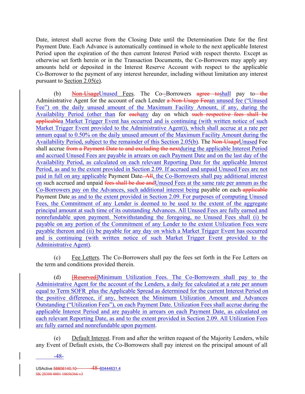 Date, interest shall accrue from the Closing Date until the Determination Date for the first Payment Date. Each Advance is automatically continued in whole to the next applicable Interest Period upon the expiration of the then current Interest Period with respect thereto. Except as otherwise set forth herein or in the Transaction Documents, the Co‐Borrowers may apply any amounts held or deposited in the Interest Reserve Account with respect to the applicable Co‐Borrower to the payment of any interest hereunder, including without limitation any interest pursuant to Section 2.05(e). (b) Non‐UsageUnused Fees. The Co‐-Borrowers agree toshall pay to the Administrative Agent for the account of each Lender a Non‐Usage Feean unused fee (“Unused Fee”) on the daily unused amount of the Maximum Facility Amount, if any, during the Availability Period (other than for eachany day on which such respective fees shall be applicablea Market Trigger Event has occurred and is continuing (with written notice of such Market Trigger Event provided to the Administrative Agent)), which shall accrue at a rate per annum equal to 0.50% on the daily unused amount of the Maximum Facility Amount during the Availability Period, subject to the remainder of this Section 2.05(b). The Non‐UsageUnused Fee shall accrue from a Payment Date to and excluding the nextduring the applicable Interest Period and accrued Unused Fees are payable in arrears on each Payment Date and on the last day of the Availability Period, as calculated on each relevant Reporting Date for the applicable Interest Period, as and to the extent provided in Section 2.09. If accrued and unpaid Unused Fees are not paid in full on any applicable Payment Date. All, the Co-Borrowers shall pay additional interest on such accrued and unpaid fees shall be due andUnused Fees at the same rate per annum as the Co-Borrowers pay on the Advances, such additional interest being payable on each applicable Payment Date as and to the extent provided in Section 2.09. For purposes of computing Unused Fees, the Commitment of any Lender is deemed to be used to the extent of the aggregate principal amount at such time of its outstanding Advances. All Unused Fees are fully earned and nonrefundable upon payment. Notwithstanding the foregoing, no Unused Fees shall (i) be payable on any portion of the Commitment of any Lender to the extent Utilization Fees were payable thereon and (ii) be payable for any day on which a Market Trigger Event has occurred and is continuing (with written notice of such Market Trigger Event provided to the Administrative Agent). (c) Fee Letters. The Co‐Borrowers shall pay the fees set forth in the Fee Letters on the term and conditions provided therein. (d) [Reserved]Minimum Utilization Fees. The Co-Borrowers shall pay to the Administrative Agent for the account of the Lenders, a daily fee calculated at a rate per annum equal to Term SOFR plus the Applicable Spread as determined for the current Interest Period on the positive difference, if any, between the Minimum Utilization Amount and Advances Outstanding (“Utilization Fees”), on each Payment Date. Utilization Fees shall accrue during the applicable Interest Period and are payable in arrears on each Payment Date, as calculated on each relevant Reporting Date, as and to the extent provided in Section 2.09. All Utilization Fees are fully earned and nonrefundable upon payment. (e) Default Interest. From and after the written request of the Majority Lenders, while any Event of Default exists, the Co‐Borrowers shall pay interest on the principal amount of all -48- USActive 58806140.10 -48-60444631.4 SK 28388 0001 10656366 v3