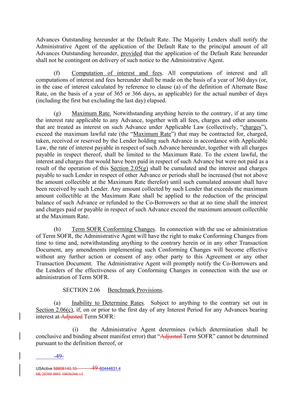 Advances Outstanding hereunder at the Default Rate. The Majority Lenders shall notify the Administrative Agent of the application of the Default Rate to the principal amount of all Advances Outstanding hereunder, provided that the application of the Default Rate hereunder shall not be contingent on delivery of such notice to the Administrative Agent. (f) Computation of interest and fees. All computations of interest and all computations of interest and fees hereunder shall be made on the basis of a year of 360 days (or, in the case of interest calculated by reference to clause (a) of the definition of Alternate Base Rate, on the basis of a year of 365 or 366 days, as applicable) for the actual number of days (including the first but excluding the last day) elapsed. (g) Maximum Rate. Notwithstanding anything herein to the contrary, if at any time the interest rate applicable to any Advance, together with all fees, charges and other amounts that are treated as interest on such Advance under Applicable Law (collectively, “charges”), exceed the maximum lawful rate (the “Maximum Rate”) that may be contracted for, charged, taken, received or reserved by the Lender holding such Advance in accordance with Applicable Law, the rate of interest payable in respect of such Advance hereunder, together with all charges payable in respect thereof, shall be limited to the Maximum Rate. To the extent lawful, the interest and charges that would have been paid in respect of such Advance but were not paid as a result of the operation of this Section 2.05(g) shall be cumulated and the interest and charges payable to such Lender in respect of other Advance or periods shall be increased (but not above the amount collectible at the Maximum Rate therefor) until such cumulated amount shall have been received by such Lender. Any amount collected by such Lender that exceeds the maximum amount collectible at the Maximum Rate shall be applied to the reduction of the principal balance of such Advance or refunded to the Co‐Borrowers so that at no time shall the interest and charges paid or payable in respect of such Advance exceed the maximum amount collectible at the Maximum Rate. (h) Term SOFR Conforming Changes. In connection with the use or administration of Term SOFR, the Administrative Agent will have the right to make Conforming Changes from time to time and, notwithstanding anything to the contrary herein or in any other Transaction Document, any amendments implementing such Conforming Changes will become effective without any further action or consent of any other party to this Agreement or any other Transaction Document. The Administrative Agent will promptly notify the Co-Borrowers and the Lenders of the effectiveness of any Conforming Changes in connection with the use or administration of Term SOFR. SECTION 2.06 Benchmark Provisions. (a) Inability to Determine Rates. Subject to anything to the contrary set out in Section 2.06(c), if, on or prior to the first day of any Interest Period for any Advances bearing interest at Adjusted Term SOFR: (i) the Administrative Agent determines (which determination shall be conclusive and binding absent manifest error) that “Adjusted Term SOFR” cannot be determined pursuant to the definition thereof, or -49- USActive 58806140.10 -49-60444631.4 SK 28388 0001 10656366 v3