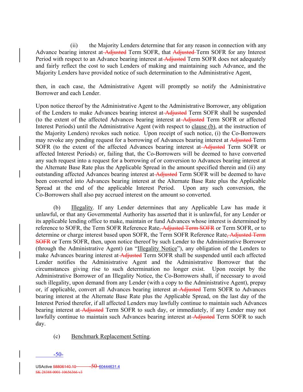 (ii) the Majority Lenders determine that for any reason in connection with any Advance bearing interest at Adjusted Term SOFR, that Adjusted Term SOFR for any Interest Period with respect to an Advance bearing interest at Adjusted Term SOFR does not adequately and fairly reflect the cost to such Lenders of making and maintaining such Advance, and the Majority Lenders have provided notice of such determination to the Administrative Agent, then, in each case, the Administrative Agent will promptly so notify the Administrative Borrower and each Lender. Upon notice thereof by the Administrative Agent to the Administrative Borrower, any obligation of the Lenders to make Advances bearing interest at Adjusted Term SOFR shall be suspended (to the extent of the affected Advances bearing interest at Adjusted Term SOFR or affected Interest Periods) until the Administrative Agent (with respect to clause (b), at the instruction of the Majority Lenders) revokes such notice. Upon receipt of such notice, (i) the Co-Borrowers may revoke any pending request for a borrowing of Advances bearing interest at Adjusted Term SOFR (to the extent of the affected Advances bearing interest at Adjusted Term SOFR or affected Interest Periods) or, failing that, the Co-Borrowers will be deemed to have converted any such request into a request for a borrowing of or conversion to Advances bearing interest at the Alternate Base Rate plus the Applicable Spread in the amount specified therein and (ii) any outstanding affected Advances bearing interest at Adjusted Term SOFR will be deemed to have been converted into Advances bearing interest at the Alternate Base Rate plus the Applicable Spread at the end of the applicable Interest Period. Upon any such conversion, the Co-Borrowers shall also pay accrued interest on the amount so converted. (b) Illegality. If any Lender determines that any Applicable Law has made it unlawful, or that any Governmental Authority has asserted that it is unlawful, for any Lender or its applicable lending office to make, maintain or fund Advances whose interest is determined by reference to SOFR, the Term SOFR Reference Rate, Adjusted Term SOFR or Term SOFR, or to determine or charge interest based upon SOFR, the Term SOFR Reference Rate, Adjusted Term SOFR or Term SOFR, then, upon notice thereof by such Lender to the Administrative Borrower (through the Administrative Agent) (an “Illegality Notice”), any obligation of the Lenders to make Advances bearing interest at Adjusted Term SOFR shall be suspended until each affected Lender notifies the Administrative Agent and the Administrative Borrower that the circumstances giving rise to such determination no longer exist. Upon receipt by the Administrative Borrower of an Illegality Notice, the Co-Borrowers shall, if necessary to avoid such illegality, upon demand from any Lender (with a copy to the Administrative Agent), prepay or, if applicable, convert all Advances bearing interest at Adjusted Term SOFR to Advances bearing interest at the Alternate Base Rate plus the Applicable Spread, on the last day of the Interest Period therefor, if all affected Lenders may lawfully continue to maintain such Advances bearing interest at Adjusted Term SOFR to such day, or immediately, if any Lender may not lawfully continue to maintain such Advances bearing interest at Adjusted Term SOFR to such day. (c) Benchmark Replacement Setting. -50- USActive 58806140.10 -50-60444631.4 SK 28388 0001 10656366 v3