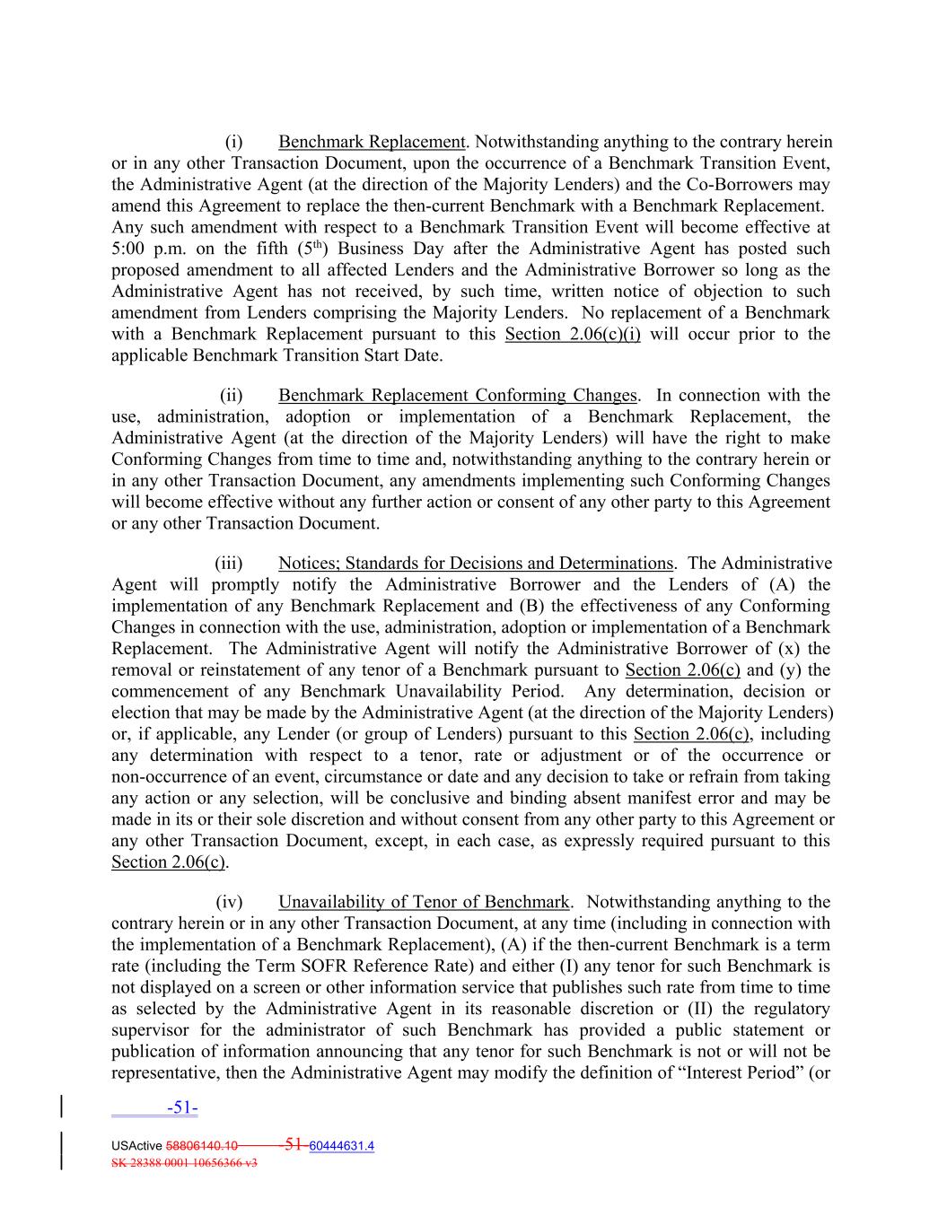 (i) Benchmark Replacement. Notwithstanding anything to the contrary herein or in any other Transaction Document, upon the occurrence of a Benchmark Transition Event, the Administrative Agent (at the direction of the Majority Lenders) and the Co-Borrowers may amend this Agreement to replace the then-current Benchmark with a Benchmark Replacement. Any such amendment with respect to a Benchmark Transition Event will become effective at 5:00 p.m. on the fifth (5th) Business Day after the Administrative Agent has posted such proposed amendment to all affected Lenders and the Administrative Borrower so long as the Administrative Agent has not received, by such time, written notice of objection to such amendment from Lenders comprising the Majority Lenders. No replacement of a Benchmark with a Benchmark Replacement pursuant to this Section 2.06(c)(i) will occur prior to the applicable Benchmark Transition Start Date. (ii) Benchmark Replacement Conforming Changes. In connection with the use, administration, adoption or implementation of a Benchmark Replacement, the Administrative Agent (at the direction of the Majority Lenders) will have the right to make Conforming Changes from time to time and, notwithstanding anything to the contrary herein or in any other Transaction Document, any amendments implementing such Conforming Changes will become effective without any further action or consent of any other party to this Agreement or any other Transaction Document. (iii) Notices; Standards for Decisions and Determinations. The Administrative Agent will promptly notify the Administrative Borrower and the Lenders of (A) the implementation of any Benchmark Replacement and (B) the effectiveness of any Conforming Changes in connection with the use, administration, adoption or implementation of a Benchmark Replacement. The Administrative Agent will notify the Administrative Borrower of (x) the removal or reinstatement of any tenor of a Benchmark pursuant to Section 2.06(c) and (y) the commencement of any Benchmark Unavailability Period. Any determination, decision or election that may be made by the Administrative Agent (at the direction of the Majority Lenders) or, if applicable, any Lender (or group of Lenders) pursuant to this Section 2.06(c), including any determination with respect to a tenor, rate or adjustment or of the occurrence or non-occurrence of an event, circumstance or date and any decision to take or refrain from taking any action or any selection, will be conclusive and binding absent manifest error and may be made in its or their sole discretion and without consent from any other party to this Agreement or any other Transaction Document, except, in each case, as expressly required pursuant to this Section 2.06(c). (iv) Unavailability of Tenor of Benchmark. Notwithstanding anything to the contrary herein or in any other Transaction Document, at any time (including in connection with the implementation of a Benchmark Replacement), (A) if the then-current Benchmark is a term rate (including the Term SOFR Reference Rate) and either (I) any tenor for such Benchmark is not displayed on a screen or other information service that publishes such rate from time to time as selected by the Administrative Agent in its reasonable discretion or (II) the regulatory supervisor for the administrator of such Benchmark has provided a public statement or publication of information announcing that any tenor for such Benchmark is not or will not be representative, then the Administrative Agent may modify the definition of “Interest Period” (or -51- USActive 58806140.10 -51-60444631.4 SK 28388 0001 10656366 v3