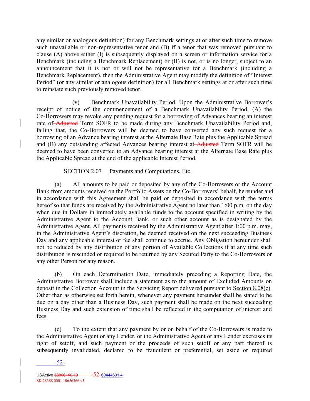 any similar or analogous definition) for any Benchmark settings at or after such time to remove such unavailable or non-representative tenor and (B) if a tenor that was removed pursuant to clause (A) above either (I) is subsequently displayed on a screen or information service for a Benchmark (including a Benchmark Replacement) or (II) is not, or is no longer, subject to an announcement that it is not or will not be representative for a Benchmark (including a Benchmark Replacement), then the Administrative Agent may modify the definition of “Interest Period” (or any similar or analogous definition) for all Benchmark settings at or after such time to reinstate such previously removed tenor. (v) Benchmark Unavailability Period. Upon the Administrative Borrower’s receipt of notice of the commencement of a Benchmark Unavailability Period, (A) the Co-Borrowers may revoke any pending request for a borrowing of Advances bearing an interest rate of Adjusted Term SOFR to be made during any Benchmark Unavailability Period and, failing that, the Co-Borrowers will be deemed to have converted any such request for a borrowing of an Advance bearing interest at the Alternate Base Rate plus the Applicable Spread and (B) any outstanding affected Advances bearing interest at Adjusted Term SOFR will be deemed to have been converted to an Advance bearing interest at the Alternate Base Rate plus the Applicable Spread at the end of the applicable Interest Period. SECTION 2.07 Payments and Computations, Etc. (a) All amounts to be paid or deposited by any of the Co‐Borrowers or the Account Bank from amounts received on the Portfolio Assets on the Co‐Borrowers’ behalf, hereunder and in accordance with this Agreement shall be paid or deposited in accordance with the terms hereof so that funds are received by the Administrative Agent no later than 1:00 p.m. on the day when due in Dollars in immediately available funds to the account specified in writing by the Administrative Agent to the Account Bank, or such other account as is designated by the Administrative Agent. All payments received by the Administrative Agent after 1:00 p.m. may, in the Administrative Agent’s discretion, be deemed received on the next succeeding Business Day and any applicable interest or fee shall continue to accrue. Any Obligation hereunder shall not be reduced by any distribution of any portion of Available Collections if at any time such distribution is rescinded or required to be returned by any Secured Party to the Co‐Borrowers or any other Person for any reason. (b) On each Determination Date, immediately preceding a Reporting Date, the Administrative Borrower shall include a statement as to the amount of Excluded Amounts on deposit in the Collection Account in the Servicing Report delivered pursuant to Section 8.08(c). Other than as otherwise set forth herein, whenever any payment hereunder shall be stated to be due on a day other than a Business Day, such payment shall be made on the next succeeding Business Day and such extension of time shall be reflected in the computation of interest and fees. (c) To the extent that any payment by or on behalf of the Co‐Borrowers is made to the Administrative Agent or any Lender, or the Administrative Agent or any Lender exercises its right of setoff, and such payment or the proceeds of such setoff or any part thereof is subsequently invalidated, declared to be fraudulent or preferential, set aside or required -52- USActive 58806140.10 -52-60444631.4 SK 28388 0001 10656366 v3