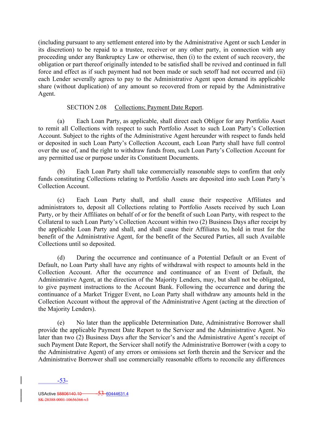 (including pursuant to any settlement entered into by the Administrative Agent or such Lender in its discretion) to be repaid to a trustee, receiver or any other party, in connection with any proceeding under any Bankruptcy Law or otherwise, then (i) to the extent of such recovery, the obligation or part thereof originally intended to be satisfied shall be revived and continued in full force and effect as if such payment had not been made or such setoff had not occurred and (ii) each Lender severally agrees to pay to the Administrative Agent upon demand its applicable share (without duplication) of any amount so recovered from or repaid by the Administrative Agent. SECTION 2.08 Collections; Payment Date Report. (a) Each Loan Party, as applicable, shall direct each Obligor for any Portfolio Asset to remit all Collections with respect to such Portfolio Asset to such Loan Party’s Collection Account. Subject to the rights of the Administrative Agent hereunder with respect to funds held or deposited in such Loan Party’s Collection Account, each Loan Party shall have full control over the use of, and the right to withdraw funds from, such Loan Party’s Collection Account for any permitted use or purpose under its Constituent Documents. (b) Each Loan Party shall take commercially reasonable steps to confirm that only funds constituting Collections relating to Portfolio Assets are deposited into such Loan Party’s Collection Account. (c) Each Loan Party shall, and shall cause their respective Affiliates and administrators to, deposit all Collections relating to Portfolio Assets received by such Loan Party, or by their Affiliates on behalf of or for the benefit of such Loan Party, with respect to the Collateral to such Loan Party’s Collection Account within two (2) Business Days after receipt by the applicable Loan Party and shall, and shall cause their Affiliates to, hold in trust for the benefit of the Administrative Agent, for the benefit of the Secured Parties, all such Available Collections until so deposited. (d) During the occurrence and continuance of a Potential Default or an Event of Default, no Loan Party shall have any rights of withdrawal with respect to amounts held in the Collection Account. After the occurrence and continuance of an Event of Default, the Administrative Agent, at the direction of the Majority Lenders, may, but shall not be obligated, to give payment instructions to the Account Bank. Following the occurrence and during the continuance of a Market Trigger Event, no Loan Party shall withdraw any amounts held in the Collection Account without the approval of the Administrative Agent (acting at the direction of the Majority Lenders). (e) No later than the applicable Determination Date, Administrative Borrower shall provide the applicable Payment Date Report to the Servicer and the Administrative Agent. No later than two (2) Business Days after the Servicer’s and the Administrative Agent’s receipt of such Payment Date Report, the Servicer shall notify the Administrative Borrower (with a copy to the Administrative Agent) of any errors or omissions set forth therein and the Servicer and the Administrative Borrower shall use commercially reasonable efforts to reconcile any differences -53- USActive 58806140.10 -53-60444631.4 SK 28388 0001 10656366 v3
