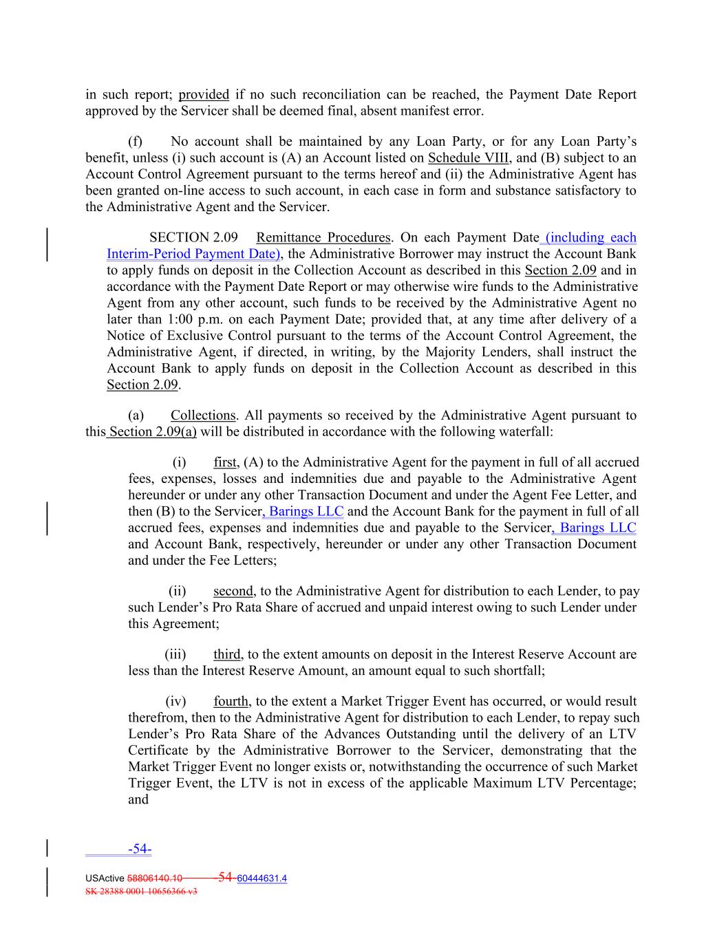 in such report; provided if no such reconciliation can be reached, the Payment Date Report approved by the Servicer shall be deemed final, absent manifest error. (f) No account shall be maintained by any Loan Party, or for any Loan Party’s benefit, unless (i) such account is (A) an Account listed on Schedule VIII, and (B) subject to an Account Control Agreement pursuant to the terms hereof and (ii) the Administrative Agent has been granted on-line access to such account, in each case in form and substance satisfactory to the Administrative Agent and the Servicer. SECTION 2.09 Remittance Procedures. On each Payment Date (including each Interim-Period Payment Date), the Administrative Borrower may instruct the Account Bank to apply funds on deposit in the Collection Account as described in this Section 2.09 and in accordance with the Payment Date Report or may otherwise wire funds to the Administrative Agent from any other account, such funds to be received by the Administrative Agent no later than 1:00 p.m. on each Payment Date; provided that, at any time after delivery of a Notice of Exclusive Control pursuant to the terms of the Account Control Agreement, the Administrative Agent, if directed, in writing, by the Majority Lenders, shall instruct the Account Bank to apply funds on deposit in the Collection Account as described in this Section 2.09. (a) Collections. All payments so received by the Administrative Agent pursuant to this Section 2.09(a) will be distributed in accordance with the following waterfall: (i) first, (A) to the Administrative Agent for the payment in full of all accrued fees, expenses, losses and indemnities due and payable to the Administrative Agent hereunder or under any other Transaction Document and under the Agent Fee Letter, and then (B) to the Servicer, Barings LLC and the Account Bank for the payment in full of all accrued fees, expenses and indemnities due and payable to the Servicer, Barings LLC and Account Bank, respectively, hereunder or under any other Transaction Document and under the Fee Letters; (ii) second, to the Administrative Agent for distribution to each Lender, to pay such Lender’s Pro Rata Share of accrued and unpaid interest owing to such Lender under this Agreement; (iii) third, to the extent amounts on deposit in the Interest Reserve Account are less than the Interest Reserve Amount, an amount equal to such shortfall; (iv) fourth, to the extent a Market Trigger Event has occurred, or would result therefrom, then to the Administrative Agent for distribution to each Lender, to repay such Lender’s Pro Rata Share of the Advances Outstanding until the delivery of an LTV Certificate by the Administrative Borrower to the Servicer, demonstrating that the Market Trigger Event no longer exists or, notwithstanding the occurrence of such Market Trigger Event, the LTV is not in excess of the applicable Maximum LTV Percentage; and -54- USActive 58806140.10 -54-60444631.4 SK 28388 0001 10656366 v3