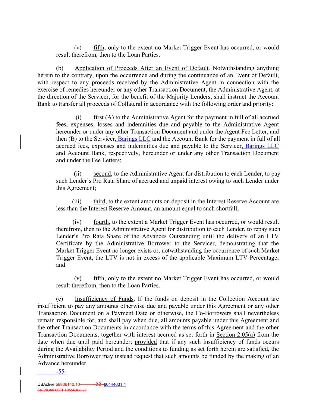 (v) fifth, only to the extent no Market Trigger Event has occurred, or would result therefrom, then to the Loan Parties. (b) Application of Proceeds After an Event of Default. Notwithstanding anything herein to the contrary, upon the occurrence and during the continuance of an Event of Default, with respect to any proceeds received by the Administrative Agent in connection with the exercise of remedies hereunder or any other Transaction Document, the Administrative Agent, at the direction of the Servicer, for the benefit of the Majority Lenders, shall instruct the Account Bank to transfer all proceeds of Collateral in accordance with the following order and priority: (i) first (A) to the Administrative Agent for the payment in full of all accrued fees, expenses, losses and indemnities due and payable to the Administrative Agent hereunder or under any other Transaction Document and under the Agent Fee Letter, and then (B) to the Servicer, Barings LLC and the Account Bank for the payment in full of all accrued fees, expenses and indemnities due and payable to the Servicer, Barings LLC and Account Bank, respectively, hereunder or under any other Transaction Document and under the Fee Letters; (ii) second, to the Administrative Agent for distribution to each Lender, to pay such Lender’s Pro Rata Share of accrued and unpaid interest owing to such Lender under this Agreement; (iii) third, to the extent amounts on deposit in the Interest Reserve Account are less than the Interest Reserve Amount, an amount equal to such shortfall; (iv) fourth, to the extent a Market Trigger Event has occurred, or would result therefrom, then to the Administrative Agent for distribution to each Lender, to repay such Lender’s Pro Rata Share of the Advances Outstanding until the delivery of an LTV Certificate by the Administrative Borrower to the Servicer, demonstrating that the Market Trigger Event no longer exists or, notwithstanding the occurrence of such Market Trigger Event, the LTV is not in excess of the applicable Maximum LTV Percentage; and (v) fifth, only to the extent no Market Trigger Event has occurred, or would result therefrom, then to the Loan Parties. (c) Insufficiency of Funds. If the funds on deposit in the Collection Account are insufficient to pay any amounts otherwise due and payable under this Agreement or any other Transaction Document on a Payment Date or otherwise, the Co‐Borrowers shall nevertheless remain responsible for, and shall pay when due, all amounts payable under this Agreement and the other Transaction Documents in accordance with the terms of this Agreement and the other Transaction Documents, together with interest accrued as set forth in Section 2.05(a) from the date when due until paid hereunder; provided that if any such insufficiency of funds occurs during the Availability Period and the conditions to funding as set forth herein are satisfied, the Administrative Borrower may instead request that such amounts be funded by the making of an Advance hereunder. -55- USActive 58806140.10 -55-60444631.4 SK 28388 0001 10656366 v3
