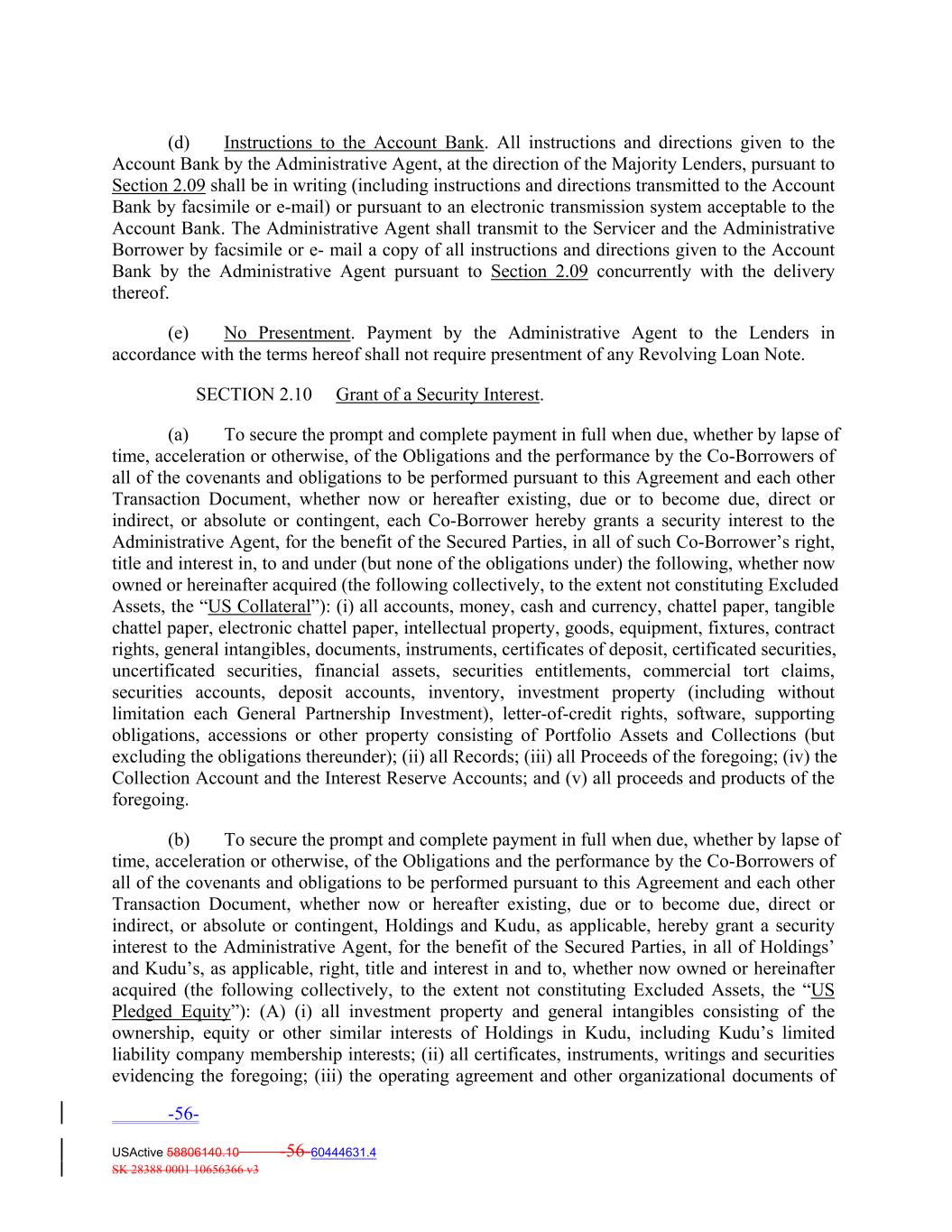 (d) Instructions to the Account Bank. All instructions and directions given to the Account Bank by the Administrative Agent, at the direction of the Majority Lenders, pursuant to Section 2.09 shall be in writing (including instructions and directions transmitted to the Account Bank by facsimile or e‐mail) or pursuant to an electronic transmission system acceptable to the Account Bank. The Administrative Agent shall transmit to the Servicer and the Administrative Borrower by facsimile or e‐ mail a copy of all instructions and directions given to the Account Bank by the Administrative Agent pursuant to Section 2.09 concurrently with the delivery thereof. (e) No Presentment. Payment by the Administrative Agent to the Lenders in accordance with the terms hereof shall not require presentment of any Revolving Loan Note. SECTION 2.10 Grant of a Security Interest. (a) To secure the prompt and complete payment in full when due, whether by lapse of time, acceleration or otherwise, of the Obligations and the performance by the Co‐Borrowers of all of the covenants and obligations to be performed pursuant to this Agreement and each other Transaction Document, whether now or hereafter existing, due or to become due, direct or indirect, or absolute or contingent, each Co‐Borrower hereby grants a security interest to the Administrative Agent, for the benefit of the Secured Parties, in all of such Co‐Borrower’s right, title and interest in, to and under (but none of the obligations under) the following, whether now owned or hereinafter acquired (the following collectively, to the extent not constituting Excluded Assets, the “US Collateral”): (i) all accounts, money, cash and currency, chattel paper, tangible chattel paper, electronic chattel paper, intellectual property, goods, equipment, fixtures, contract rights, general intangibles, documents, instruments, certificates of deposit, certificated securities, uncertificated securities, financial assets, securities entitlements, commercial tort claims, securities accounts, deposit accounts, inventory, investment property (including without limitation each General Partnership Investment), letter‐of‐credit rights, software, supporting obligations, accessions or other property consisting of Portfolio Assets and Collections (but excluding the obligations thereunder); (ii) all Records; (iii) all Proceeds of the foregoing; (iv) the Collection Account and the Interest Reserve Accounts; and (v) all proceeds and products of the foregoing. (b) To secure the prompt and complete payment in full when due, whether by lapse of time, acceleration or otherwise, of the Obligations and the performance by the Co‐Borrowers of all of the covenants and obligations to be performed pursuant to this Agreement and each other Transaction Document, whether now or hereafter existing, due or to become due, direct or indirect, or absolute or contingent, Holdings and Kudu, as applicable, hereby grant a security interest to the Administrative Agent, for the benefit of the Secured Parties, in all of Holdings’ and Kudu’s, as applicable, right, title and interest in and to, whether now owned or hereinafter acquired (the following collectively, to the extent not constituting Excluded Assets, the “US Pledged Equity”): (A) (i) all investment property and general intangibles consisting of the ownership, equity or other similar interests of Holdings in Kudu, including Kudu’s limited liability company membership interests; (ii) all certificates, instruments, writings and securities evidencing the foregoing; (iii) the operating agreement and other organizational documents of -56- USActive 58806140.10 -56-60444631.4 SK 28388 0001 10656366 v3