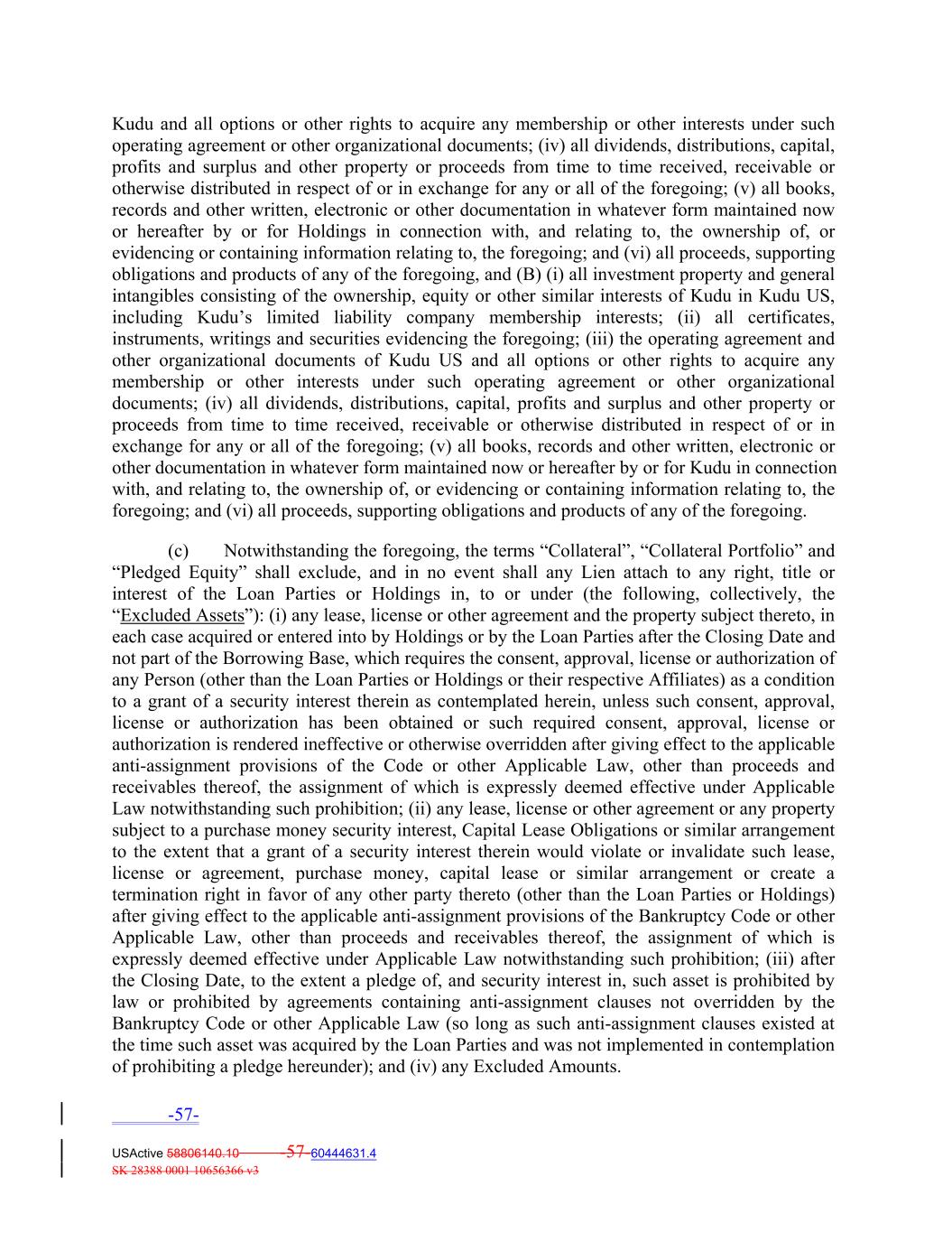Kudu and all options or other rights to acquire any membership or other interests under such operating agreement or other organizational documents; (iv) all dividends, distributions, capital, profits and surplus and other property or proceeds from time to time received, receivable or otherwise distributed in respect of or in exchange for any or all of the foregoing; (v) all books, records and other written, electronic or other documentation in whatever form maintained now or hereafter by or for Holdings in connection with, and relating to, the ownership of, or evidencing or containing information relating to, the foregoing; and (vi) all proceeds, supporting obligations and products of any of the foregoing, and (B) (i) all investment property and general intangibles consisting of the ownership, equity or other similar interests of Kudu in Kudu US, including Kudu’s limited liability company membership interests; (ii) all certificates, instruments, writings and securities evidencing the foregoing; (iii) the operating agreement and other organizational documents of Kudu US and all options or other rights to acquire any membership or other interests under such operating agreement or other organizational documents; (iv) all dividends, distributions, capital, profits and surplus and other property or proceeds from time to time received, receivable or otherwise distributed in respect of or in exchange for any or all of the foregoing; (v) all books, records and other written, electronic or other documentation in whatever form maintained now or hereafter by or for Kudu in connection with, and relating to, the ownership of, or evidencing or containing information relating to, the foregoing; and (vi) all proceeds, supporting obligations and products of any of the foregoing. (c) Notwithstanding the foregoing, the terms “Collateral”, “Collateral Portfolio” and “Pledged Equity” shall exclude, and in no event shall any Lien attach to any right, title or interest of the Loan Parties or Holdings in, to or under (the following, collectively, the “Excluded Assets”): (i) any lease, license or other agreement and the property subject thereto, in each case acquired or entered into by Holdings or by the Loan Parties after the Closing Date and not part of the Borrowing Base, which requires the consent, approval, license or authorization of any Person (other than the Loan Parties or Holdings or their respective Affiliates) as a condition to a grant of a security interest therein as contemplated herein, unless such consent, approval, license or authorization has been obtained or such required consent, approval, license or authorization is rendered ineffective or otherwise overridden after giving effect to the applicable anti‐assignment provisions of the Code or other Applicable Law, other than proceeds and receivables thereof, the assignment of which is expressly deemed effective under Applicable Law notwithstanding such prohibition; (ii) any lease, license or other agreement or any property subject to a purchase money security interest, Capital Lease Obligations or similar arrangement to the extent that a grant of a security interest therein would violate or invalidate such lease, license or agreement, purchase money, capital lease or similar arrangement or create a termination right in favor of any other party thereto (other than the Loan Parties or Holdings) after giving effect to the applicable anti‐assignment provisions of the Bankruptcy Code or other Applicable Law, other than proceeds and receivables thereof, the assignment of which is expressly deemed effective under Applicable Law notwithstanding such prohibition; (iii) after the Closing Date, to the extent a pledge of, and security interest in, such asset is prohibited by law or prohibited by agreements containing anti‐assignment clauses not overridden by the Bankruptcy Code or other Applicable Law (so long as such anti‐assignment clauses existed at the time such asset was acquired by the Loan Parties and was not implemented in contemplation of prohibiting a pledge hereunder); and (iv) any Excluded Amounts. -57- USActive 58806140.10 -57-60444631.4 SK 28388 0001 10656366 v3
