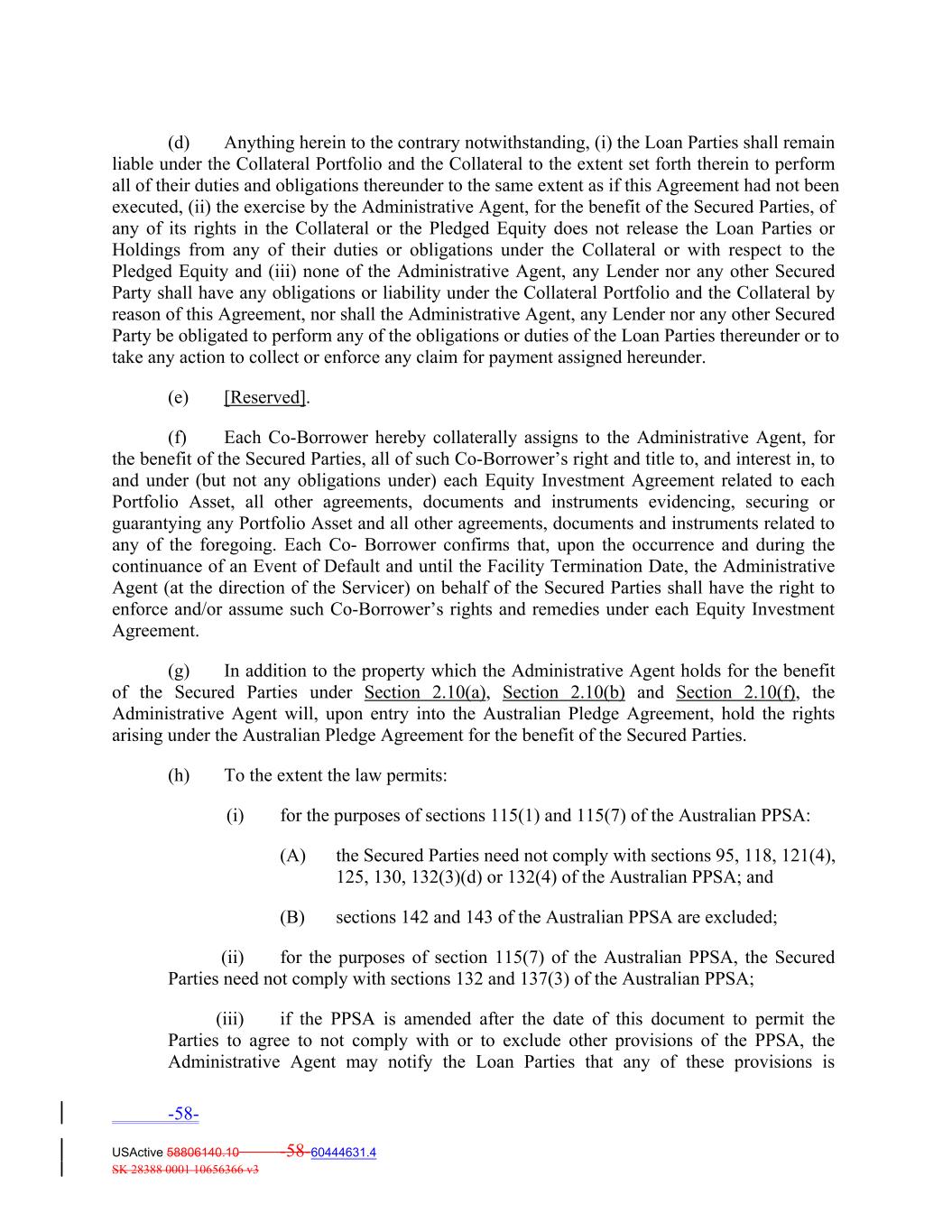 (d) Anything herein to the contrary notwithstanding, (i) the Loan Parties shall remain liable under the Collateral Portfolio and the Collateral to the extent set forth therein to perform all of their duties and obligations thereunder to the same extent as if this Agreement had not been executed, (ii) the exercise by the Administrative Agent, for the benefit of the Secured Parties, of any of its rights in the Collateral or the Pledged Equity does not release the Loan Parties or Holdings from any of their duties or obligations under the Collateral or with respect to the Pledged Equity and (iii) none of the Administrative Agent, any Lender nor any other Secured Party shall have any obligations or liability under the Collateral Portfolio and the Collateral by reason of this Agreement, nor shall the Administrative Agent, any Lender nor any other Secured Party be obligated to perform any of the obligations or duties of the Loan Parties thereunder or to take any action to collect or enforce any claim for payment assigned hereunder. (e) [Reserved]. (f) Each Co‐Borrower hereby collaterally assigns to the Administrative Agent, for the benefit of the Secured Parties, all of such Co‐Borrower’s right and title to, and interest in, to and under (but not any obligations under) each Equity Investment Agreement related to each Portfolio Asset, all other agreements, documents and instruments evidencing, securing or guarantying any Portfolio Asset and all other agreements, documents and instruments related to any of the foregoing. Each Co‐ Borrower confirms that, upon the occurrence and during the continuance of an Event of Default and until the Facility Termination Date, the Administrative Agent (at the direction of the Servicer) on behalf of the Secured Parties shall have the right to enforce and/or assume such Co‐Borrower’s rights and remedies under each Equity Investment Agreement. (g) In addition to the property which the Administrative Agent holds for the benefit of the Secured Parties under Section 2.10(a), Section 2.10(b) and Section 2.10(f), the Administrative Agent will, upon entry into the Australian Pledge Agreement, hold the rights arising under the Australian Pledge Agreement for the benefit of the Secured Parties. (h) To the extent the law permits: (i) for the purposes of sections 115(1) and 115(7) of the Australian PPSA: (A) the Secured Parties need not comply with sections 95, 118, 121(4), 125, 130, 132(3)(d) or 132(4) of the Australian PPSA; and (B) sections 142 and 143 of the Australian PPSA are excluded; (ii) for the purposes of section 115(7) of the Australian PPSA, the Secured Parties need not comply with sections 132 and 137(3) of the Australian PPSA; (iii) if the PPSA is amended after the date of this document to permit the Parties to agree to not comply with or to exclude other provisions of the PPSA, the Administrative Agent may notify the Loan Parties that any of these provisions is -58- USActive 58806140.10 -58-60444631.4 SK 28388 0001 10656366 v3
