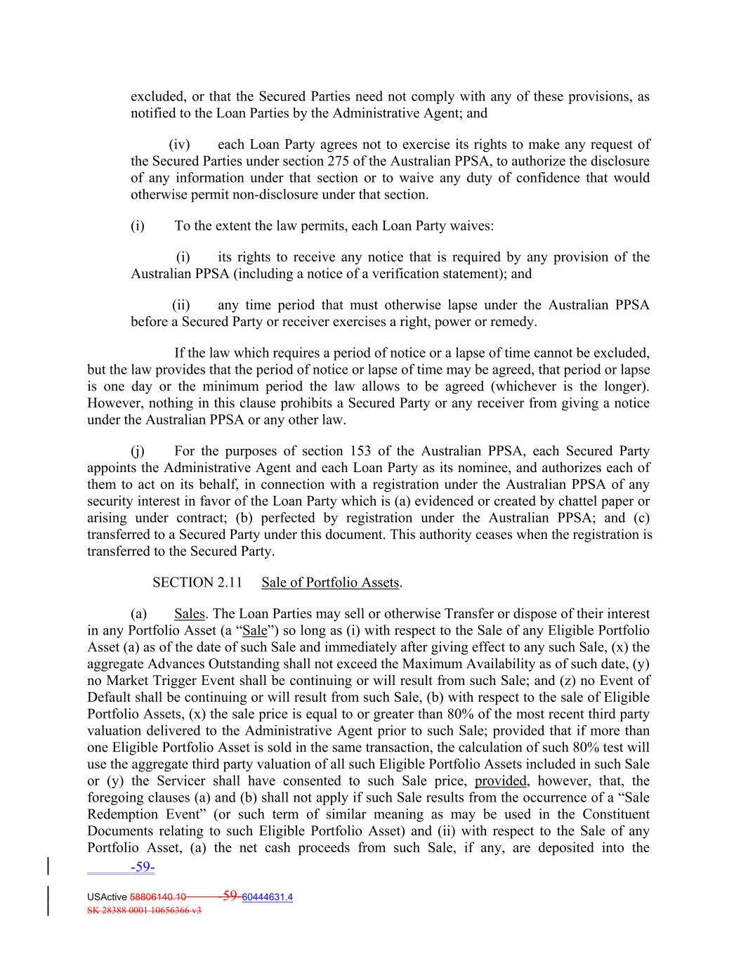 excluded, or that the Secured Parties need not comply with any of these provisions, as notified to the Loan Parties by the Administrative Agent; and (iv) each Loan Party agrees not to exercise its rights to make any request of the Secured Parties under section 275 of the Australian PPSA, to authorize the disclosure of any information under that section or to waive any duty of confidence that would otherwise permit non‐disclosure under that section. (i) To the extent the law permits, each Loan Party waives: (i) its rights to receive any notice that is required by any provision of the Australian PPSA (including a notice of a verification statement); and (ii) any time period that must otherwise lapse under the Australian PPSA before a Secured Party or receiver exercises a right, power or remedy. If the law which requires a period of notice or a lapse of time cannot be excluded, but the law provides that the period of notice or lapse of time may be agreed, that period or lapse is one day or the minimum period the law allows to be agreed (whichever is the longer). However, nothing in this clause prohibits a Secured Party or any receiver from giving a notice under the Australian PPSA or any other law. (j) For the purposes of section 153 of the Australian PPSA, each Secured Party appoints the Administrative Agent and each Loan Party as its nominee, and authorizes each of them to act on its behalf, in connection with a registration under the Australian PPSA of any security interest in favor of the Loan Party which is (a) evidenced or created by chattel paper or arising under contract; (b) perfected by registration under the Australian PPSA; and (c) transferred to a Secured Party under this document. This authority ceases when the registration is transferred to the Secured Party. SECTION 2.11 Sale of Portfolio Assets. (a) Sales. The Loan Parties may sell or otherwise Transfer or dispose of their interest in any Portfolio Asset (a “Sale”) so long as (i) with respect to the Sale of any Eligible Portfolio Asset (a) as of the date of such Sale and immediately after giving effect to any such Sale, (x) the aggregate Advances Outstanding shall not exceed the Maximum Availability as of such date, (y) no Market Trigger Event shall be continuing or will result from such Sale; and (z) no Event of Default shall be continuing or will result from such Sale, (b) with respect to the sale of Eligible Portfolio Assets, (x) the sale price is equal to or greater than 80% of the most recent third party valuation delivered to the Administrative Agent prior to such Sale; provided that if more than one Eligible Portfolio Asset is sold in the same transaction, the calculation of such 80% test will use the aggregate third party valuation of all such Eligible Portfolio Assets included in such Sale or (y) the Servicer shall have consented to such Sale price, provided, however, that, the foregoing clauses (a) and (b) shall not apply if such Sale results from the occurrence of a “Sale Redemption Event” (or such term of similar meaning as may be used in the Constituent Documents relating to such Eligible Portfolio Asset) and (ii) with respect to the Sale of any Portfolio Asset, (a) the net cash proceeds from such Sale, if any, are deposited into the -59- USActive 58806140.10 -59-60444631.4 SK 28388 0001 10656366 v3