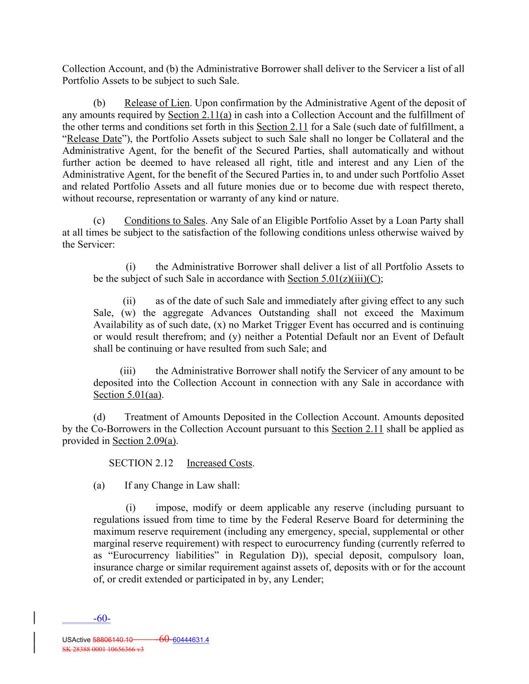 Collection Account, and (b) the Administrative Borrower shall deliver to the Servicer a list of all Portfolio Assets to be subject to such Sale. (b) Release of Lien. Upon confirmation by the Administrative Agent of the deposit of any amounts required by Section 2.11(a) in cash into a Collection Account and the fulfillment of the other terms and conditions set forth in this Section 2.11 for a Sale (such date of fulfillment, a “Release Date”), the Portfolio Assets subject to such Sale shall no longer be Collateral and the Administrative Agent, for the benefit of the Secured Parties, shall automatically and without further action be deemed to have released all right, title and interest and any Lien of the Administrative Agent, for the benefit of the Secured Parties in, to and under such Portfolio Asset and related Portfolio Assets and all future monies due or to become due with respect thereto, without recourse, representation or warranty of any kind or nature. (c) Conditions to Sales. Any Sale of an Eligible Portfolio Asset by a Loan Party shall at all times be subject to the satisfaction of the following conditions unless otherwise waived by the Servicer: (i) the Administrative Borrower shall deliver a list of all Portfolio Assets to be the subject of such Sale in accordance with Section 5.01(z)(iii)(C); (ii) as of the date of such Sale and immediately after giving effect to any such Sale, (w) the aggregate Advances Outstanding shall not exceed the Maximum Availability as of such date, (x) no Market Trigger Event has occurred and is continuing or would result therefrom; and (y) neither a Potential Default nor an Event of Default shall be continuing or have resulted from such Sale; and (iii) the Administrative Borrower shall notify the Servicer of any amount to be deposited into the Collection Account in connection with any Sale in accordance with Section 5.01(aa). (d) Treatment of Amounts Deposited in the Collection Account. Amounts deposited by the Co‐Borrowers in the Collection Account pursuant to this Section 2.11 shall be applied as provided in Section 2.09(a). SECTION 2.12 Increased Costs. (a) If any Change in Law shall: (i) impose, modify or deem applicable any reserve (including pursuant to regulations issued from time to time by the Federal Reserve Board for determining the maximum reserve requirement (including any emergency, special, supplemental or other marginal reserve requirement) with respect to eurocurrency funding (currently referred to as “Eurocurrency liabilities” in Regulation D)), special deposit, compulsory loan, insurance charge or similar requirement against assets of, deposits with or for the account of, or credit extended or participated in by, any Lender; -60- USActive 58806140.10 -60-60444631.4 SK 28388 0001 10656366 v3