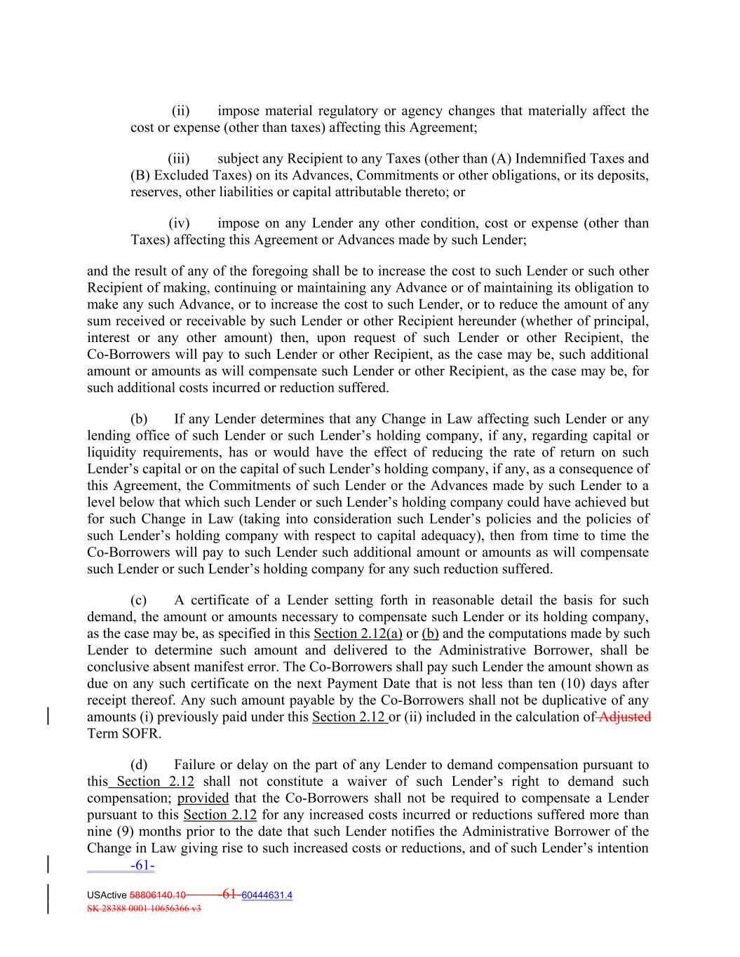(ii) impose material regulatory or agency changes that materially affect the cost or expense (other than taxes) affecting this Agreement; (iii) subject any Recipient to any Taxes (other than (A) Indemnified Taxes and (B) Excluded Taxes) on its Advances, Commitments or other obligations, or its deposits, reserves, other liabilities or capital attributable thereto; or (iv) impose on any Lender any other condition, cost or expense (other than Taxes) affecting this Agreement or Advances made by such Lender; and the result of any of the foregoing shall be to increase the cost to such Lender or such other Recipient of making, continuing or maintaining any Advance or of maintaining its obligation to make any such Advance, or to increase the cost to such Lender, or to reduce the amount of any sum received or receivable by such Lender or other Recipient hereunder (whether of principal, interest or any other amount) then, upon request of such Lender or other Recipient, the Co-Borrowers will pay to such Lender or other Recipient, as the case may be, such additional amount or amounts as will compensate such Lender or other Recipient, as the case may be, for such additional costs incurred or reduction suffered. (b) If any Lender determines that any Change in Law affecting such Lender or any lending office of such Lender or such Lender’s holding company, if any, regarding capital or liquidity requirements, has or would have the effect of reducing the rate of return on such Lender’s capital or on the capital of such Lender’s holding company, if any, as a consequence of this Agreement, the Commitments of such Lender or the Advances made by such Lender to a level below that which such Lender or such Lender’s holding company could have achieved but for such Change in Law (taking into consideration such Lender’s policies and the policies of such Lender’s holding company with respect to capital adequacy), then from time to time the Co-Borrowers will pay to such Lender such additional amount or amounts as will compensate such Lender or such Lender’s holding company for any such reduction suffered. (c) A certificate of a Lender setting forth in reasonable detail the basis for such demand, the amount or amounts necessary to compensate such Lender or its holding company, as the case may be, as specified in this Section 2.12(a) or (b) and the computations made by such Lender to determine such amount and delivered to the Administrative Borrower, shall be conclusive absent manifest error. The Co-Borrowers shall pay such Lender the amount shown as due on any such certificate on the next Payment Date that is not less than ten (10) days after receipt thereof. Any such amount payable by the Co‐Borrowers shall not be duplicative of any amounts (i) previously paid under this Section 2.12 or (ii) included in the calculation of Adjusted Term SOFR. (d) Failure or delay on the part of any Lender to demand compensation pursuant to this Section 2.12 shall not constitute a waiver of such Lender’s right to demand such compensation; provided that the Co‐Borrowers shall not be required to compensate a Lender pursuant to this Section 2.12 for any increased costs incurred or reductions suffered more than nine (9) months prior to the date that such Lender notifies the Administrative Borrower of the Change in Law giving rise to such increased costs or reductions, and of such Lender’s intention -61- USActive 58806140.10 -61-60444631.4 SK 28388 0001 10656366 v3