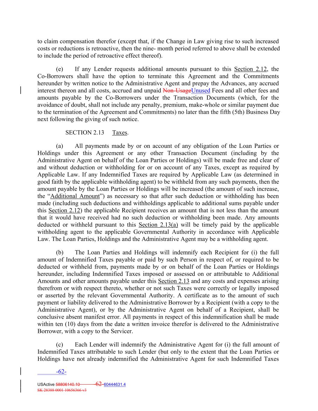 to claim compensation therefor (except that, if the Change in Law giving rise to such increased costs or reductions is retroactive, then the nine‐ month period referred to above shall be extended to include the period of retroactive effect thereof). (e) If any Lender requests additional amounts pursuant to this Section 2.12, the Co‐Borrowers shall have the option to terminate this Agreement and the Commitments hereunder by written notice to the Administrative Agent and prepay the Advances, any accrued interest thereon and all costs, accrued and unpaid Non‐UsageUnused Fees and all other fees and amounts payable by the Co‐Borrowers under the Transaction Documents (which, for the avoidance of doubt, shall not include any penalty, premium, make‐whole or similar payment due to the termination of the Agreement and Commitments) no later than the fifth (5th) Business Day next following the giving of such notice. SECTION 2.13 Taxes. (a) All payments made by or on account of any obligation of the Loan Parties or Holdings under this Agreement or any other Transaction Document (including by the Administrative Agent on behalf of the Loan Parties or Holdings) will be made free and clear of and without deduction or withholding for or on account of any Taxes, except as required by Applicable Law. If any Indemnified Taxes are required by Applicable Law (as determined in good faith by the applicable withholding agent) to be withheld from any such payments, then the amount payable by the Loan Parties or Holdings will be increased (the amount of such increase, the “Additional Amount”) as necessary so that after such deduction or withholding has been made (including such deductions and withholdings applicable to additional sums payable under this Section 2.12) the applicable Recipient receives an amount that is not less than the amount that it would have received had no such deduction or withholding been made. Any amounts deducted or withheld pursuant to this Section 2.13(a) will be timely paid by the applicable withholding agent to the applicable Governmental Authority in accordance with Applicable Law. The Loan Parties, Holdings and the Administrative Agent may be a withholding agent. (b) The Loan Parties and Holdings will indemnify each Recipient for (i) the full amount of Indemnified Taxes payable or paid by such Person in respect of, or required to be deducted or withheld from, payments made by or on behalf of the Loan Parties or Holdings hereunder, including Indemnified Taxes imposed or assessed on or attributable to Additional Amounts and other amounts payable under this Section 2.13 and any costs and expenses arising therefrom or with respect thereto, whether or not such Taxes were correctly or legally imposed or asserted by the relevant Governmental Authority. A certificate as to the amount of such payment or liability delivered to the Administrative Borrower by a Recipient (with a copy to the Administrative Agent), or by the Administrative Agent on behalf of a Recipient, shall be conclusive absent manifest error. All payments in respect of this indemnification shall be made within ten (10) days from the date a written invoice therefor is delivered to the Administrative Borrower, with a copy to the Servicer. (c) Each Lender will indemnify the Administrative Agent for (i) the full amount of Indemnified Taxes attributable to such Lender (but only to the extent that the Loan Parties or Holdings have not already indemnified the Administrative Agent for such Indemnified Taxes -62- USActive 58806140.10 -62-60444631.4 SK 28388 0001 10656366 v3