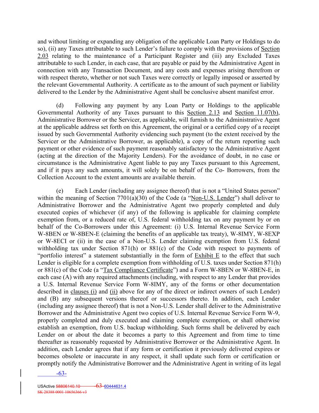 and without limiting or expanding any obligation of the applicable Loan Party or Holdings to do so), (ii) any Taxes attributable to such Lender’s failure to comply with the provisions of Section 2.03 relating to the maintenance of a Participant Register and (iii) any Excluded Taxes attributable to such Lender, in each case, that are payable or paid by the Administrative Agent in connection with any Transaction Document, and any costs and expenses arising therefrom or with respect thereto, whether or not such Taxes were correctly or legally imposed or asserted by the relevant Governmental Authority. A certificate as to the amount of such payment or liability delivered to the Lender by the Administrative Agent shall be conclusive absent manifest error. (d) Following any payment by any Loan Party or Holdings to the applicable Governmental Authority of any Taxes pursuant to this Section 2.13 and Section 11.07(b), Administrative Borrower or the Servicer, as applicable, will furnish to the Administrative Agent at the applicable address set forth on this Agreement, the original or a certified copy of a receipt issued by such Governmental Authority evidencing such payment (to the extent received by the Servicer or the Administrative Borrower, as applicable), a copy of the return reporting such payment or other evidence of such payment reasonably satisfactory to the Administrative Agent (acting at the direction of the Majority Lenders). For the avoidance of doubt, in no case or circumstance is the Administrative Agent liable to pay any Taxes pursuant to this Agreement, and if it pays any such amounts, it will solely be on behalf of the Co‐ Borrowers, from the Collection Account to the extent amounts are available therein. (e) Each Lender (including any assignee thereof) that is not a “United States person” within the meaning of Section 7701(a)(30) of the Code (a “Non‐U.S. Lender”) shall deliver to Administrative Borrower and the Administrative Agent two properly completed and duly executed copies of whichever (if any) of the following is applicable for claiming complete exemption from, or a reduced rate of, U.S. federal withholding tax on any payment by or on behalf of the Co‐Borrowers under this Agreement: (i) U.S. Internal Revenue Service Form W‐8BEN or W‐8BEN‐E (claiming the benefits of an applicable tax treaty), W‐8IMY, W‐8EXP or W‐8ECI or (ii) in the case of a Non‐U.S. Lender claiming exemption from U.S. federal withholding tax under Section 871(h) or 881(c) of the Code with respect to payments of “portfolio interest” a statement substantially in the form of Exhibit E to the effect that such Lender is eligible for a complete exemption from withholding of U.S. taxes under Section 871(h) or 881(c) of the Code (a “Tax Compliance Certificate”) and a Form W‐8BEN or W‐8BEN‐E, in each case (A) with any required attachments (including, with respect to any Lender that provides a U.S. Internal Revenue Service Form W‐8IMY, any of the forms or other documentation described in clauses (i) and (ii) above for any of the direct or indirect owners of such Lender) and (B) any subsequent versions thereof or successors thereto. In addition, each Lender (including any assignee thereof) that is not a Non‐U.S. Lender shall deliver to the Administrative Borrower and the Administrative Agent two copies of U.S. Internal Revenue Service Form W‐9, properly completed and duly executed and claiming complete exemption, or shall otherwise establish an exemption, from U.S. backup withholding. Such forms shall be delivered by each Lender on or about the date it becomes a party to this Agreement and from time to time thereafter as reasonably requested by Administrative Borrower or the Administrative Agent. In addition, each Lender agrees that if any form or certification it previously delivered expires or becomes obsolete or inaccurate in any respect, it shall update such form or certification or promptly notify the Administrative Borrower and the Administrative Agent in writing of its legal -63- USActive 58806140.10 -63-60444631.4 SK 28388 0001 10656366 v3