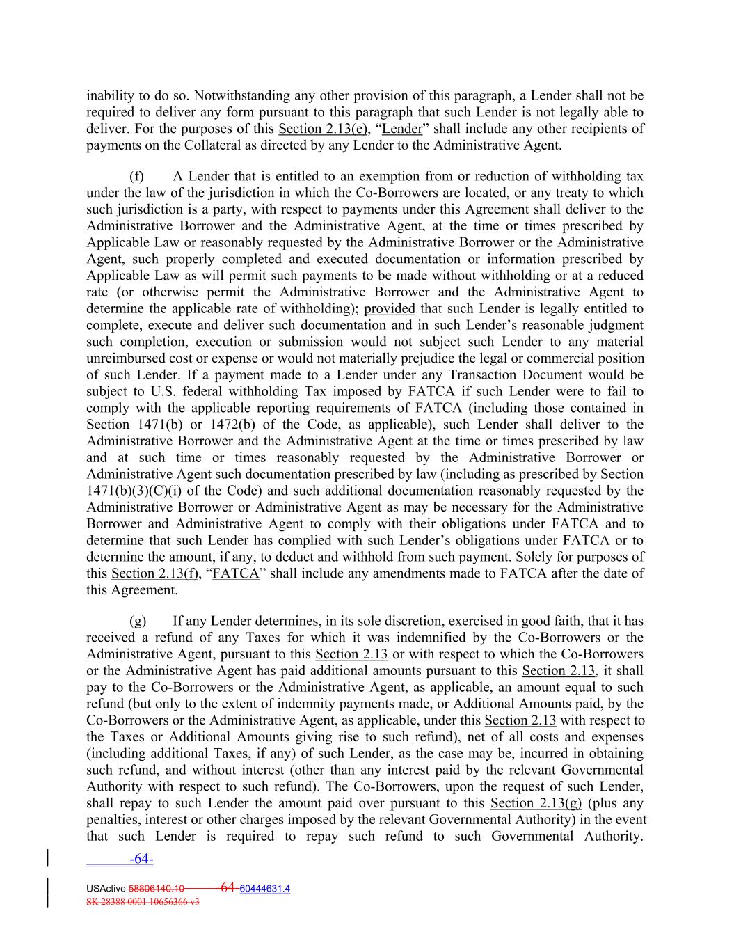 inability to do so. Notwithstanding any other provision of this paragraph, a Lender shall not be required to deliver any form pursuant to this paragraph that such Lender is not legally able to deliver. For the purposes of this Section 2.13(e), “Lender” shall include any other recipients of payments on the Collateral as directed by any Lender to the Administrative Agent. (f) A Lender that is entitled to an exemption from or reduction of withholding tax under the law of the jurisdiction in which the Co‐Borrowers are located, or any treaty to which such jurisdiction is a party, with respect to payments under this Agreement shall deliver to the Administrative Borrower and the Administrative Agent, at the time or times prescribed by Applicable Law or reasonably requested by the Administrative Borrower or the Administrative Agent, such properly completed and executed documentation or information prescribed by Applicable Law as will permit such payments to be made without withholding or at a reduced rate (or otherwise permit the Administrative Borrower and the Administrative Agent to determine the applicable rate of withholding); provided that such Lender is legally entitled to complete, execute and deliver such documentation and in such Lender’s reasonable judgment such completion, execution or submission would not subject such Lender to any material unreimbursed cost or expense or would not materially prejudice the legal or commercial position of such Lender. If a payment made to a Lender under any Transaction Document would be subject to U.S. federal withholding Tax imposed by FATCA if such Lender were to fail to comply with the applicable reporting requirements of FATCA (including those contained in Section 1471(b) or 1472(b) of the Code, as applicable), such Lender shall deliver to the Administrative Borrower and the Administrative Agent at the time or times prescribed by law and at such time or times reasonably requested by the Administrative Borrower or Administrative Agent such documentation prescribed by law (including as prescribed by Section 1471(b)(3)(C)(i) of the Code) and such additional documentation reasonably requested by the Administrative Borrower or Administrative Agent as may be necessary for the Administrative Borrower and Administrative Agent to comply with their obligations under FATCA and to determine that such Lender has complied with such Lender’s obligations under FATCA or to determine the amount, if any, to deduct and withhold from such payment. Solely for purposes of this Section 2.13(f), “FATCA” shall include any amendments made to FATCA after the date of this Agreement. (g) If any Lender determines, in its sole discretion, exercised in good faith, that it has received a refund of any Taxes for which it was indemnified by the Co‐Borrowers or the Administrative Agent, pursuant to this Section 2.13 or with respect to which the Co‐Borrowers or the Administrative Agent has paid additional amounts pursuant to this Section 2.13, it shall pay to the Co‐Borrowers or the Administrative Agent, as applicable, an amount equal to such refund (but only to the extent of indemnity payments made, or Additional Amounts paid, by the Co‐Borrowers or the Administrative Agent, as applicable, under this Section 2.13 with respect to the Taxes or Additional Amounts giving rise to such refund), net of all costs and expenses (including additional Taxes, if any) of such Lender, as the case may be, incurred in obtaining such refund, and without interest (other than any interest paid by the relevant Governmental Authority with respect to such refund). The Co‐Borrowers, upon the request of such Lender, shall repay to such Lender the amount paid over pursuant to this Section 2.13(g) (plus any penalties, interest or other charges imposed by the relevant Governmental Authority) in the event that such Lender is required to repay such refund to such Governmental Authority. -64- USActive 58806140.10 -64-60444631.4 SK 28388 0001 10656366 v3