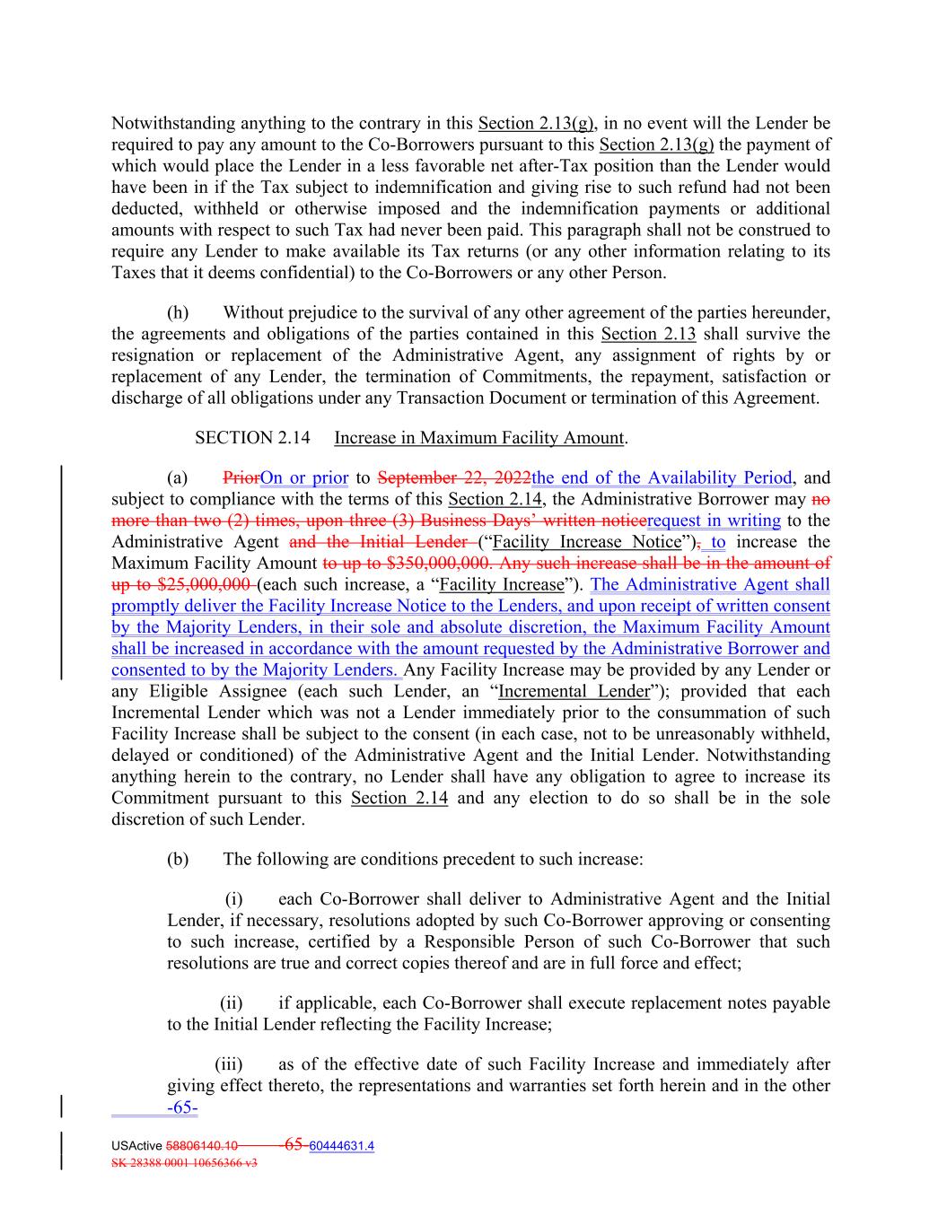 Notwithstanding anything to the contrary in this Section 2.13(g), in no event will the Lender be required to pay any amount to the Co‐Borrowers pursuant to this Section 2.13(g) the payment of which would place the Lender in a less favorable net after‐Tax position than the Lender would have been in if the Tax subject to indemnification and giving rise to such refund had not been deducted, withheld or otherwise imposed and the indemnification payments or additional amounts with respect to such Tax had never been paid. This paragraph shall not be construed to require any Lender to make available its Tax returns (or any other information relating to its Taxes that it deems confidential) to the Co‐Borrowers or any other Person. (h) Without prejudice to the survival of any other agreement of the parties hereunder, the agreements and obligations of the parties contained in this Section 2.13 shall survive the resignation or replacement of the Administrative Agent, any assignment of rights by or replacement of any Lender, the termination of Commitments, the repayment, satisfaction or discharge of all obligations under any Transaction Document or termination of this Agreement. SECTION 2.14 Increase in Maximum Facility Amount. (a) PriorOn or prior to September 22, 2022the end of the Availability Period, and subject to compliance with the terms of this Section 2.14, the Administrative Borrower may no more than two (2) times, upon three (3) Business Days’ written noticerequest in writing to the Administrative Agent and the Initial Lender (“Facility Increase Notice”), to increase the Maximum Facility Amount to up to $350,000,000. Any such increase shall be in the amount of up to $25,000,000 (each such increase, a “Facility Increase”). The Administrative Agent shall promptly deliver the Facility Increase Notice to the Lenders, and upon receipt of written consent by the Majority Lenders, in their sole and absolute discretion, the Maximum Facility Amount shall be increased in accordance with the amount requested by the Administrative Borrower and consented to by the Majority Lenders. Any Facility Increase may be provided by any Lender or any Eligible Assignee (each such Lender, an “Incremental Lender”); provided that each Incremental Lender which was not a Lender immediately prior to the consummation of such Facility Increase shall be subject to the consent (in each case, not to be unreasonably withheld, delayed or conditioned) of the Administrative Agent and the Initial Lender. Notwithstanding anything herein to the contrary, no Lender shall have any obligation to agree to increase its Commitment pursuant to this Section 2.14 and any election to do so shall be in the sole discretion of such Lender. (b) The following are conditions precedent to such increase: (i) each Co‐Borrower shall deliver to Administrative Agent and the Initial Lender, if necessary, resolutions adopted by such Co‐Borrower approving or consenting to such increase, certified by a Responsible Person of such Co‐Borrower that such resolutions are true and correct copies thereof and are in full force and effect; (ii) if applicable, each Co‐Borrower shall execute replacement notes payable to the Initial Lender reflecting the Facility Increase; (iii) as of the effective date of such Facility Increase and immediately after giving effect thereto, the representations and warranties set forth herein and in the other -65- USActive 58806140.10 -65-60444631.4 SK 28388 0001 10656366 v3