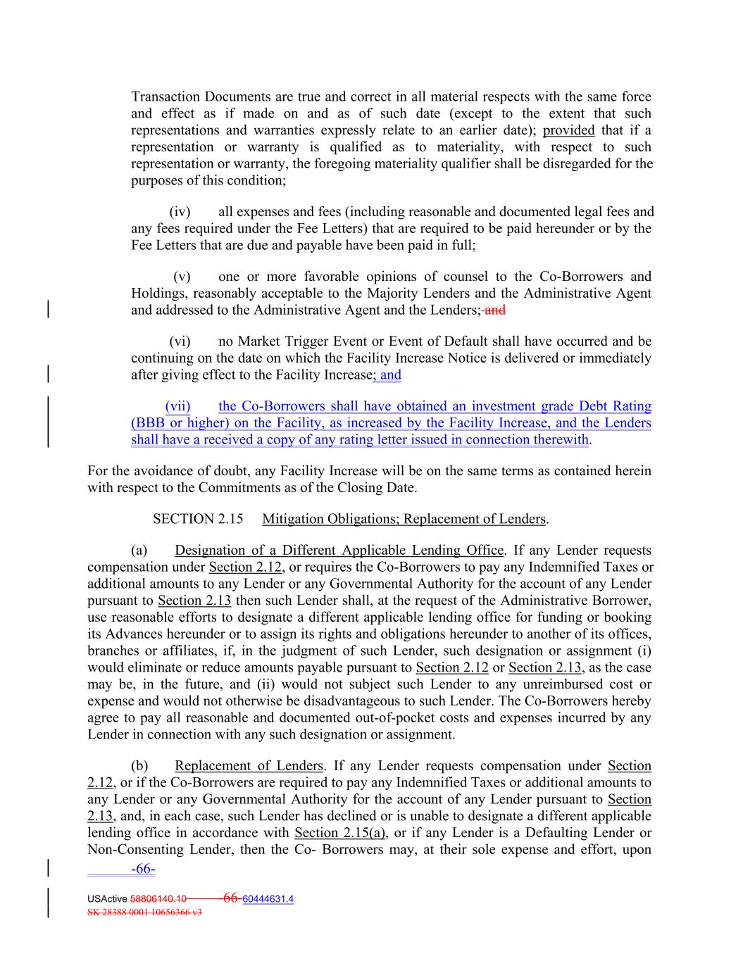 Transaction Documents are true and correct in all material respects with the same force and effect as if made on and as of such date (except to the extent that such representations and warranties expressly relate to an earlier date); provided that if a representation or warranty is qualified as to materiality, with respect to such representation or warranty, the foregoing materiality qualifier shall be disregarded for the purposes of this condition; (iv) all expenses and fees (including reasonable and documented legal fees and any fees required under the Fee Letters) that are required to be paid hereunder or by the Fee Letters that are due and payable have been paid in full; (v) one or more favorable opinions of counsel to the Co‐Borrowers and Holdings, reasonably acceptable to the Majority Lenders and the Administrative Agent and addressed to the Administrative Agent and the Lenders; and (vi) no Market Trigger Event or Event of Default shall have occurred and be continuing on the date on which the Facility Increase Notice is delivered or immediately after giving effect to the Facility Increase; and (vii) the Co-Borrowers shall have obtained an investment grade Debt Rating (BBB or higher) on the Facility, as increased by the Facility Increase, and the Lenders shall have a received a copy of any rating letter issued in connection therewith. For the avoidance of doubt, any Facility Increase will be on the same terms as contained herein with respect to the Commitments as of the Closing Date. SECTION 2.15 Mitigation Obligations; Replacement of Lenders. (a) Designation of a Different Applicable Lending Office. If any Lender requests compensation under Section 2.12, or requires the Co‐Borrowers to pay any Indemnified Taxes or additional amounts to any Lender or any Governmental Authority for the account of any Lender pursuant to Section 2.13 then such Lender shall, at the request of the Administrative Borrower, use reasonable efforts to designate a different applicable lending office for funding or booking its Advances hereunder or to assign its rights and obligations hereunder to another of its offices, branches or affiliates, if, in the judgment of such Lender, such designation or assignment (i) would eliminate or reduce amounts payable pursuant to Section 2.12 or Section 2.13, as the case may be, in the future, and (ii) would not subject such Lender to any unreimbursed cost or expense and would not otherwise be disadvantageous to such Lender. The Co‐Borrowers hereby agree to pay all reasonable and documented out‐of‐pocket costs and expenses incurred by any Lender in connection with any such designation or assignment. (b) Replacement of Lenders. If any Lender requests compensation under Section 2.12, or if the Co‐Borrowers are required to pay any Indemnified Taxes or additional amounts to any Lender or any Governmental Authority for the account of any Lender pursuant to Section 2.13, and, in each case, such Lender has declined or is unable to designate a different applicable lending office in accordance with Section 2.15(a), or if any Lender is a Defaulting Lender or Non‐Consenting Lender, then the Co‐ Borrowers may, at their sole expense and effort, upon -66- USActive 58806140.10 -66-60444631.4 SK 28388 0001 10656366 v3