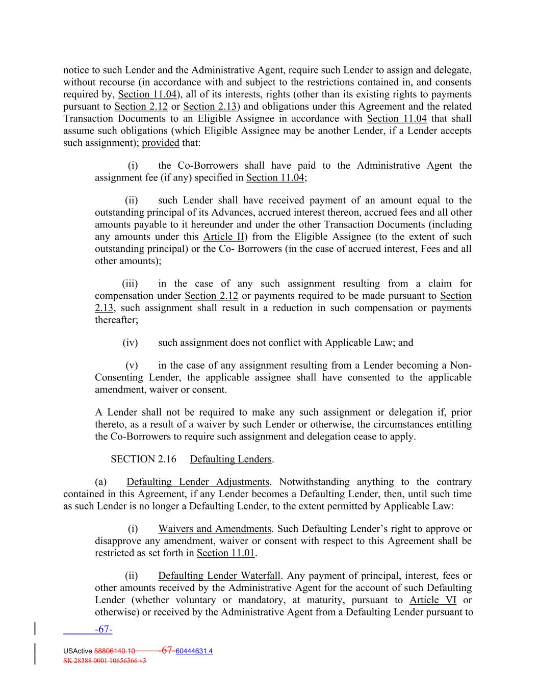 notice to such Lender and the Administrative Agent, require such Lender to assign and delegate, without recourse (in accordance with and subject to the restrictions contained in, and consents required by, Section 11.04), all of its interests, rights (other than its existing rights to payments pursuant to Section 2.12 or Section 2.13) and obligations under this Agreement and the related Transaction Documents to an Eligible Assignee in accordance with Section 11.04 that shall assume such obligations (which Eligible Assignee may be another Lender, if a Lender accepts such assignment); provided that: (i) the Co‐Borrowers shall have paid to the Administrative Agent the assignment fee (if any) specified in Section 11.04; (ii) such Lender shall have received payment of an amount equal to the outstanding principal of its Advances, accrued interest thereon, accrued fees and all other amounts payable to it hereunder and under the other Transaction Documents (including any amounts under this Article II) from the Eligible Assignee (to the extent of such outstanding principal) or the Co‐ Borrowers (in the case of accrued interest, Fees and all other amounts); (iii) in the case of any such assignment resulting from a claim for compensation under Section 2.12 or payments required to be made pursuant to Section 2.13, such assignment shall result in a reduction in such compensation or payments thereafter; (iv) such assignment does not conflict with Applicable Law; and (v) in the case of any assignment resulting from a Lender becoming a Non‐ Consenting Lender, the applicable assignee shall have consented to the applicable amendment, waiver or consent. A Lender shall not be required to make any such assignment or delegation if, prior thereto, as a result of a waiver by such Lender or otherwise, the circumstances entitling the Co‐Borrowers to require such assignment and delegation cease to apply. SECTION 2.16 Defaulting Lenders. (a) Defaulting Lender Adjustments. Notwithstanding anything to the contrary contained in this Agreement, if any Lender becomes a Defaulting Lender, then, until such time as such Lender is no longer a Defaulting Lender, to the extent permitted by Applicable Law: (i) Waivers and Amendments. Such Defaulting Lender’s right to approve or disapprove any amendment, waiver or consent with respect to this Agreement shall be restricted as set forth in Section 11.01. (ii) Defaulting Lender Waterfall. Any payment of principal, interest, fees or other amounts received by the Administrative Agent for the account of such Defaulting Lender (whether voluntary or mandatory, at maturity, pursuant to Article VI or otherwise) or received by the Administrative Agent from a Defaulting Lender pursuant to -67- USActive 58806140.10 -67-60444631.4 SK 28388 0001 10656366 v3