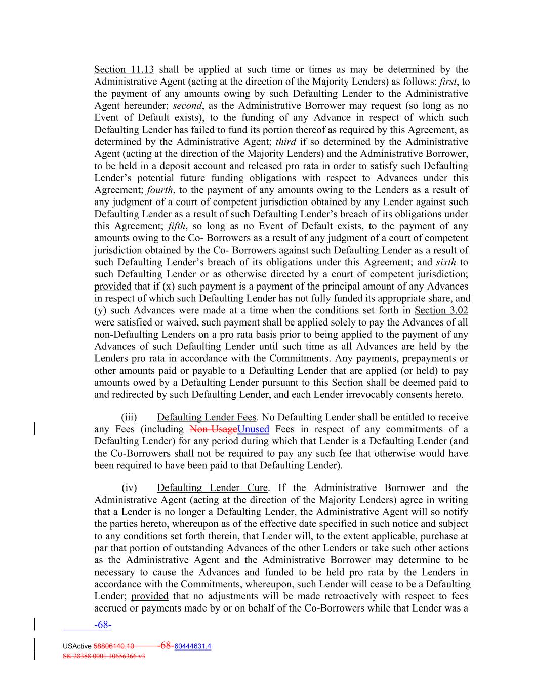 Section 11.13 shall be applied at such time or times as may be determined by the Administrative Agent (acting at the direction of the Majority Lenders) as follows: first, to the payment of any amounts owing by such Defaulting Lender to the Administrative Agent hereunder; second, as the Administrative Borrower may request (so long as no Event of Default exists), to the funding of any Advance in respect of which such Defaulting Lender has failed to fund its portion thereof as required by this Agreement, as determined by the Administrative Agent; third if so determined by the Administrative Agent (acting at the direction of the Majority Lenders) and the Administrative Borrower, to be held in a deposit account and released pro rata in order to satisfy such Defaulting Lender’s potential future funding obligations with respect to Advances under this Agreement; fourth, to the payment of any amounts owing to the Lenders as a result of any judgment of a court of competent jurisdiction obtained by any Lender against such Defaulting Lender as a result of such Defaulting Lender’s breach of its obligations under this Agreement; fifth, so long as no Event of Default exists, to the payment of any amounts owing to the Co‐ Borrowers as a result of any judgment of a court of competent jurisdiction obtained by the Co‐ Borrowers against such Defaulting Lender as a result of such Defaulting Lender’s breach of its obligations under this Agreement; and sixth to such Defaulting Lender or as otherwise directed by a court of competent jurisdiction; provided that if (x) such payment is a payment of the principal amount of any Advances in respect of which such Defaulting Lender has not fully funded its appropriate share, and (y) such Advances were made at a time when the conditions set forth in Section 3.02 were satisfied or waived, such payment shall be applied solely to pay the Advances of all non‐Defaulting Lenders on a pro rata basis prior to being applied to the payment of any Advances of such Defaulting Lender until such time as all Advances are held by the Lenders pro rata in accordance with the Commitments. Any payments, prepayments or other amounts paid or payable to a Defaulting Lender that are applied (or held) to pay amounts owed by a Defaulting Lender pursuant to this Section shall be deemed paid to and redirected by such Defaulting Lender, and each Lender irrevocably consents hereto. (iii) Defaulting Lender Fees. No Defaulting Lender shall be entitled to receive any Fees (including Non‐UsageUnused Fees in respect of any commitments of a Defaulting Lender) for any period during which that Lender is a Defaulting Lender (and the Co‐Borrowers shall not be required to pay any such fee that otherwise would have been required to have been paid to that Defaulting Lender). (iv) Defaulting Lender Cure. If the Administrative Borrower and the Administrative Agent (acting at the direction of the Majority Lenders) agree in writing that a Lender is no longer a Defaulting Lender, the Administrative Agent will so notify the parties hereto, whereupon as of the effective date specified in such notice and subject to any conditions set forth therein, that Lender will, to the extent applicable, purchase at par that portion of outstanding Advances of the other Lenders or take such other actions as the Administrative Agent and the Administrative Borrower may determine to be necessary to cause the Advances and funded to be held pro rata by the Lenders in accordance with the Commitments, whereupon, such Lender will cease to be a Defaulting Lender; provided that no adjustments will be made retroactively with respect to fees accrued or payments made by or on behalf of the Co‐Borrowers while that Lender was a -68- USActive 58806140.10 -68-60444631.4 SK 28388 0001 10656366 v3