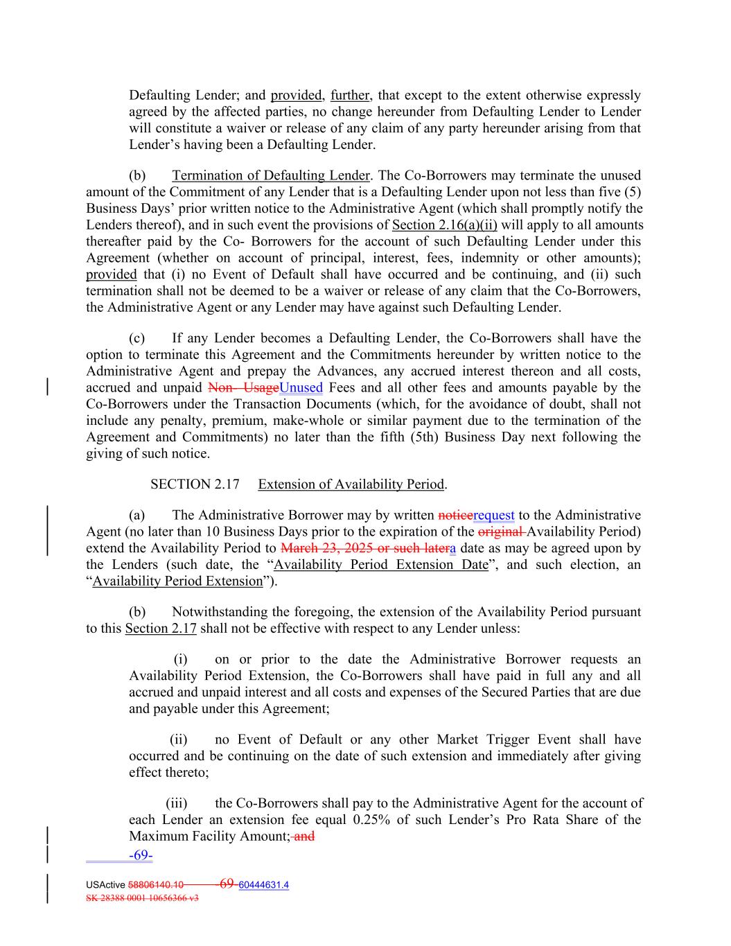 Defaulting Lender; and provided, further, that except to the extent otherwise expressly agreed by the affected parties, no change hereunder from Defaulting Lender to Lender will constitute a waiver or release of any claim of any party hereunder arising from that Lender’s having been a Defaulting Lender. (b) Termination of Defaulting Lender. The Co‐Borrowers may terminate the unused amount of the Commitment of any Lender that is a Defaulting Lender upon not less than five (5) Business Days’ prior written notice to the Administrative Agent (which shall promptly notify the Lenders thereof), and in such event the provisions of Section 2.16(a)(ii) will apply to all amounts thereafter paid by the Co‐ Borrowers for the account of such Defaulting Lender under this Agreement (whether on account of principal, interest, fees, indemnity or other amounts); provided that (i) no Event of Default shall have occurred and be continuing, and (ii) such termination shall not be deemed to be a waiver or release of any claim that the Co‐Borrowers, the Administrative Agent or any Lender may have against such Defaulting Lender. (c) If any Lender becomes a Defaulting Lender, the Co‐Borrowers shall have the option to terminate this Agreement and the Commitments hereunder by written notice to the Administrative Agent and prepay the Advances, any accrued interest thereon and all costs, accrued and unpaid Non‐ UsageUnused Fees and all other fees and amounts payable by the Co‐Borrowers under the Transaction Documents (which, for the avoidance of doubt, shall not include any penalty, premium, make‐whole or similar payment due to the termination of the Agreement and Commitments) no later than the fifth (5th) Business Day next following the giving of such notice. SECTION 2.17 Extension of Availability Period. (a) The Administrative Borrower may by written noticerequest to the Administrative Agent (no later than 10 Business Days prior to the expiration of the original Availability Period) extend the Availability Period to March 23, 2025 or such latera date as may be agreed upon by the Lenders (such date, the “Availability Period Extension Date”, and such election, an “Availability Period Extension”). (b) Notwithstanding the foregoing, the extension of the Availability Period pursuant to this Section 2.17 shall not be effective with respect to any Lender unless: (i) on or prior to the date the Administrative Borrower requests an Availability Period Extension, the Co‐Borrowers shall have paid in full any and all accrued and unpaid interest and all costs and expenses of the Secured Parties that are due and payable under this Agreement; (ii) no Event of Default or any other Market Trigger Event shall have occurred and be continuing on the date of such extension and immediately after giving effect thereto; (iii) the Co‐Borrowers shall pay to the Administrative Agent for the account of each Lender an extension fee equal 0.25% of such Lender’s Pro Rata Share of the Maximum Facility Amount; and -69- USActive 58806140.10 -69-60444631.4 SK 28388 0001 10656366 v3