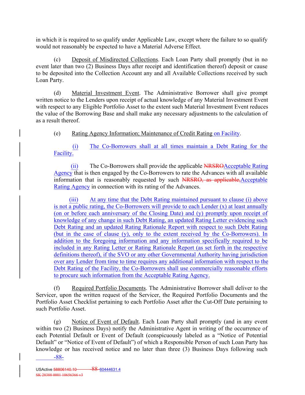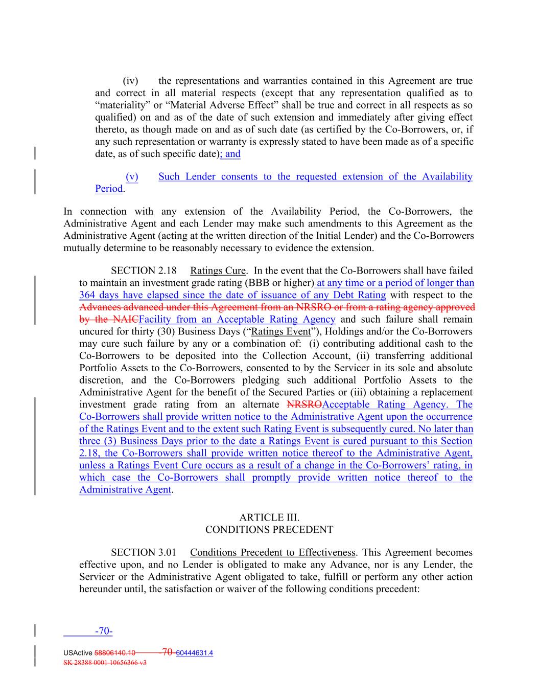 (iv) the representations and warranties contained in this Agreement are true and correct in all material respects (except that any representation qualified as to “materiality” or “Material Adverse Effect” shall be true and correct in all respects as so qualified) on and as of the date of such extension and immediately after giving effect thereto, as though made on and as of such date (as certified by the Co‐Borrowers, or, if any such representation or warranty is expressly stated to have been made as of a specific date, as of such specific date); and (v) Such Lender consents to the requested extension of the Availability Period. In connection with any extension of the Availability Period, the Co‐Borrowers, the Administrative Agent and each Lender may make such amendments to this Agreement as the Administrative Agent (acting at the written direction of the Initial Lender) and the Co‐Borrowers mutually determine to be reasonably necessary to evidence the extension. SECTION 2.18 Ratings Cure. In the event that the Co-Borrowers shall have failed to maintain an investment grade rating (BBB or higher) at any time or a period of longer than 364 days have elapsed since the date of issuance of any Debt Rating with respect to the Advances advanced under this Agreement from an NRSRO or from a rating agency approved by the NAICFacility from an Acceptable Rating Agency and such failure shall remain uncured for thirty (30) Business Days (“Ratings Event”), Holdings and/or the Co-Borrowers may cure such failure by any or a combination of: (i) contributing additional cash to the Co-Borrowers to be deposited into the Collection Account, (ii) transferring additional Portfolio Assets to the Co-Borrowers, consented to by the Servicer in its sole and absolute discretion, and the Co-Borrowers pledging such additional Portfolio Assets to the Administrative Agent for the benefit of the Secured Parties or (iii) obtaining a replacement investment grade rating from an alternate NRSROAcceptable Rating Agency. The Co-Borrowers shall provide written notice to the Administrative Agent upon the occurrence of the Ratings Event and to the extent such Rating Event is subsequently cured. No later than three (3) Business Days prior to the date a Ratings Event is cured pursuant to this Section 2.18, the Co-Borrowers shall provide written notice thereof to the Administrative Agent, unless a Ratings Event Cure occurs as a result of a change in the Co-Borrowers’ rating, in which case the Co-Borrowers shall promptly provide written notice thereof to the Administrative Agent. ARTICLE III. CONDITIONS PRECEDENT SECTION 3.01 Conditions Precedent to Effectiveness. This Agreement becomes effective upon, and no Lender is obligated to make any Advance, nor is any Lender, the Servicer or the Administrative Agent obligated to take, fulfill or perform any other action hereunder until, the satisfaction or waiver of the following conditions precedent: -70- USActive 58806140.10 -70-60444631.4 SK 28388 0001 10656366 v3