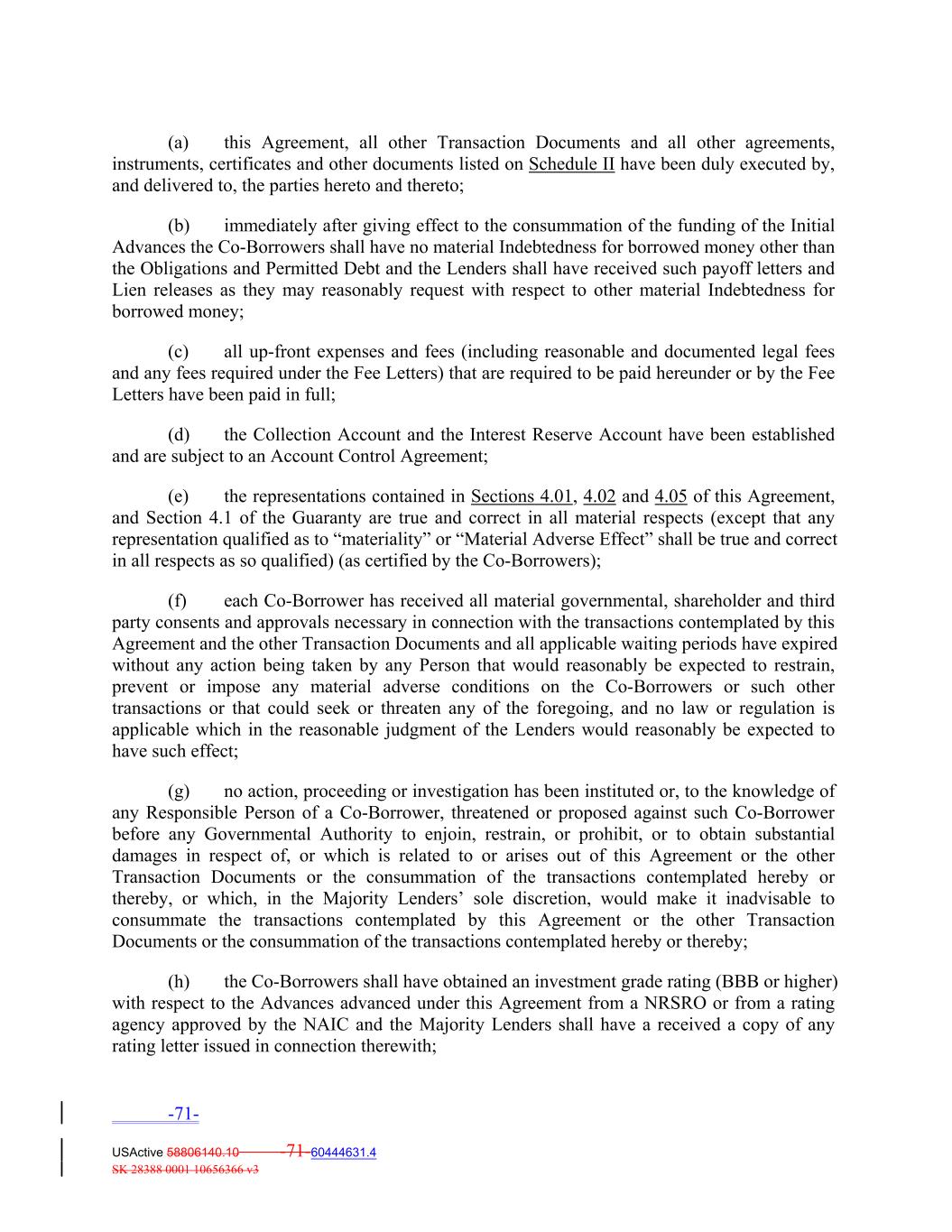 (a) this Agreement, all other Transaction Documents and all other agreements, instruments, certificates and other documents listed on Schedule II have been duly executed by, and delivered to, the parties hereto and thereto; (b) immediately after giving effect to the consummation of the funding of the Initial Advances the Co‐Borrowers shall have no material Indebtedness for borrowed money other than the Obligations and Permitted Debt and the Lenders shall have received such payoff letters and Lien releases as they may reasonably request with respect to other material Indebtedness for borrowed money; (c) all up‐front expenses and fees (including reasonable and documented legal fees and any fees required under the Fee Letters) that are required to be paid hereunder or by the Fee Letters have been paid in full; (d) the Collection Account and the Interest Reserve Account have been established and are subject to an Account Control Agreement; (e) the representations contained in Sections 4.01, 4.02 and 4.05 of this Agreement, and Section 4.1 of the Guaranty are true and correct in all material respects (except that any representation qualified as to “materiality” or “Material Adverse Effect” shall be true and correct in all respects as so qualified) (as certified by the Co‐Borrowers); (f) each Co‐Borrower has received all material governmental, shareholder and third party consents and approvals necessary in connection with the transactions contemplated by this Agreement and the other Transaction Documents and all applicable waiting periods have expired without any action being taken by any Person that would reasonably be expected to restrain, prevent or impose any material adverse conditions on the Co‐Borrowers or such other transactions or that could seek or threaten any of the foregoing, and no law or regulation is applicable which in the reasonable judgment of the Lenders would reasonably be expected to have such effect; (g) no action, proceeding or investigation has been instituted or, to the knowledge of any Responsible Person of a Co‐Borrower, threatened or proposed against such Co‐Borrower before any Governmental Authority to enjoin, restrain, or prohibit, or to obtain substantial damages in respect of, or which is related to or arises out of this Agreement or the other Transaction Documents or the consummation of the transactions contemplated hereby or thereby, or which, in the Majority Lenders’ sole discretion, would make it inadvisable to consummate the transactions contemplated by this Agreement or the other Transaction Documents or the consummation of the transactions contemplated hereby or thereby; (h) the Co‐Borrowers shall have obtained an investment grade rating (BBB or higher) with respect to the Advances advanced under this Agreement from a NRSRO or from a rating agency approved by the NAIC and the Majority Lenders shall have a received a copy of any rating letter issued in connection therewith; -71- USActive 58806140.10 -71-60444631.4 SK 28388 0001 10656366 v3