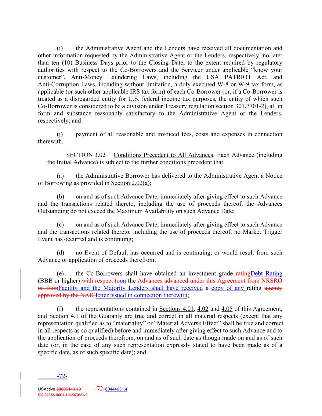 (i) the Administrative Agent and the Lenders have received all documentation and other information requested by the Administrative Agent or the Lenders, respectively, no later than ten (10) Business Days prior to the Closing Date, to the extent required by regulatory authorities with respect to the Co‐Borrowers and the Servicer under applicable “know your customer”, Anti‐Money Laundering Laws, including the USA PATRIOT Act, and Anti‐Corruption Laws, including without limitation, a duly executed W‐8 or W‐9 tax form, as applicable (or such other applicable IRS tax form) of each Co‐Borrower (or, if a Co‐Borrower is treated as a disregarded entity for U.S. federal income tax purposes, the entity of which such Co‐Borrower is considered to be a division under Treasury regulation section 301.7701‐2), all in form and substance reasonably satisfactory to the Administrative Agent or the Lenders, respectively; and (j) payment of all reasonable and invoiced fees, costs and expenses in connection therewith. SECTION 3.02 Conditions Precedent to All Advances. Each Advance (including the Initial Advance) is subject to the further conditions precedent that: (a) the Administrative Borrower has delivered to the Administrative Agent a Notice of Borrowing as provided in Section 2.02(a); (b) on and as of such Advance Date, immediately after giving effect to such Advance and the transactions related thereto, including the use of proceeds thereof, the Advances Outstanding do not exceed the Maximum Availability on such Advance Date; (c) on and as of such Advance Date, immediately after giving effect to such Advance and the transactions related thereto, including the use of proceeds thereof, no Market Trigger Event has occurred and is continuing; (d) no Event of Default has occurred and is continuing, or would result from such Advance or application of proceeds therefrom; (e) the Co‐Borrowers shall have obtained an investment grade ratingDebt Rating (BBB or higher) with respect toon the Advances advanced under this Agreement from NRSRO or fromFacility and the Majority Lenders shall have received a copy of any rating agency approved by the NAICletter issued in connection therewith; (f) the representations contained in Sections 4.01, 4.02 and 4.05 of this Agreement, and Section 4.1 of the Guaranty are true and correct in all material respects (except that any representation qualified as to “materiality” or “Material Adverse Effect” shall be true and correct in all respects as so qualified) before and immediately after giving effect to such Advance and to the application of proceeds therefrom, on and as of such date as though made on and as of such date (or, in the case of any such representation expressly stated to have been made as of a specific date, as of such specific date); and -72- USActive 58806140.10 -72-60444631.4 SK 28388 0001 10656366 v3