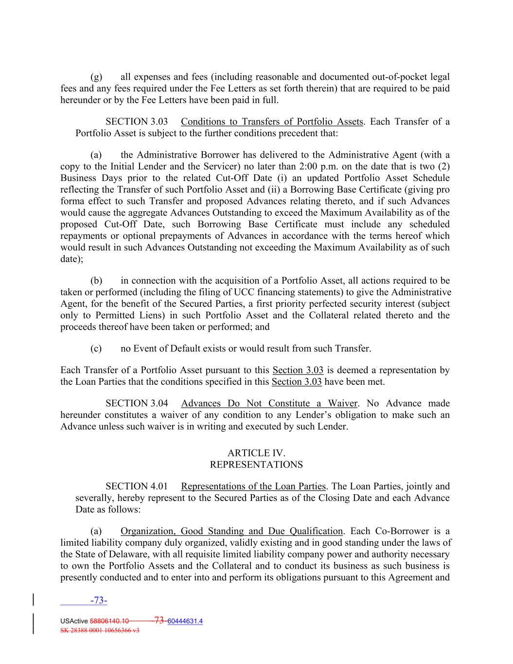 (g) all expenses and fees (including reasonable and documented out‐of‐pocket legal fees and any fees required under the Fee Letters as set forth therein) that are required to be paid hereunder or by the Fee Letters have been paid in full. SECTION 3.03 Conditions to Transfers of Portfolio Assets. Each Transfer of a Portfolio Asset is subject to the further conditions precedent that: (a) the Administrative Borrower has delivered to the Administrative Agent (with a copy to the Initial Lender and the Servicer) no later than 2:00 p.m. on the date that is two (2) Business Days prior to the related Cut‐Off Date (i) an updated Portfolio Asset Schedule reflecting the Transfer of such Portfolio Asset and (ii) a Borrowing Base Certificate (giving pro forma effect to such Transfer and proposed Advances relating thereto, and if such Advances would cause the aggregate Advances Outstanding to exceed the Maximum Availability as of the proposed Cut‐Off Date, such Borrowing Base Certificate must include any scheduled repayments or optional prepayments of Advances in accordance with the terms hereof which would result in such Advances Outstanding not exceeding the Maximum Availability as of such date); (b) in connection with the acquisition of a Portfolio Asset, all actions required to be taken or performed (including the filing of UCC financing statements) to give the Administrative Agent, for the benefit of the Secured Parties, a first priority perfected security interest (subject only to Permitted Liens) in such Portfolio Asset and the Collateral related thereto and the proceeds thereof have been taken or performed; and (c) no Event of Default exists or would result from such Transfer. Each Transfer of a Portfolio Asset pursuant to this Section 3.03 is deemed a representation by the Loan Parties that the conditions specified in this Section 3.03 have been met. SECTION 3.04 Advances Do Not Constitute a Waiver. No Advance made hereunder constitutes a waiver of any condition to any Lender’s obligation to make such an Advance unless such waiver is in writing and executed by such Lender. ARTICLE IV. REPRESENTATIONS SECTION 4.01 Representations of the Loan Parties. The Loan Parties, jointly and severally, hereby represent to the Secured Parties as of the Closing Date and each Advance Date as follows: (a) Organization, Good Standing and Due Qualification. Each Co‐Borrower is a limited liability company duly organized, validly existing and in good standing under the laws of the State of Delaware, with all requisite limited liability company power and authority necessary to own the Portfolio Assets and the Collateral and to conduct its business as such business is presently conducted and to enter into and perform its obligations pursuant to this Agreement and -73- USActive 58806140.10 -73-60444631.4 SK 28388 0001 10656366 v3
