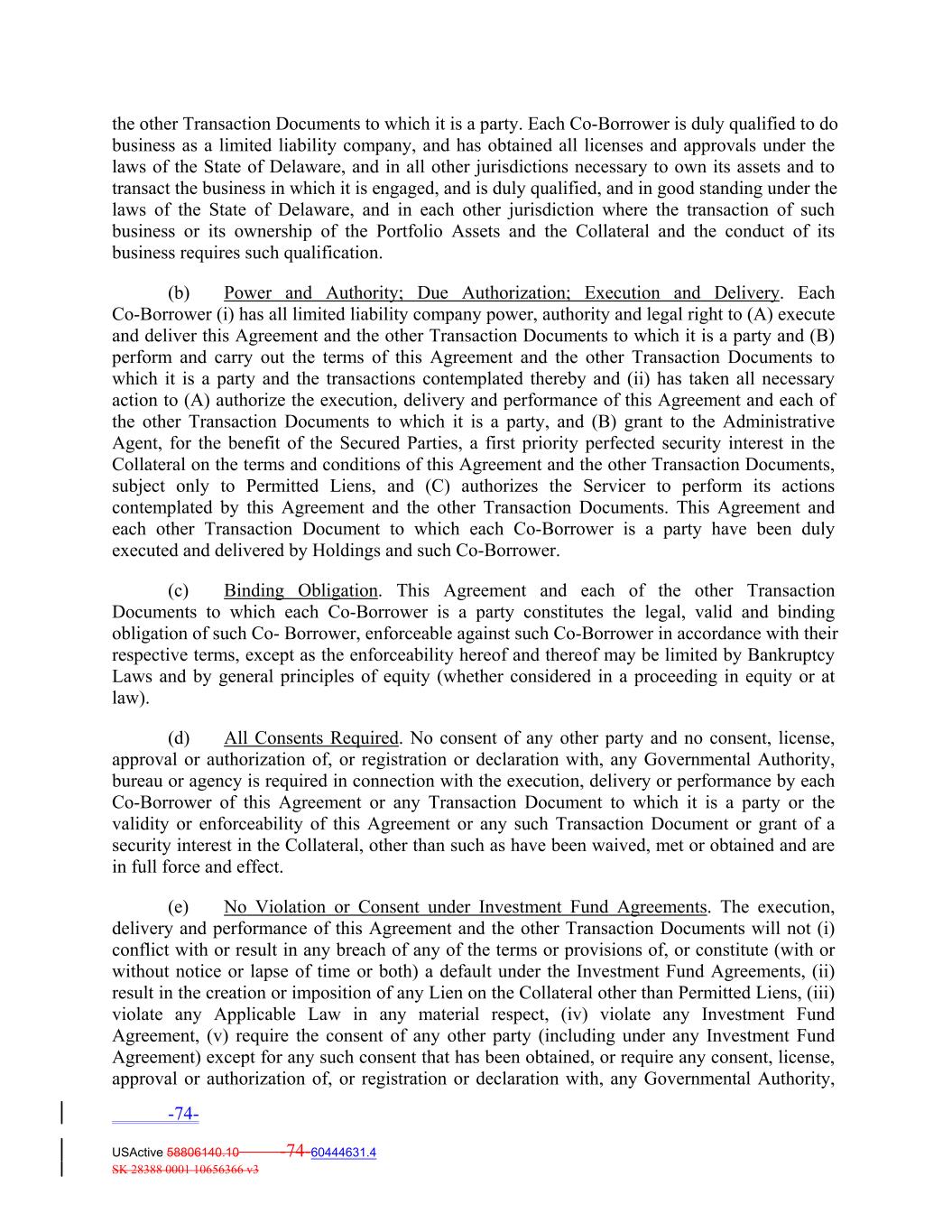 the other Transaction Documents to which it is a party. Each Co‐Borrower is duly qualified to do business as a limited liability company, and has obtained all licenses and approvals under the laws of the State of Delaware, and in all other jurisdictions necessary to own its assets and to transact the business in which it is engaged, and is duly qualified, and in good standing under the laws of the State of Delaware, and in each other jurisdiction where the transaction of such business or its ownership of the Portfolio Assets and the Collateral and the conduct of its business requires such qualification. (b) Power and Authority; Due Authorization; Execution and Delivery. Each Co‐Borrower (i) has all limited liability company power, authority and legal right to (A) execute and deliver this Agreement and the other Transaction Documents to which it is a party and (B) perform and carry out the terms of this Agreement and the other Transaction Documents to which it is a party and the transactions contemplated thereby and (ii) has taken all necessary action to (A) authorize the execution, delivery and performance of this Agreement and each of the other Transaction Documents to which it is a party, and (B) grant to the Administrative Agent, for the benefit of the Secured Parties, a first priority perfected security interest in the Collateral on the terms and conditions of this Agreement and the other Transaction Documents, subject only to Permitted Liens, and (C) authorizes the Servicer to perform its actions contemplated by this Agreement and the other Transaction Documents. This Agreement and each other Transaction Document to which each Co‐Borrower is a party have been duly executed and delivered by Holdings and such Co‐Borrower. (c) Binding Obligation. This Agreement and each of the other Transaction Documents to which each Co‐Borrower is a party constitutes the legal, valid and binding obligation of such Co‐ Borrower, enforceable against such Co‐Borrower in accordance with their respective terms, except as the enforceability hereof and thereof may be limited by Bankruptcy Laws and by general principles of equity (whether considered in a proceeding in equity or at law). (d) All Consents Required. No consent of any other party and no consent, license, approval or authorization of, or registration or declaration with, any Governmental Authority, bureau or agency is required in connection with the execution, delivery or performance by each Co‐Borrower of this Agreement or any Transaction Document to which it is a party or the validity or enforceability of this Agreement or any such Transaction Document or grant of a security interest in the Collateral, other than such as have been waived, met or obtained and are in full force and effect. (e) No Violation or Consent under Investment Fund Agreements. The execution, delivery and performance of this Agreement and the other Transaction Documents will not (i) conflict with or result in any breach of any of the terms or provisions of, or constitute (with or without notice or lapse of time or both) a default under the Investment Fund Agreements, (ii) result in the creation or imposition of any Lien on the Collateral other than Permitted Liens, (iii) violate any Applicable Law in any material respect, (iv) violate any Investment Fund Agreement, (v) require the consent of any other party (including under any Investment Fund Agreement) except for any such consent that has been obtained, or require any consent, license, approval or authorization of, or registration or declaration with, any Governmental Authority, -74- USActive 58806140.10 -74-60444631.4 SK 28388 0001 10656366 v3