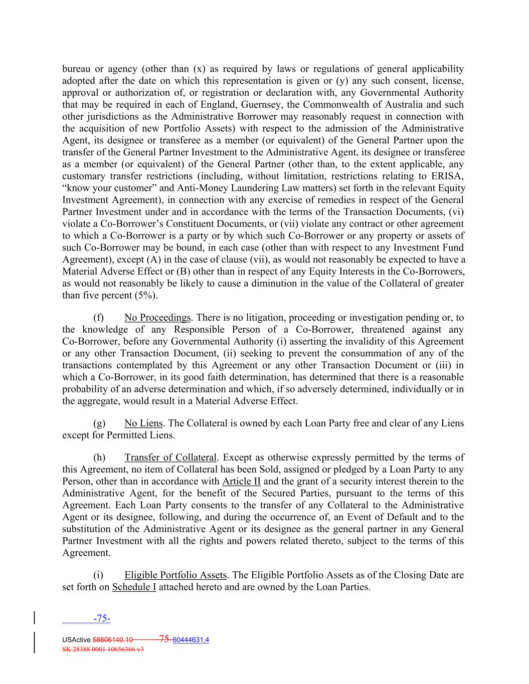 bureau or agency (other than (x) as required by laws or regulations of general applicability adopted after the date on which this representation is given or (y) any such consent, license, approval or authorization of, or registration or declaration with, any Governmental Authority that may be required in each of England, Guernsey, the Commonwealth of Australia and such other jurisdictions as the Administrative Borrower may reasonably request in connection with the acquisition of new Portfolio Assets) with respect to the admission of the Administrative Agent, its designee or transferee as a member (or equivalent) of the General Partner upon the transfer of the General Partner Investment to the Administrative Agent, its designee or transferee as a member (or equivalent) of the General Partner (other than, to the extent applicable, any customary transfer restrictions (including, without limitation, restrictions relating to ERISA, “know your customer” and Anti‐Money Laundering Law matters) set forth in the relevant Equity Investment Agreement), in connection with any exercise of remedies in respect of the General Partner Investment under and in accordance with the terms of the Transaction Documents, (vi) violate a Co‐Borrower’s Constituent Documents, or (vii) violate any contract or other agreement to which a Co‐Borrower is a party or by which such Co‐Borrower or any property or assets of such Co‐Borrower may be bound, in each case (other than with respect to any Investment Fund Agreement), except (A) in the case of clause (vii), as would not reasonably be expected to have a Material Adverse Effect or (B) other than in respect of any Equity Interests in the Co‐Borrowers, as would not reasonably be likely to cause a diminution in the value of the Collateral of greater than five percent (5%). (f) No Proceedings. There is no litigation, proceeding or investigation pending or, to the knowledge of any Responsible Person of a Co‐Borrower, threatened against any Co‐Borrower, before any Governmental Authority (i) asserting the invalidity of this Agreement or any other Transaction Document, (ii) seeking to prevent the consummation of any of the transactions contemplated by this Agreement or any other Transaction Document or (iii) in which a Co‐Borrower, in its good faith determination, has determined that there is a reasonable probability of an adverse determination and which, if so adversely determined, individually or in the aggregate, would result in a Material Adverse Effect. (g) No Liens. The Collateral is owned by each Loan Party free and clear of any Liens except for Permitted Liens. (h) Transfer of Collateral. Except as otherwise expressly permitted by the terms of this Agreement, no item of Collateral has been Sold, assigned or pledged by a Loan Party to any Person, other than in accordance with Article II and the grant of a security interest therein to the Administrative Agent, for the benefit of the Secured Parties, pursuant to the terms of this Agreement. Each Loan Party consents to the transfer of any Collateral to the Administrative Agent or its designee, following, and during the occurrence of, an Event of Default and to the substitution of the Administrative Agent or its designee as the general partner in any General Partner Investment with all the rights and powers related thereto, subject to the terms of this Agreement. (i) Eligible Portfolio Assets. The Eligible Portfolio Assets as of the Closing Date are set forth on Schedule I attached hereto and are owned by the Loan Parties. -75- USActive 58806140.10 -75-60444631.4 SK 28388 0001 10656366 v3