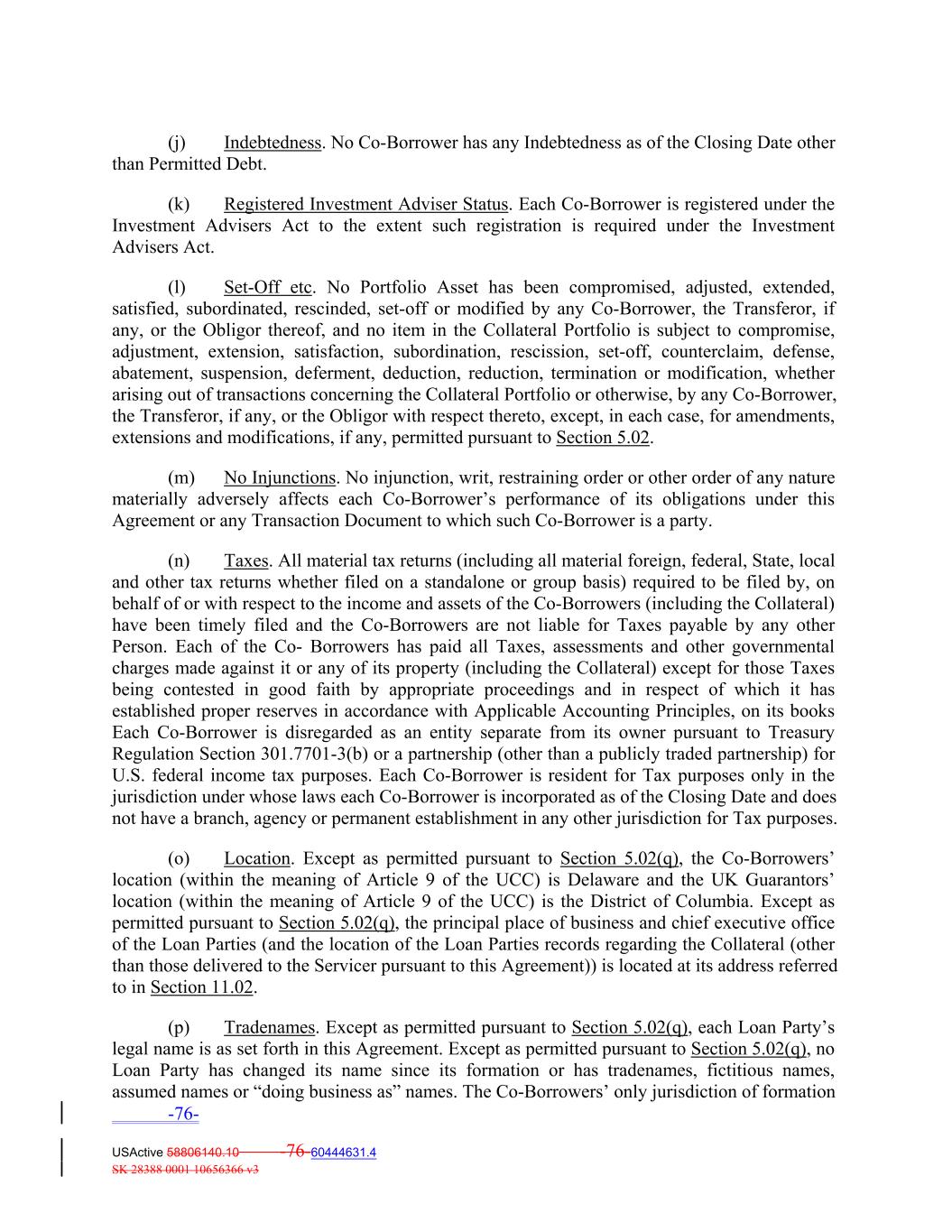 (j) Indebtedness. No Co‐Borrower has any Indebtedness as of the Closing Date other than Permitted Debt. (k) Registered Investment Adviser Status. Each Co‐Borrower is registered under the Investment Advisers Act to the extent such registration is required under the Investment Advisers Act. (l) Set‐Off etc. No Portfolio Asset has been compromised, adjusted, extended, satisfied, subordinated, rescinded, set‐off or modified by any Co‐Borrower, the Transferor, if any, or the Obligor thereof, and no item in the Collateral Portfolio is subject to compromise, adjustment, extension, satisfaction, subordination, rescission, set‐off, counterclaim, defense, abatement, suspension, deferment, deduction, reduction, termination or modification, whether arising out of transactions concerning the Collateral Portfolio or otherwise, by any Co‐Borrower, the Transferor, if any, or the Obligor with respect thereto, except, in each case, for amendments, extensions and modifications, if any, permitted pursuant to Section 5.02. (m) No Injunctions. No injunction, writ, restraining order or other order of any nature materially adversely affects each Co‐Borrower’s performance of its obligations under this Agreement or any Transaction Document to which such Co‐Borrower is a party. (n) Taxes. All material tax returns (including all material foreign, federal, State, local and other tax returns whether filed on a standalone or group basis) required to be filed by, on behalf of or with respect to the income and assets of the Co‐Borrowers (including the Collateral) have been timely filed and the Co‐Borrowers are not liable for Taxes payable by any other Person. Each of the Co‐ Borrowers has paid all Taxes, assessments and other governmental charges made against it or any of its property (including the Collateral) except for those Taxes being contested in good faith by appropriate proceedings and in respect of which it has established proper reserves in accordance with Applicable Accounting Principles, on its books Each Co‐Borrower is disregarded as an entity separate from its owner pursuant to Treasury Regulation Section 301.7701‐3(b) or a partnership (other than a publicly traded partnership) for U.S. federal income tax purposes. Each Co‐Borrower is resident for Tax purposes only in the jurisdiction under whose laws each Co‐Borrower is incorporated as of the Closing Date and does not have a branch, agency or permanent establishment in any other jurisdiction for Tax purposes. (o) Location. Except as permitted pursuant to Section 5.02(q), the Co‐Borrowers’ location (within the meaning of Article 9 of the UCC) is Delaware and the UK Guarantors’ location (within the meaning of Article 9 of the UCC) is the District of Columbia. Except as permitted pursuant to Section 5.02(q), the principal place of business and chief executive office of the Loan Parties (and the location of the Loan Parties records regarding the Collateral (other than those delivered to the Servicer pursuant to this Agreement)) is located at its address referred to in Section 11.02. (p) Tradenames. Except as permitted pursuant to Section 5.02(q), each Loan Party’s legal name is as set forth in this Agreement. Except as permitted pursuant to Section 5.02(q), no Loan Party has changed its name since its formation or has tradenames, fictitious names, assumed names or “doing business as” names. The Co‐Borrowers’ only jurisdiction of formation -76- USActive 58806140.10 -76-60444631.4 SK 28388 0001 10656366 v3