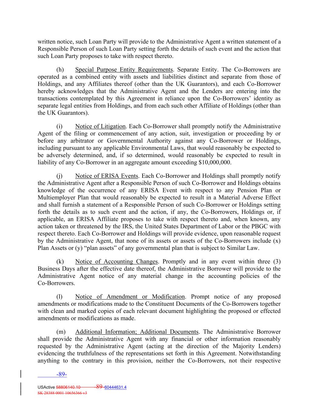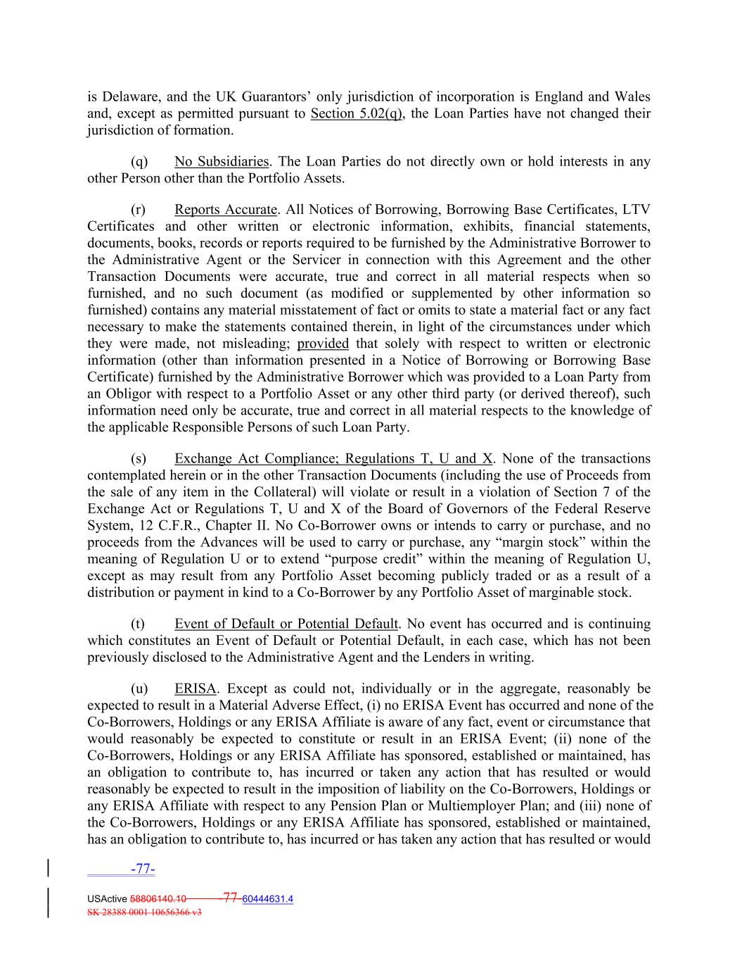 is Delaware, and the UK Guarantors’ only jurisdiction of incorporation is England and Wales and, except as permitted pursuant to Section 5.02(q), the Loan Parties have not changed their jurisdiction of formation. (q) No Subsidiaries. The Loan Parties do not directly own or hold interests in any other Person other than the Portfolio Assets. (r) Reports Accurate. All Notices of Borrowing, Borrowing Base Certificates, LTV Certificates and other written or electronic information, exhibits, financial statements, documents, books, records or reports required to be furnished by the Administrative Borrower to the Administrative Agent or the Servicer in connection with this Agreement and the other Transaction Documents were accurate, true and correct in all material respects when so furnished, and no such document (as modified or supplemented by other information so furnished) contains any material misstatement of fact or omits to state a material fact or any fact necessary to make the statements contained therein, in light of the circumstances under which they were made, not misleading; provided that solely with respect to written or electronic information (other than information presented in a Notice of Borrowing or Borrowing Base Certificate) furnished by the Administrative Borrower which was provided to a Loan Party from an Obligor with respect to a Portfolio Asset or any other third party (or derived thereof), such information need only be accurate, true and correct in all material respects to the knowledge of the applicable Responsible Persons of such Loan Party. (s) Exchange Act Compliance; Regulations T, U and X. None of the transactions contemplated herein or in the other Transaction Documents (including the use of Proceeds from the sale of any item in the Collateral) will violate or result in a violation of Section 7 of the Exchange Act or Regulations T, U and X of the Board of Governors of the Federal Reserve System, 12 C.F.R., Chapter II. No Co‐Borrower owns or intends to carry or purchase, and no proceeds from the Advances will be used to carry or purchase, any “margin stock” within the meaning of Regulation U or to extend “purpose credit” within the meaning of Regulation U, except as may result from any Portfolio Asset becoming publicly traded or as a result of a distribution or payment in kind to a Co‐Borrower by any Portfolio Asset of marginable stock. (t) Event of Default or Potential Default. No event has occurred and is continuing which constitutes an Event of Default or Potential Default, in each case, which has not been previously disclosed to the Administrative Agent and the Lenders in writing. (u) ERISA. Except as could not, individually or in the aggregate, reasonably be expected to result in a Material Adverse Effect, (i) no ERISA Event has occurred and none of the Co‐Borrowers, Holdings or any ERISA Affiliate is aware of any fact, event or circumstance that would reasonably be expected to constitute or result in an ERISA Event; (ii) none of the Co‐Borrowers, Holdings or any ERISA Affiliate has sponsored, established or maintained, has an obligation to contribute to, has incurred or taken any action that has resulted or would reasonably be expected to result in the imposition of liability on the Co‐Borrowers, Holdings or any ERISA Affiliate with respect to any Pension Plan or Multiemployer Plan; and (iii) none of the Co‐Borrowers, Holdings or any ERISA Affiliate has sponsored, established or maintained, has an obligation to contribute to, has incurred or has taken any action that has resulted or would -77- USActive 58806140.10 -77-60444631.4 SK 28388 0001 10656366 v3