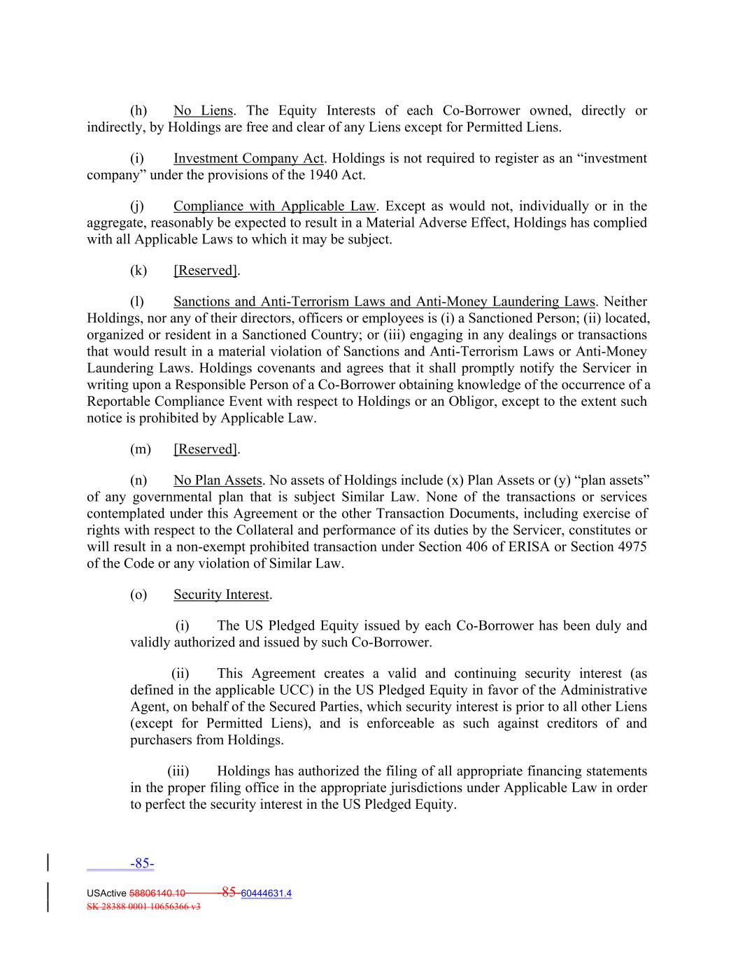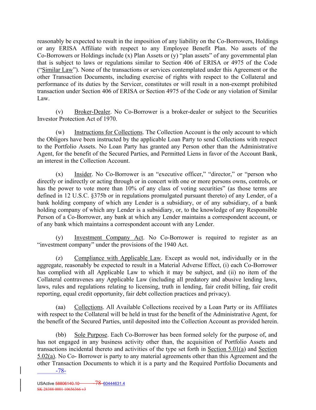 reasonably be expected to result in the imposition of any liability on the Co‐Borrowers, Holdings or any ERISA Affiliate with respect to any Employee Benefit Plan. No assets of the Co‐Borrowers or Holdings include (x) Plan Assets or (y) “plan assets” of any governmental plan that is subject to laws or regulations similar to Section 406 of ERISA or 4975 of the Code (“Similar Law”). None of the transactions or services contemplated under this Agreement or the other Transaction Documents, including exercise of rights with respect to the Collateral and performance of its duties by the Servicer, constitutes or will result in a non‐exempt prohibited transaction under Section 406 of ERISA or Section 4975 of the Code or any violation of Similar Law. (v) Broker‐Dealer. No Co‐Borrower is a broker‐dealer or subject to the Securities Investor Protection Act of 1970. (w) Instructions for Collections. The Collection Account is the only account to which the Obligors have been instructed by the applicable Loan Party to send Collections with respect to the Portfolio Assets. No Loan Party has granted any Person other than the Administrative Agent, for the benefit of the Secured Parties, and Permitted Liens in favor of the Account Bank, an interest in the Collection Account. (x) Insider. No Co‐Borrower is an “executive officer,” “director,” or “person who directly or indirectly or acting through or in concert with one or more persons owns, controls, or has the power to vote more than 10% of any class of voting securities” (as those terms are defined in 12 U.S.C. §375b or in regulations promulgated pursuant thereto) of any Lender, of a bank holding company of which any Lender is a subsidiary, or of any subsidiary, of a bank holding company of which any Lender is a subsidiary, or, to the knowledge of any Responsible Person of a Co‐Borrower, any bank at which any Lender maintains a correspondent account, or of any bank which maintains a correspondent account with any Lender. (y) Investment Company Act. No Co‐Borrower is required to register as an “investment company” under the provisions of the 1940 Act. (z) Compliance with Applicable Law. Except as would not, individually or in the aggregate, reasonably be expected to result in a Material Adverse Effect, (i) each Co‐Borrower has complied with all Applicable Law to which it may be subject, and (ii) no item of the Collateral contravenes any Applicable Law (including all predatory and abusive lending laws, laws, rules and regulations relating to licensing, truth in lending, fair credit billing, fair credit reporting, equal credit opportunity, fair debt collection practices and privacy). (aa) Collections. All Available Collections received by a Loan Party or its Affiliates with respect to the Collateral will be held in trust for the benefit of the Administrative Agent, for the benefit of the Secured Parties, until deposited into the Collection Account as provided herein. (bb) Sole Purpose. Each Co‐Borrower has been formed solely for the purpose of, and has not engaged in any business activity other than, the acquisition of Portfolio Assets and transactions incidental thereto and activities of the type set forth in Section 5.01(a) and Section 5.02(a). No Co‐ Borrower is party to any material agreements other than this Agreement and the other Transaction Documents to which it is a party and the Required Portfolio Documents and -78- USActive 58806140.10 -78-60444631.4 SK 28388 0001 10656366 v3