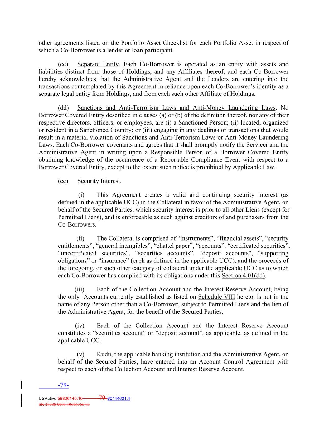 other agreements listed on the Portfolio Asset Checklist for each Portfolio Asset in respect of which a Co‐Borrower is a lender or loan participant. (cc) Separate Entity. Each Co‐Borrower is operated as an entity with assets and liabilities distinct from those of Holdings, and any Affiliates thereof, and each Co‐Borrower hereby acknowledges that the Administrative Agent and the Lenders are entering into the transactions contemplated by this Agreement in reliance upon each Co‐Borrower’s identity as a separate legal entity from Holdings, and from each such other Affiliate of Holdings. (dd) Sanctions and Anti‐Terrorism Laws and Anti‐Money Laundering Laws. No Borrower Covered Entity described in clauses (a) or (b) of the definition thereof, nor any of their respective directors, officers, or employees, are (i) a Sanctioned Person; (ii) located, organized or resident in a Sanctioned Country; or (iii) engaging in any dealings or transactions that would result in a material violation of Sanctions and Anti‐Terrorism Laws or Anti‐Money Laundering Laws. Each Co‐Borrower covenants and agrees that it shall promptly notify the Servicer and the Administrative Agent in writing upon a Responsible Person of a Borrower Covered Entity obtaining knowledge of the occurrence of a Reportable Compliance Event with respect to a Borrower Covered Entity, except to the extent such notice is prohibited by Applicable Law. (ee) Security Interest. (i) This Agreement creates a valid and continuing security interest (as defined in the applicable UCC) in the Collateral in favor of the Administrative Agent, on behalf of the Secured Parties, which security interest is prior to all other Liens (except for Permitted Liens), and is enforceable as such against creditors of and purchasers from the Co‐Borrowers. (ii) The Collateral is comprised of “instruments”, “financial assets”, “security entitlements”, “general intangibles”, “chattel paper”, “accounts”, “certificated securities”, “uncertificated securities”, “securities accounts”, “deposit accounts”, “supporting obligations” or “insurance” (each as defined in the applicable UCC), and the proceeds of the foregoing, or such other category of collateral under the applicable UCC as to which each Co‐Borrower has complied with its obligations under this Section 4.01(dd). (iii) Each of the Collection Account and the Interest Reserve Account, being the only Accounts currently established as listed on Schedule VIII hereto, is not in the name of any Person other than a Co-Borrower, subject to Permitted Liens and the lien of the Administrative Agent, for the benefit of the Secured Parties. (iv) Each of the Collection Account and the Interest Reserve Account constitutes a “securities account” or “deposit account”, as applicable, as defined in the applicable UCC. (v) Kudu, the applicable banking institution and the Administrative Agent, on behalf of the Secured Parties, have entered into an Account Control Agreement with respect to each of the Collection Account and Interest Reserve Account. -79- USActive 58806140.10 -79-60444631.4 SK 28388 0001 10656366 v3